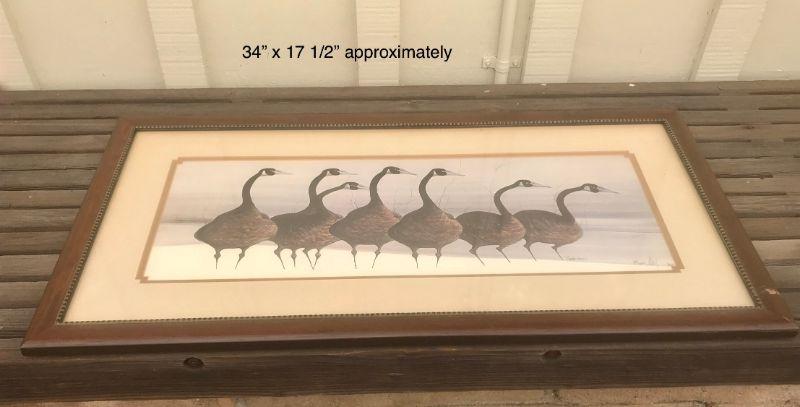 Large 1982 Limited Edition Print #978 0f 1000, signed by artist P. BUCKLEY MOSS "gaggle of geese" framed 34" x 17"