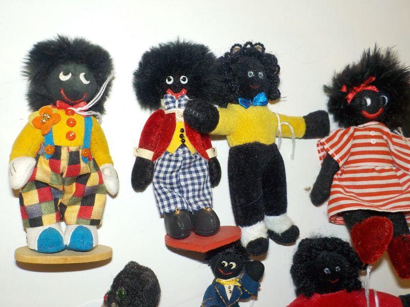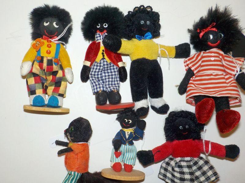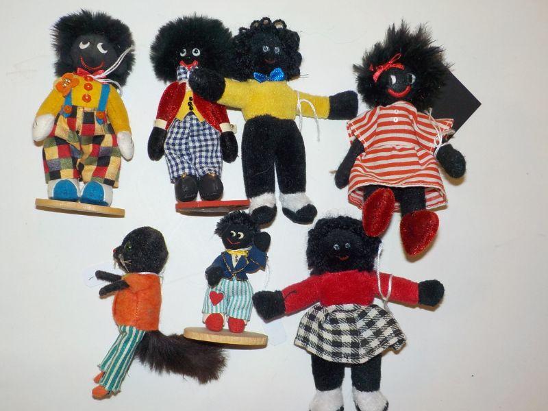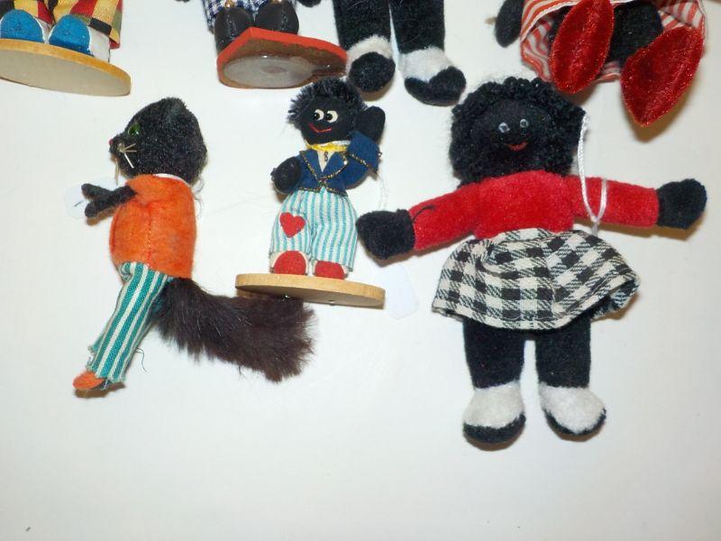 these stand about 2 ' inches a piece...Lot of Golliwogs. The largest has printed fabric body, with blue felt waistcoat, and blue checkered pants. Golliwog in the yellow felt coat with red felt pants is made by Dean’s Rag Book Co. It is a Centenary year edition, “Good Golly” COA inside jacket. Bag of eight small Golliwogs, including a female made by Gill Cousins. .
