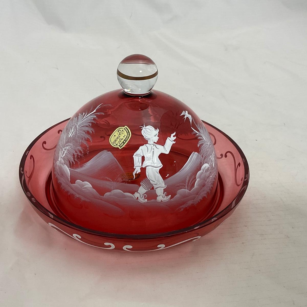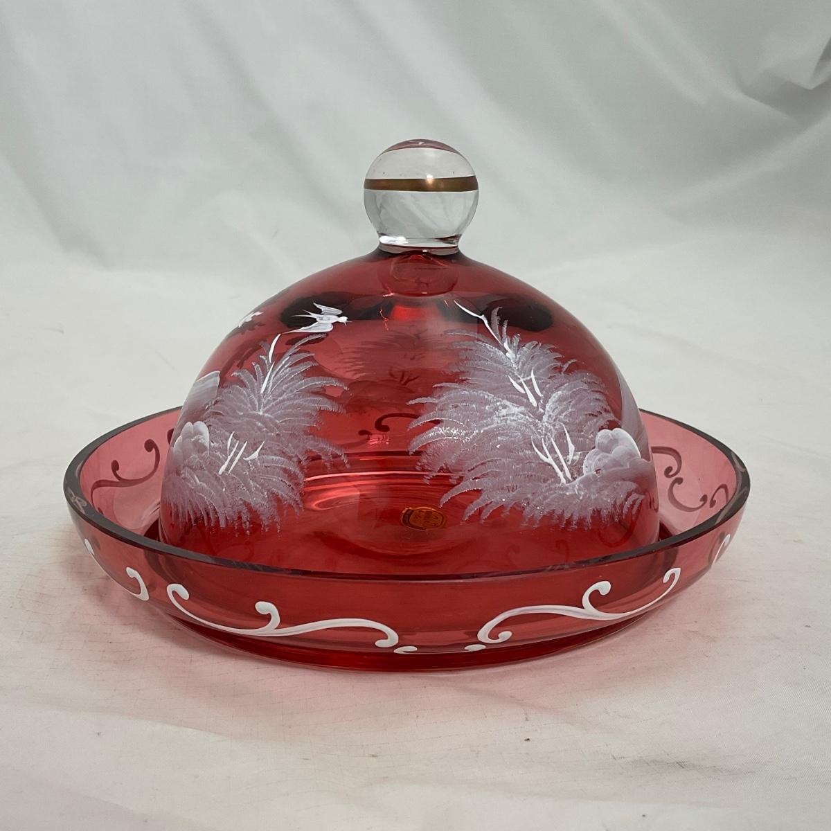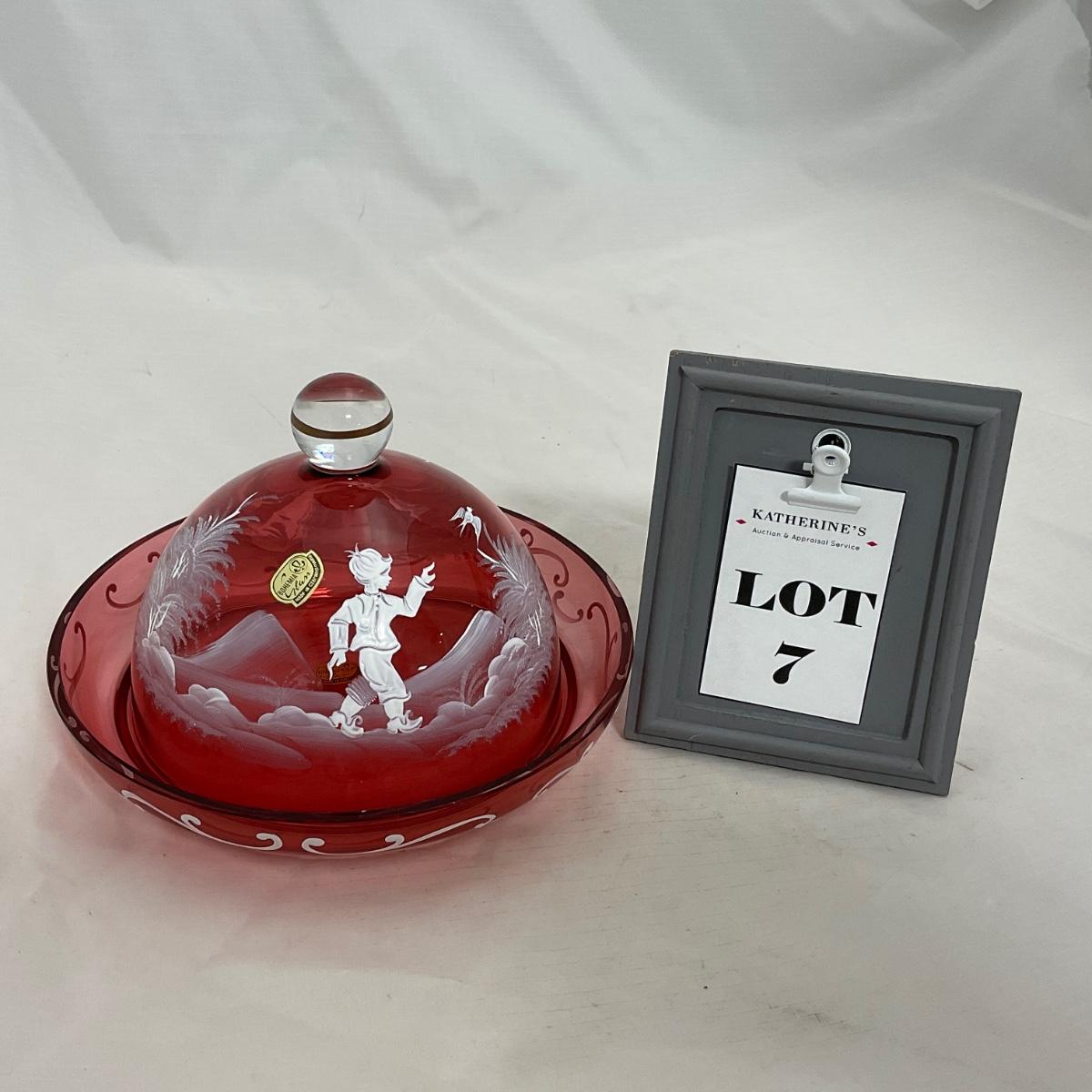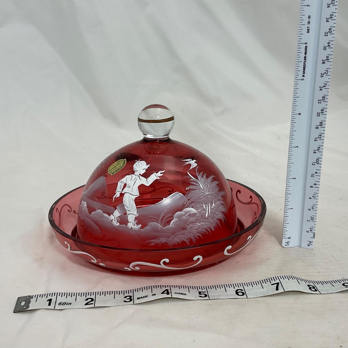 -7- Hand Painted Cranberry Colored | Mary Gregory Covered Butter Dish