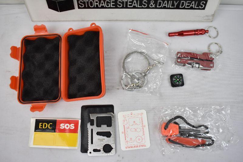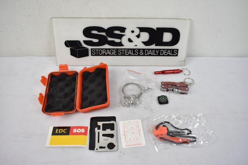 7 in 1 SOS Emergency Kit, Multi-Purpose Outdoor Survival Equipment Kit. Case is cracked