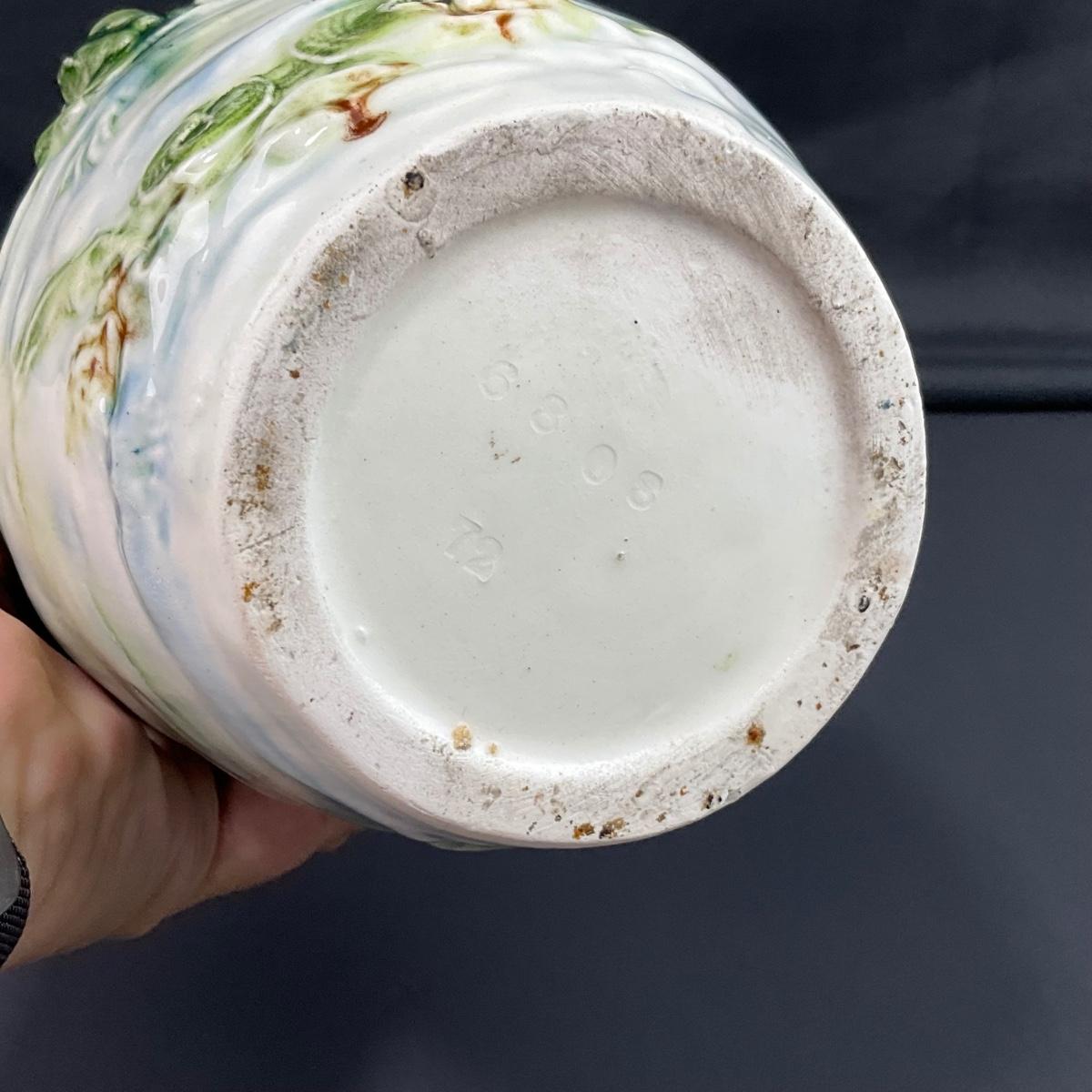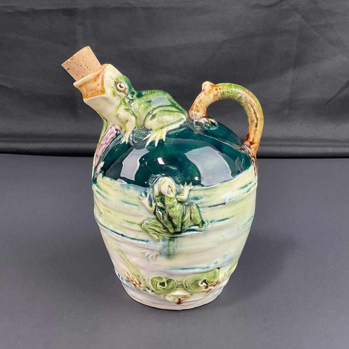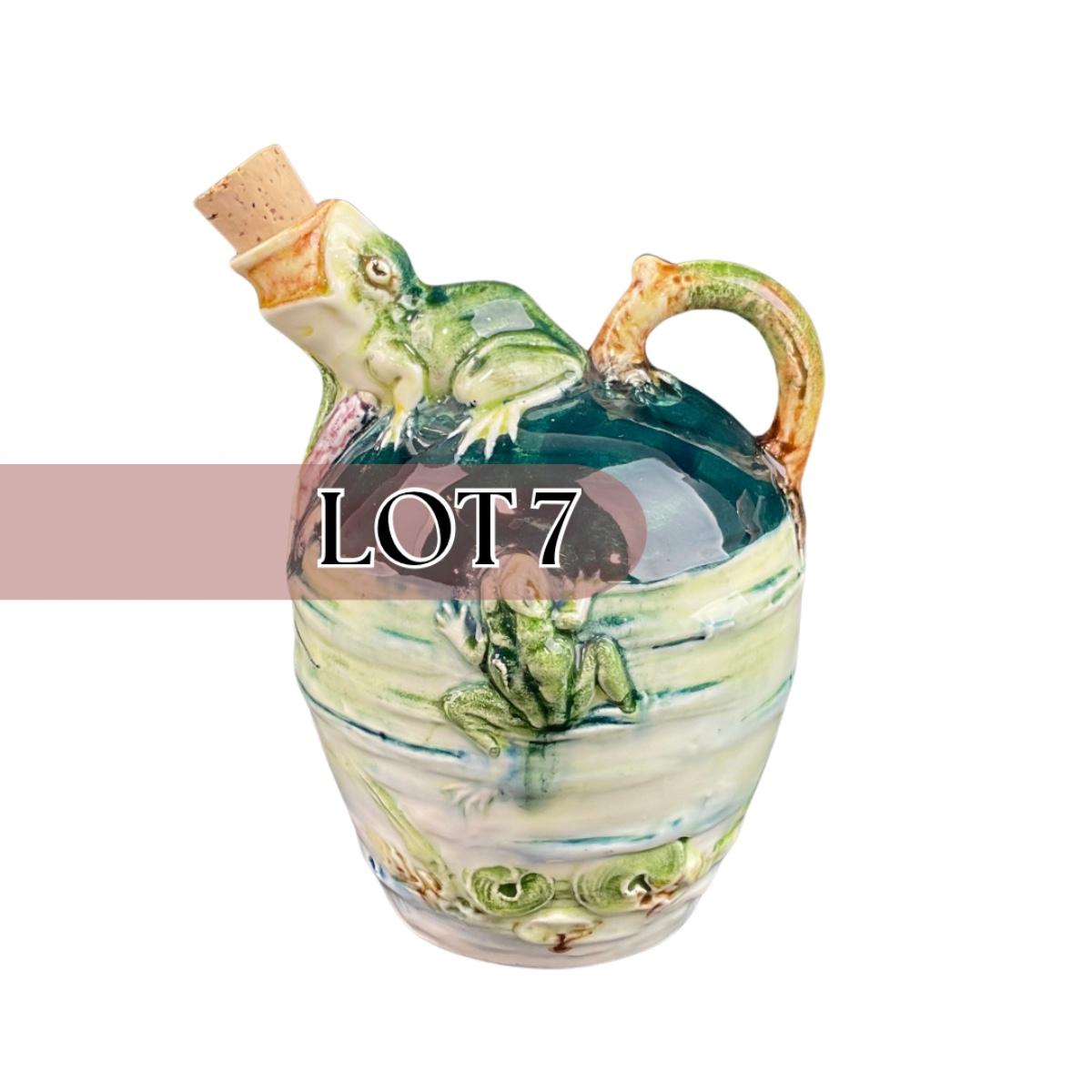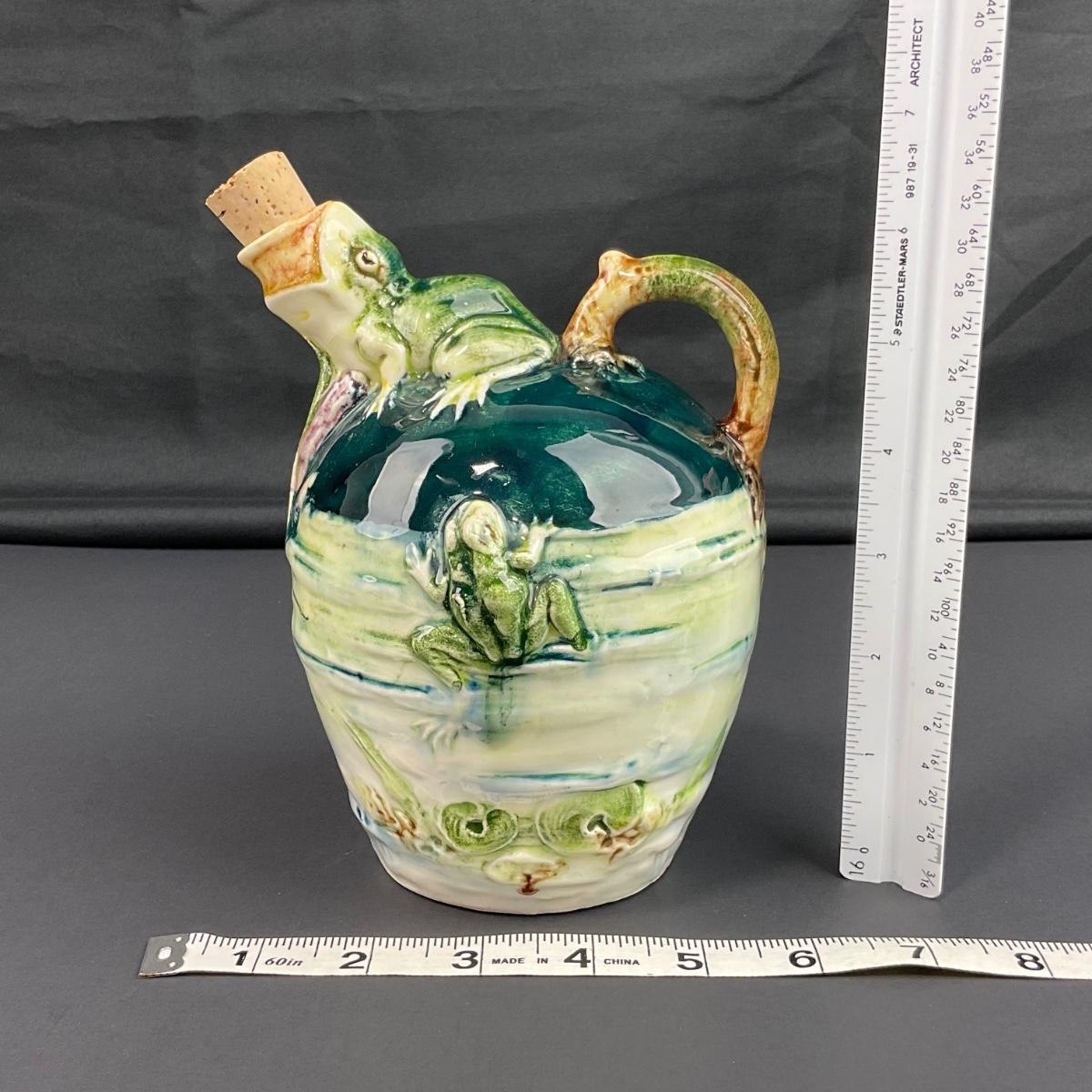 One vintage Majolica small pitcher jug with frog and water lilies on it. This piece has no damage, and appears to be in great shape with no visable chips, cracks, or broken pieces. Please see photos for details and condition. Any condition statement is given as a courtesy to a client, is an opinion, and should not be treated as a statement of fact. Reference to condition written, oral or within a condition report shall not be regarded as a full account of condition and may not include all defects, alterations, or restorations. Absence of a condition report does not imply a lot is flawless or lacking imperfections or damage. Katherine’s Auction & Appraisal Service shall have no responsibility for any error or omission. Returns shall not be accepted on the basis of condition. ::: Shipping is available on this lot. If you require shipping you must let us know at the close of the auction. We will coordinate with you after the item has been won. Shipping fees will include insurance up to or exceeding the value of all items being mailed. If you have any questions regarding this lot please contact the auctioneer either via this website, by direct email or by phone. PICK UP TIMES and other important information can be found in the TERMS and DESCRIPTION of the auction. Please take a look for pertinent information. Thanks!