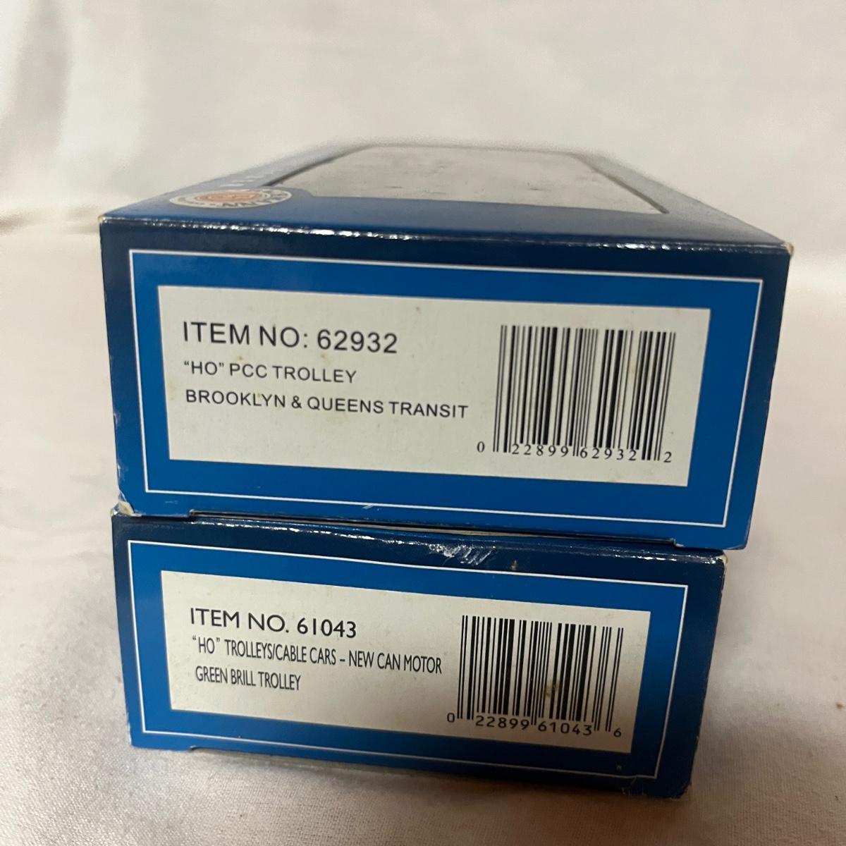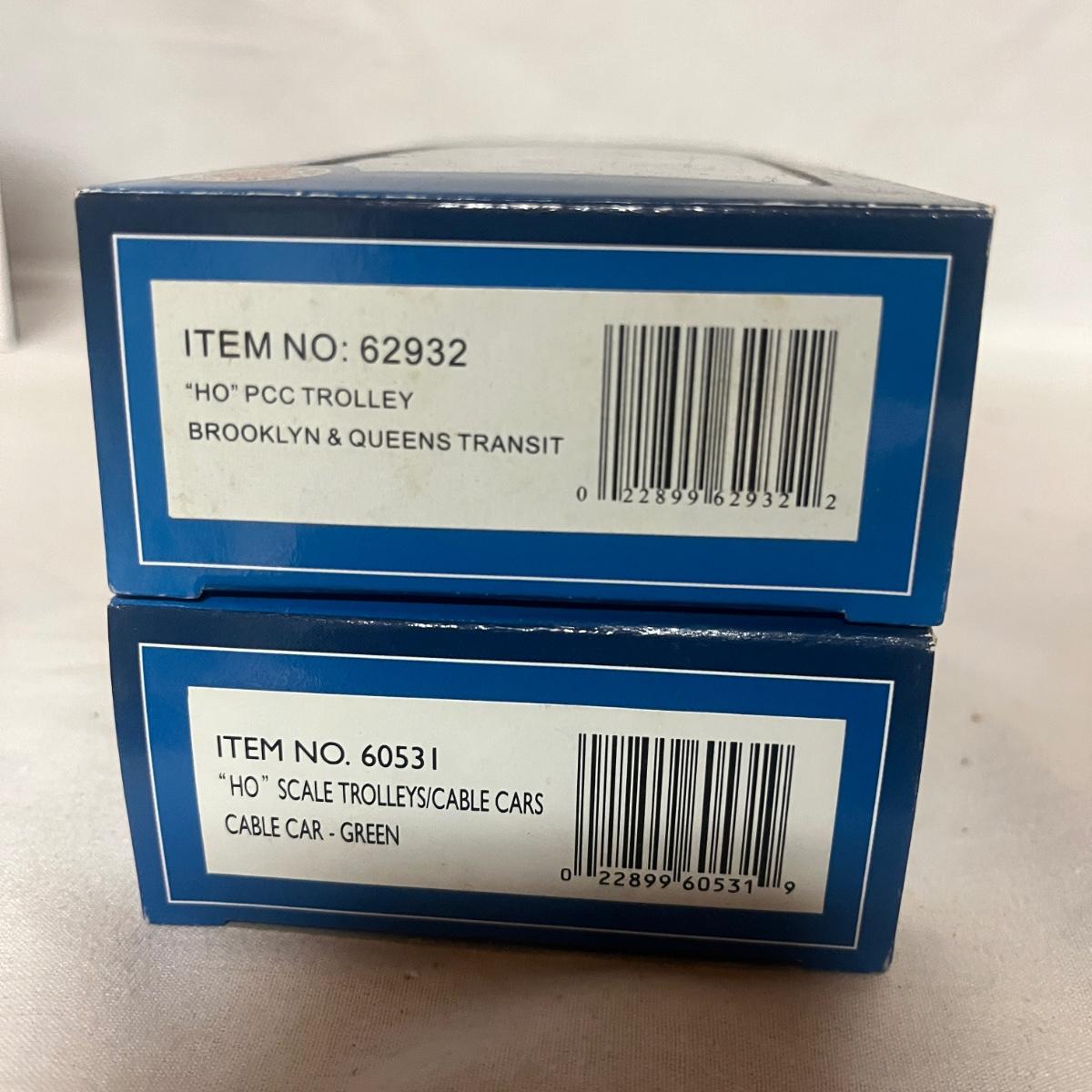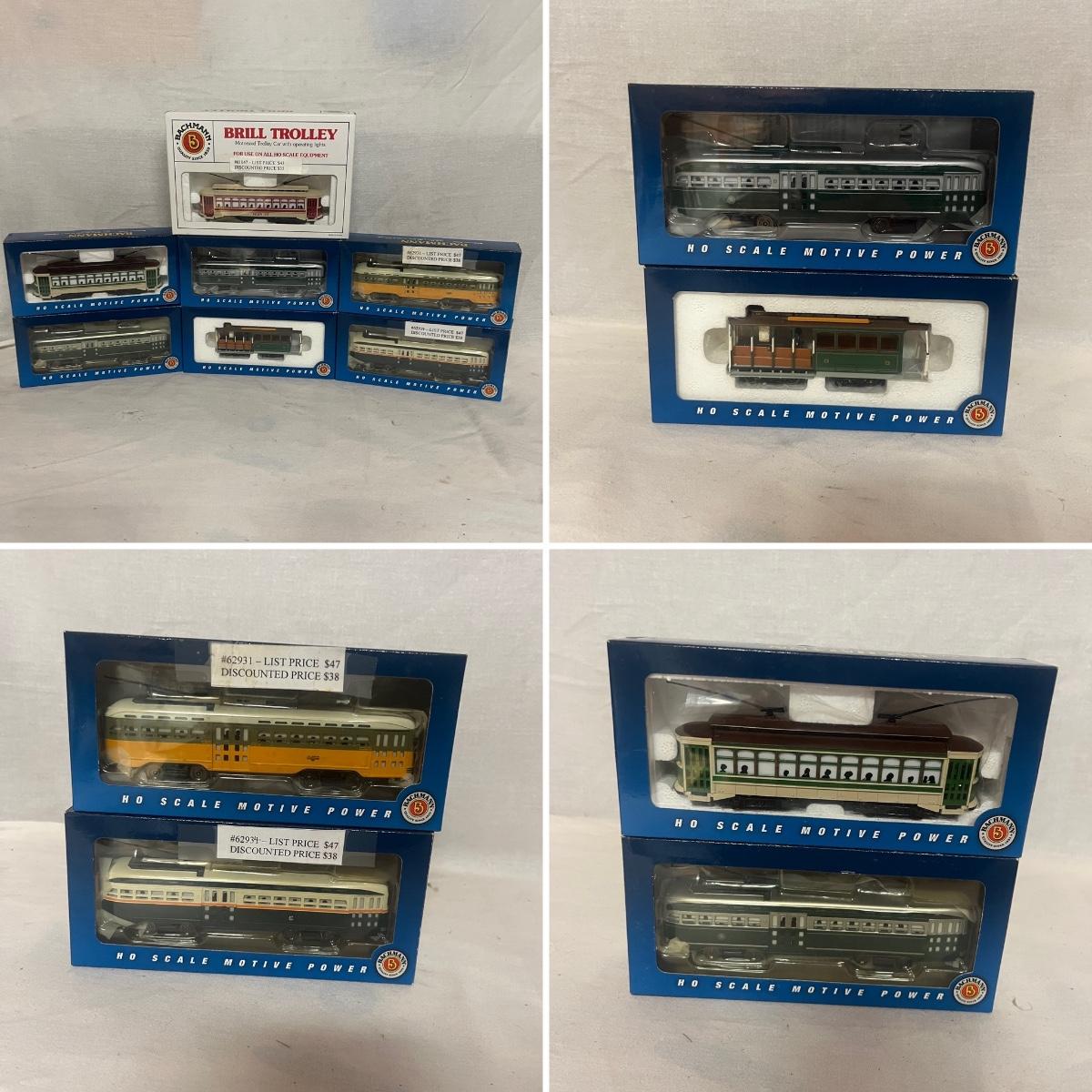 Lot includes seven NIB Bachmann HO trolley cars. Largest box measures 8” x 1.75” x 5.5”H. See pictures for model #s.