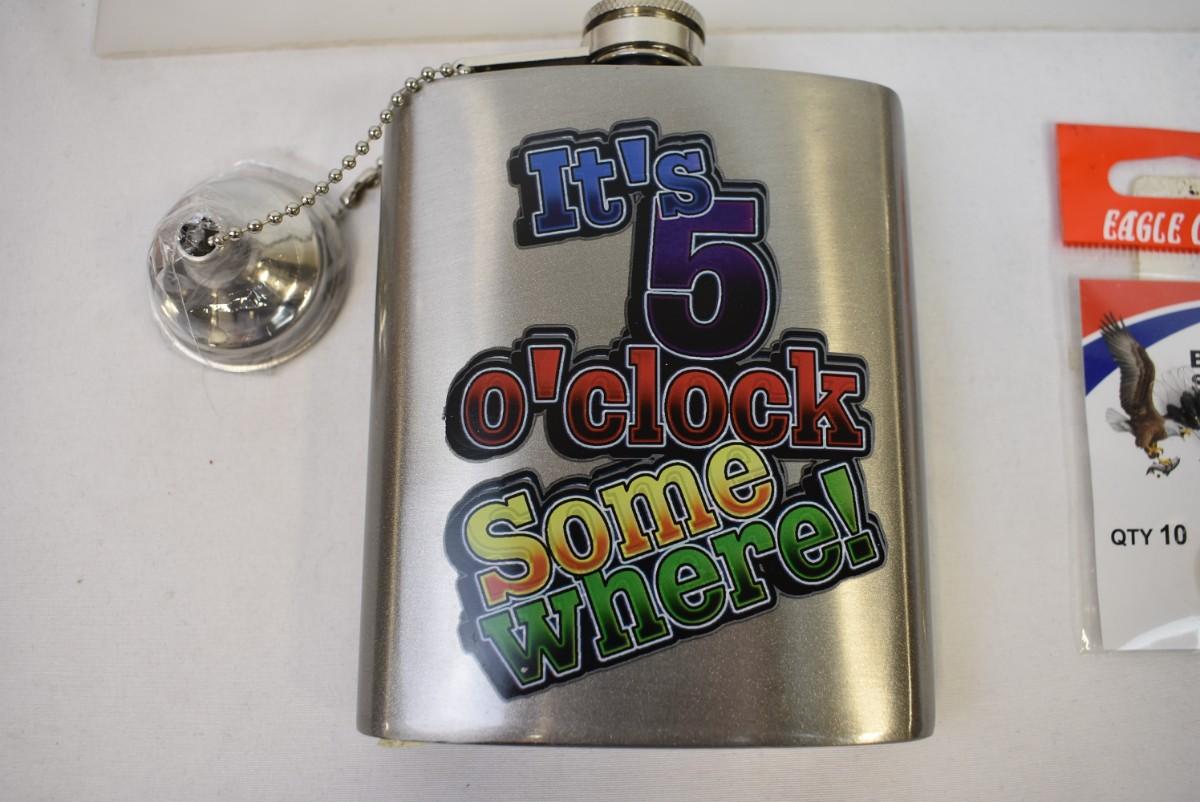 7 oz Stainless Steel Flask "5:00 Somewhere"  and 10 Bobber Stops - New