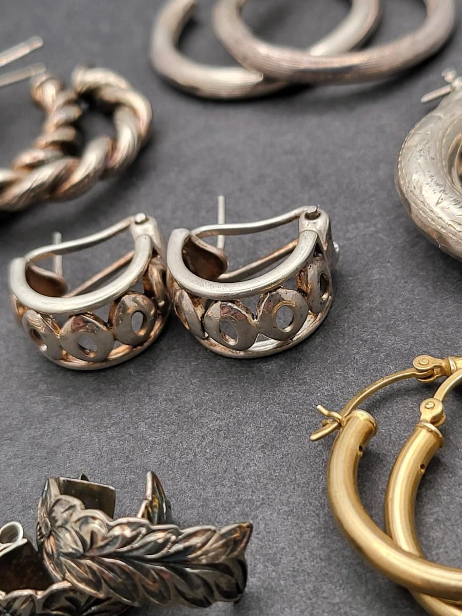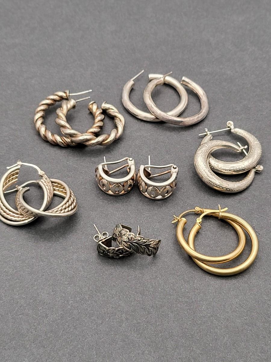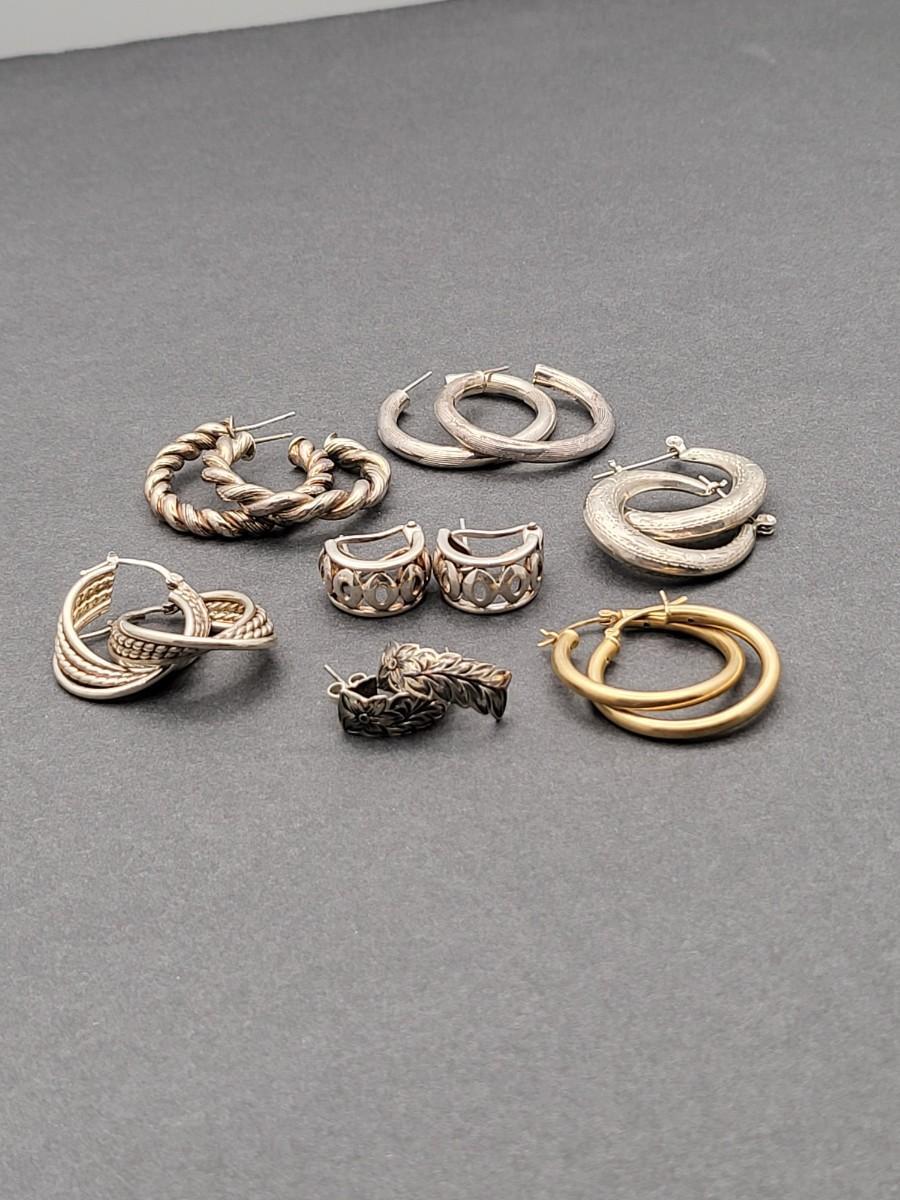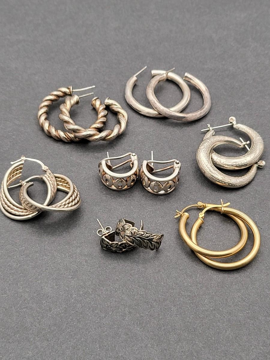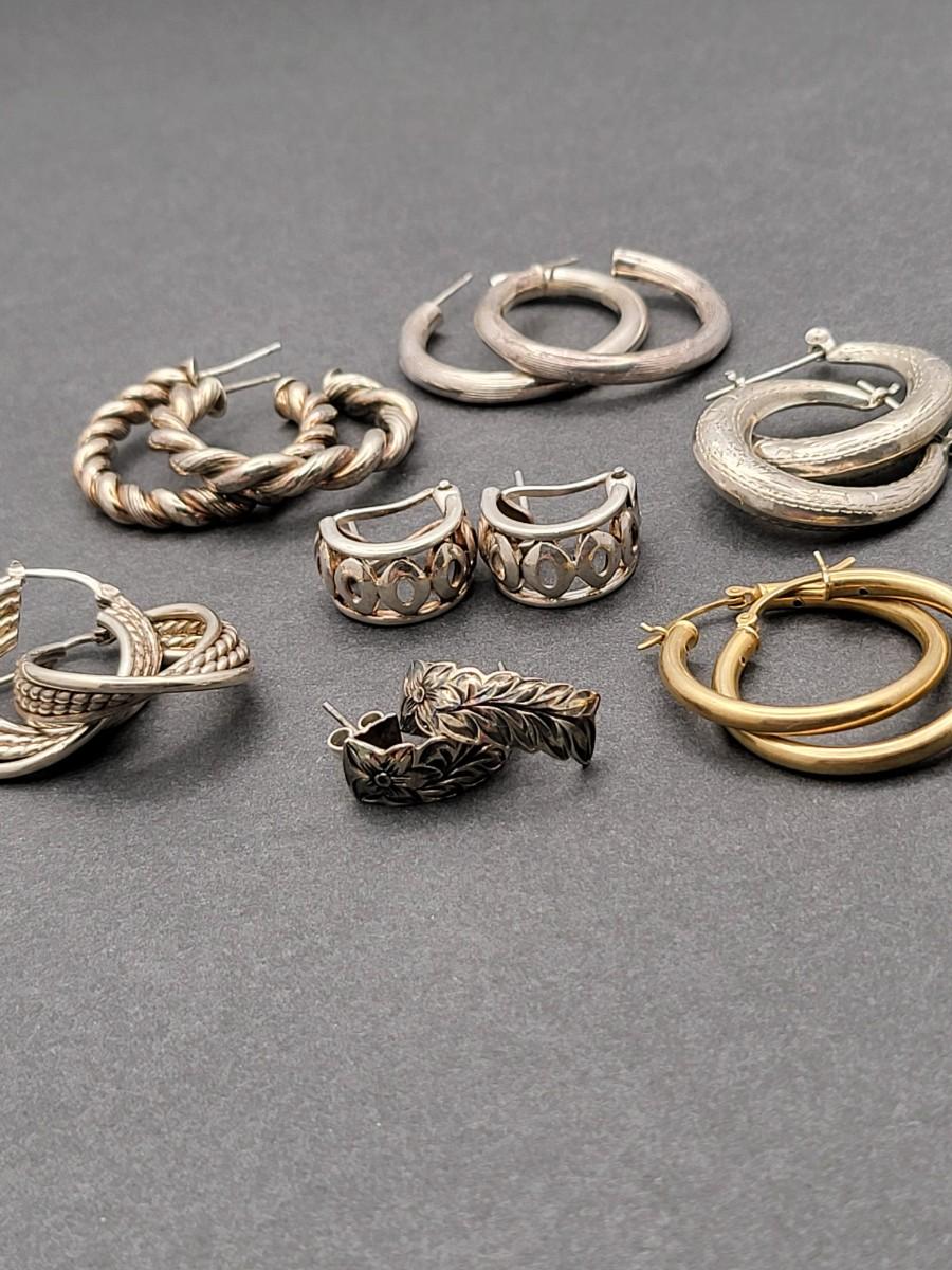 Seven pairs hoops, and 1/2 hoops, pierced earrings, 925 silver. One pair of hoops is gold overlay 925. Couple pairs need new backings. Total weight is 44.4 grams.