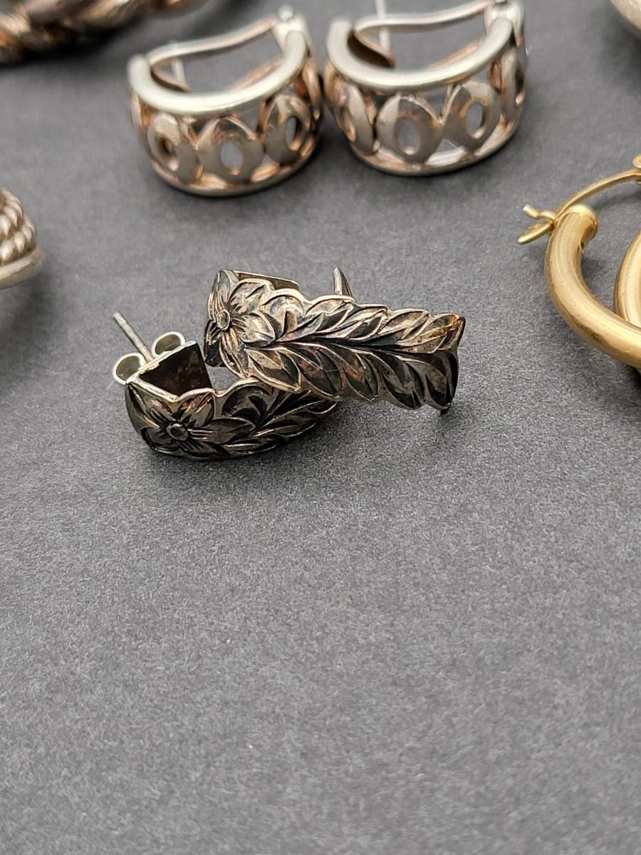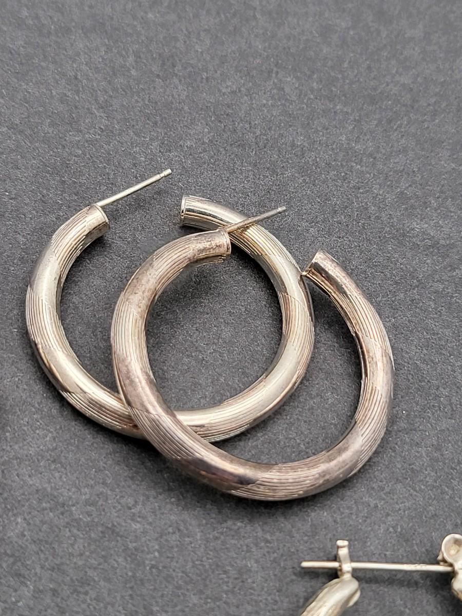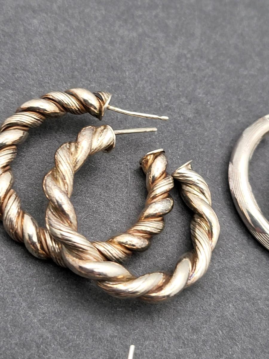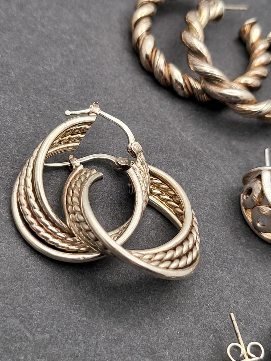 Seven pairs hoops, and 1/2 hoops, pierced earrings, 925 silver. One pair of hoops is gold overlay 925. Couple pairs need new backings. Total weight is 44.4 grams.