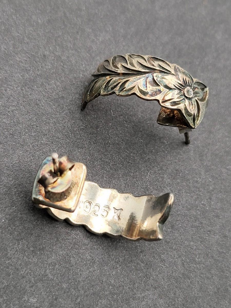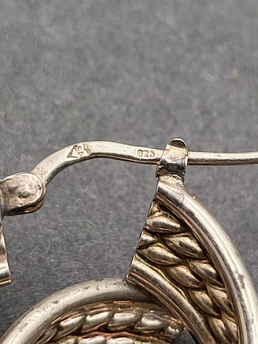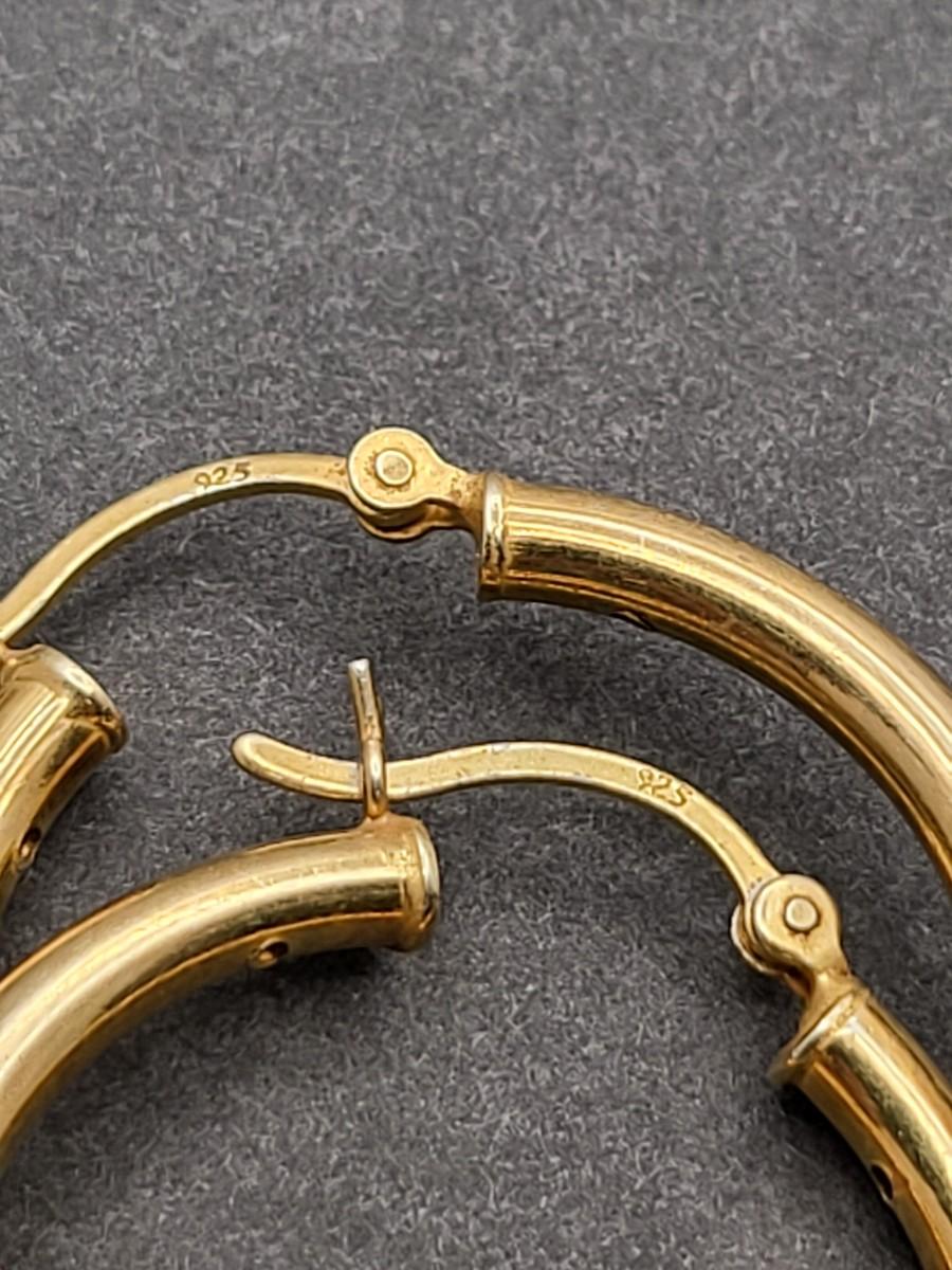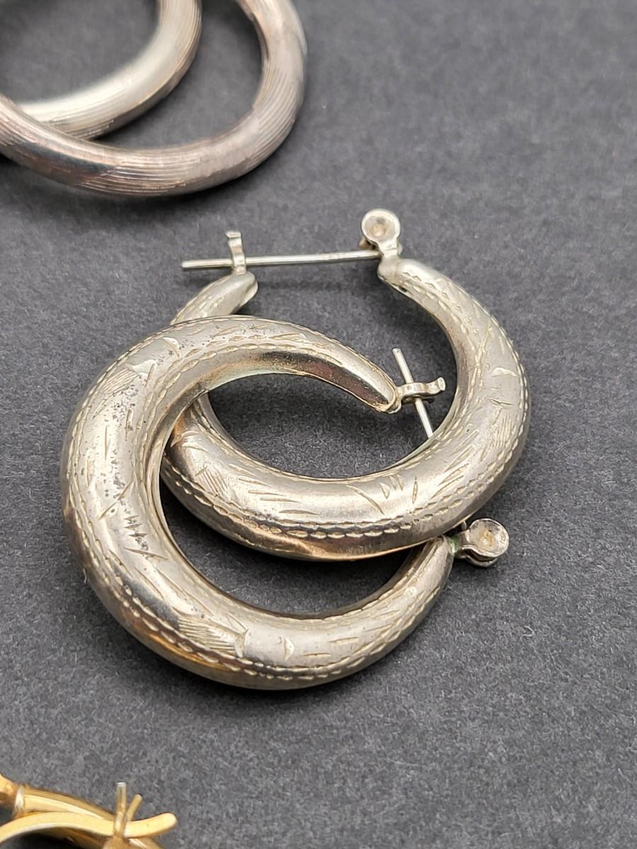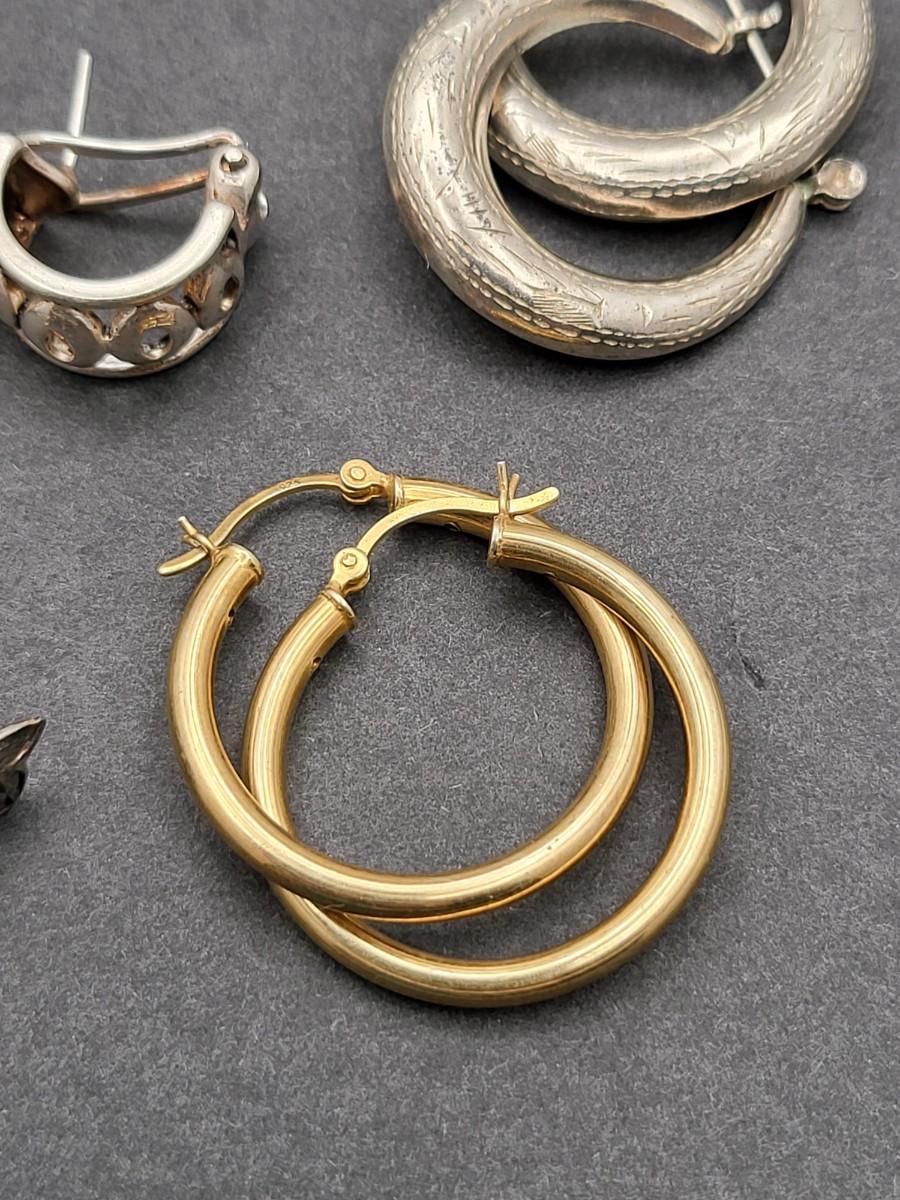 Seven pairs hoops, and 1/2 hoops, pierced earrings, 925 silver. One pair of hoops is gold overlay 925. Couple pairs need new backings. Total weight is 44.4 grams.