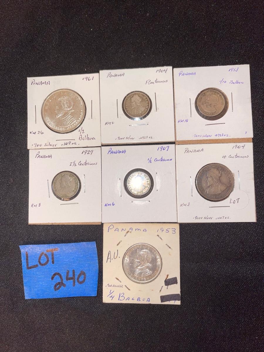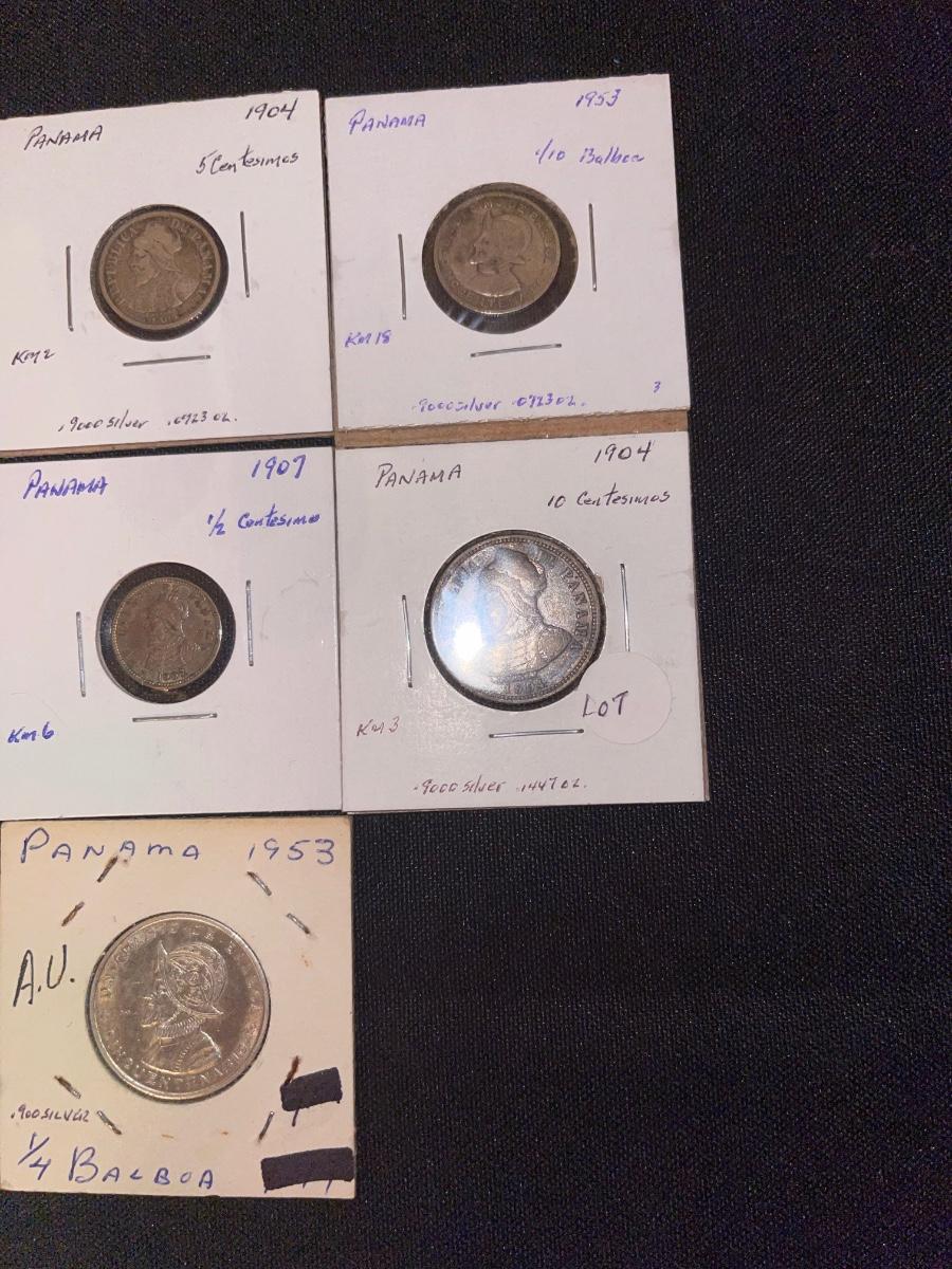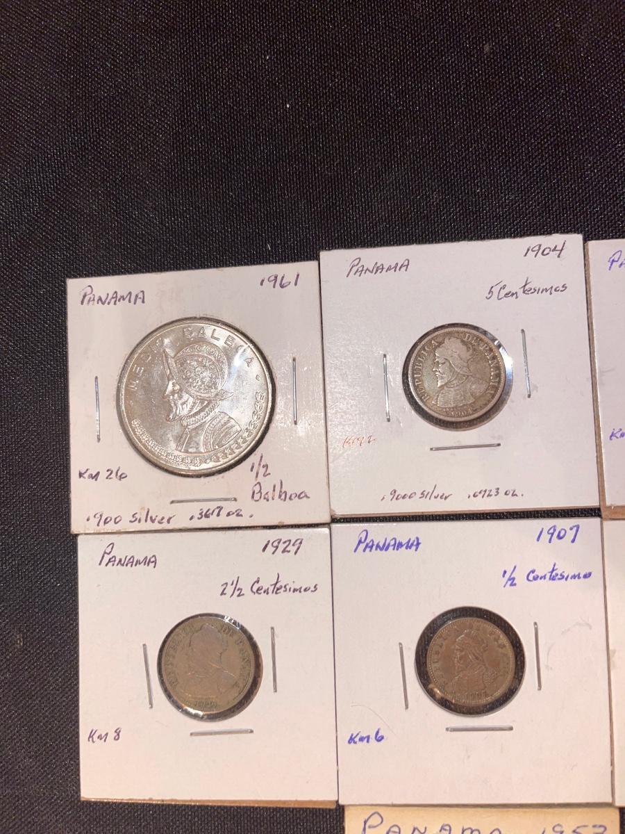 1961 1/2 Balboa, 1904 10 centesimos, 1904 5 centesimos, 1929 2 1/2 centesimos, 1907 1/2 centesimos, 1953 1/4 Balboa, 1953 1/10 Balboa.
