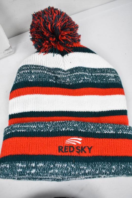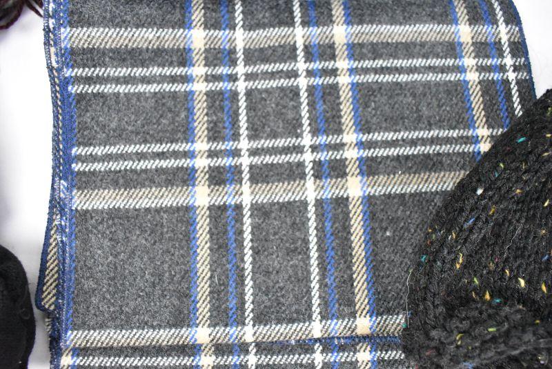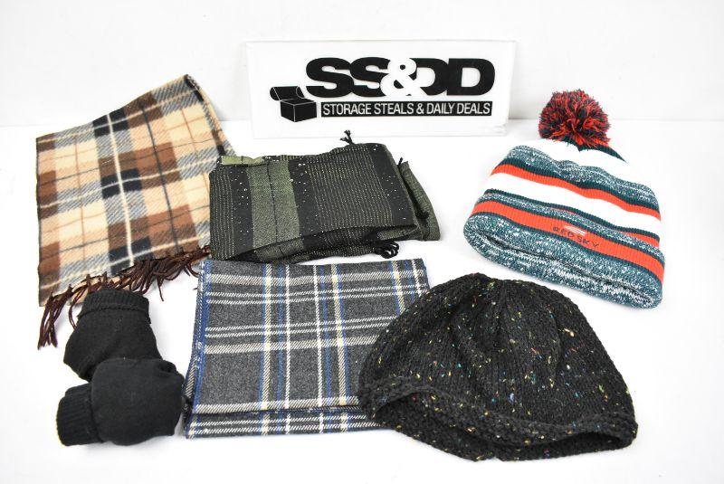 7 pc Cold Weather Clothing: 3 scarves, 2 hats, 2 pairs of gloves