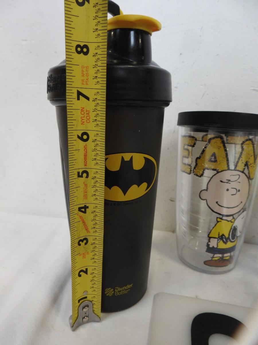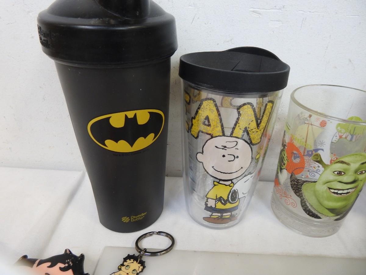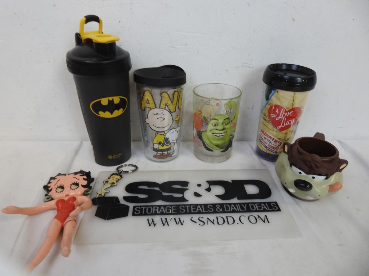 7 pc Collector set: Peanuts, Batman blender bottle, Shrek, I love Lucy, Taz & Betty Boop rubber doll plus key chain