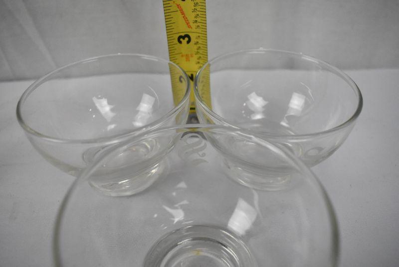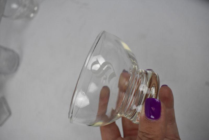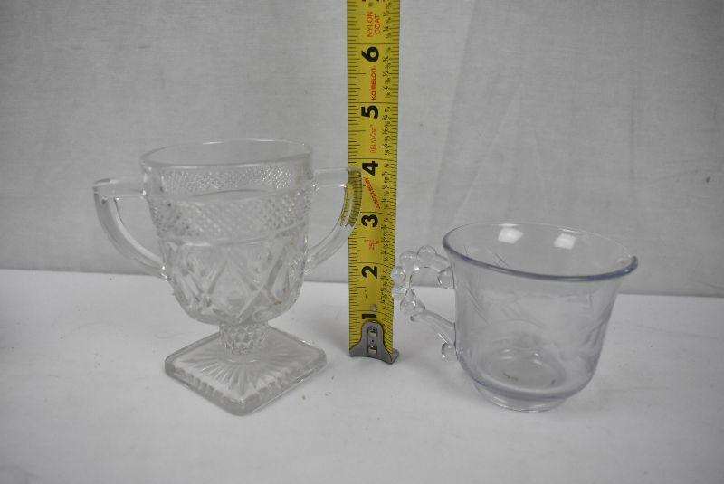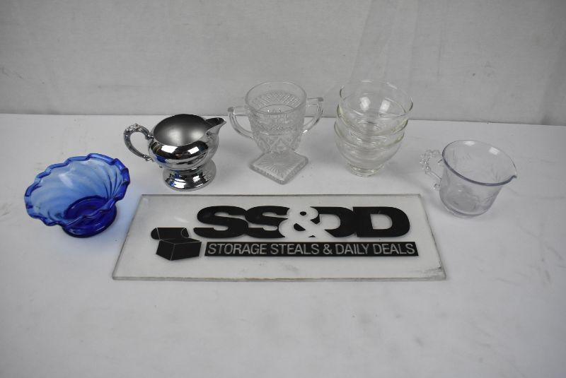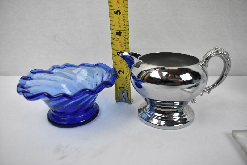 7 pc Decorative Kitchenware: 1 blue glass bowl, 1 metal creamer, 5 clear glass