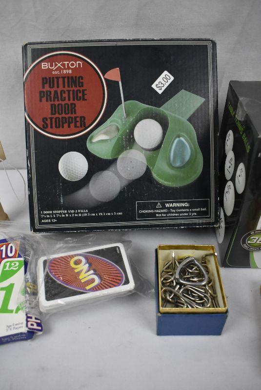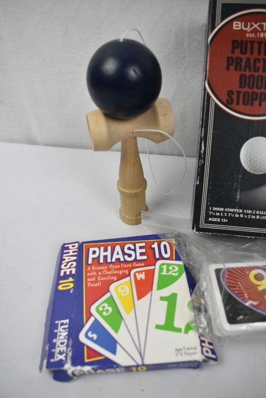 7 pc Games: Kendama, Phase 10, Uno, Metal Puzzle, Putting Practice & More