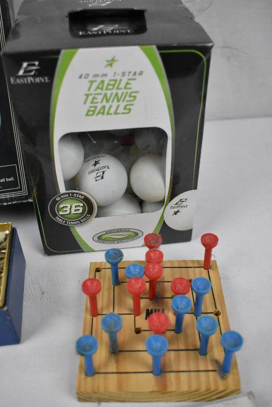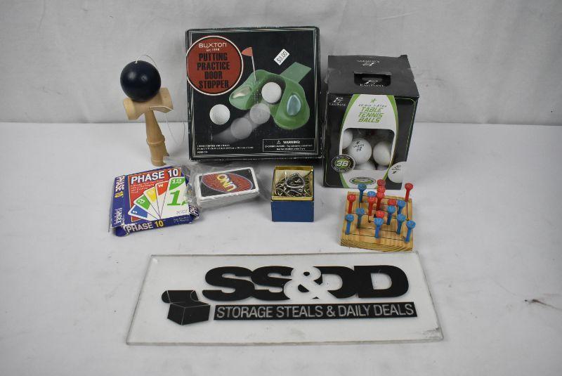 7 pc Games: Kendama, Phase 10, Uno, Peg Game, Metal Puzzle, Table Tennis Balls, Putting Practice