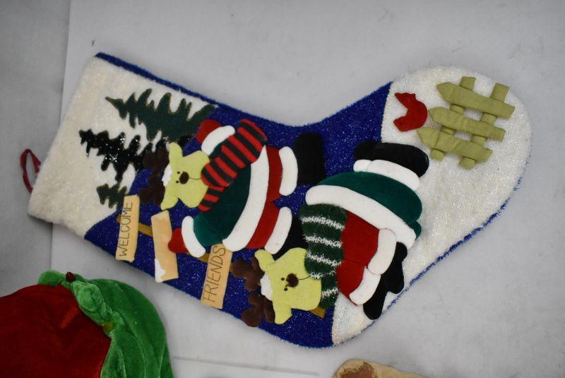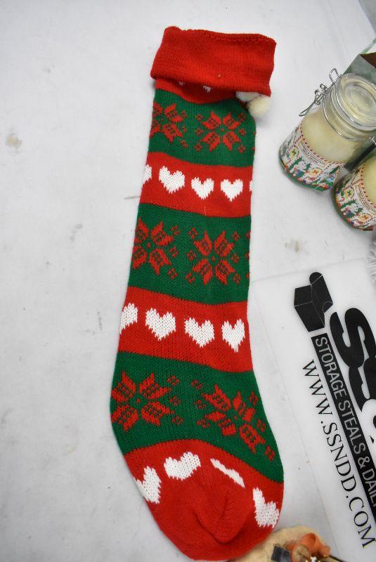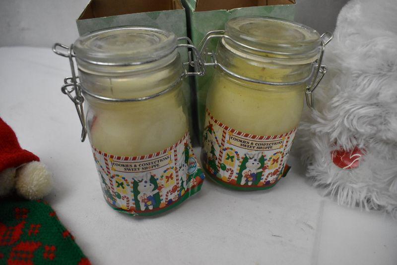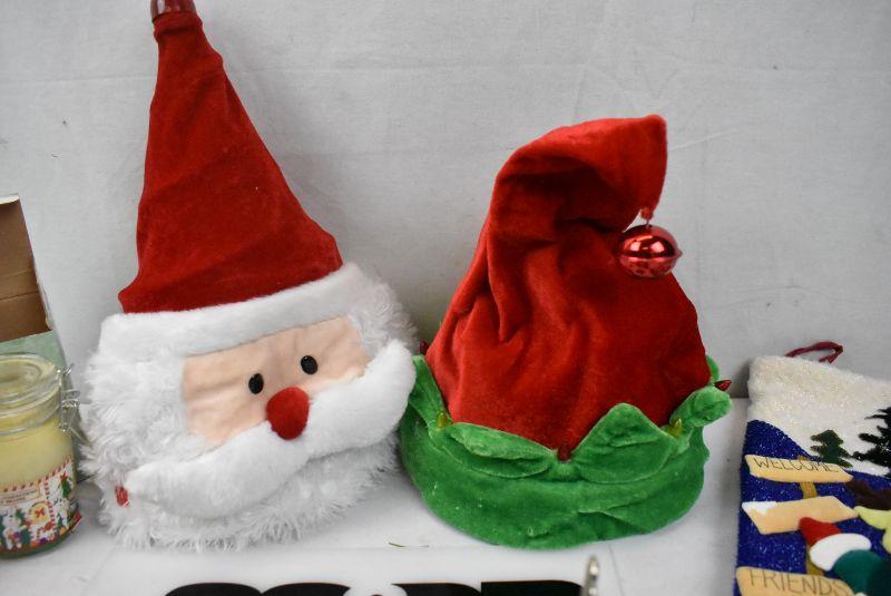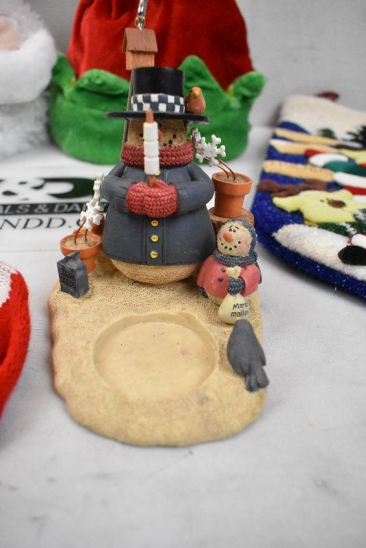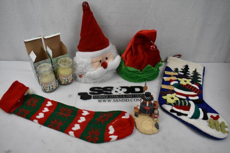 7 pc Holiday Decor: 2 Hats, 2 Stockings, 2 Candles, 1 Snowman Figurine