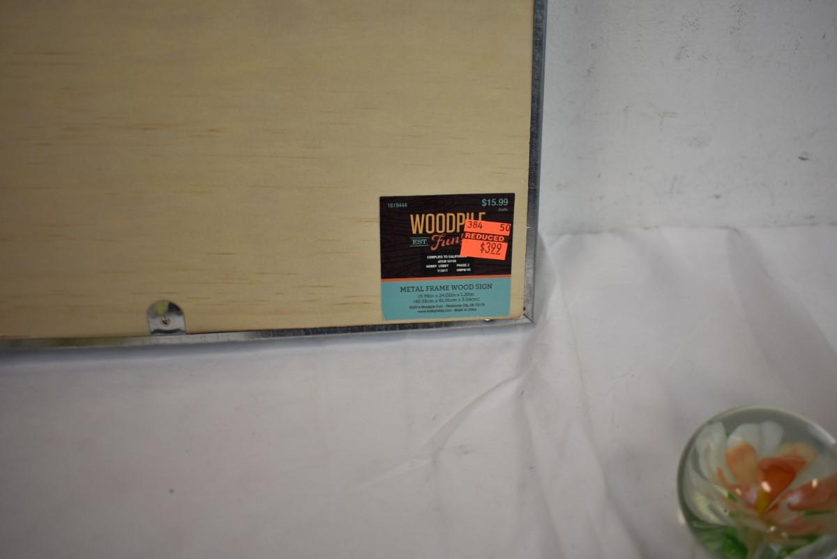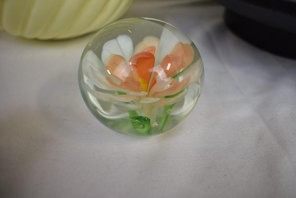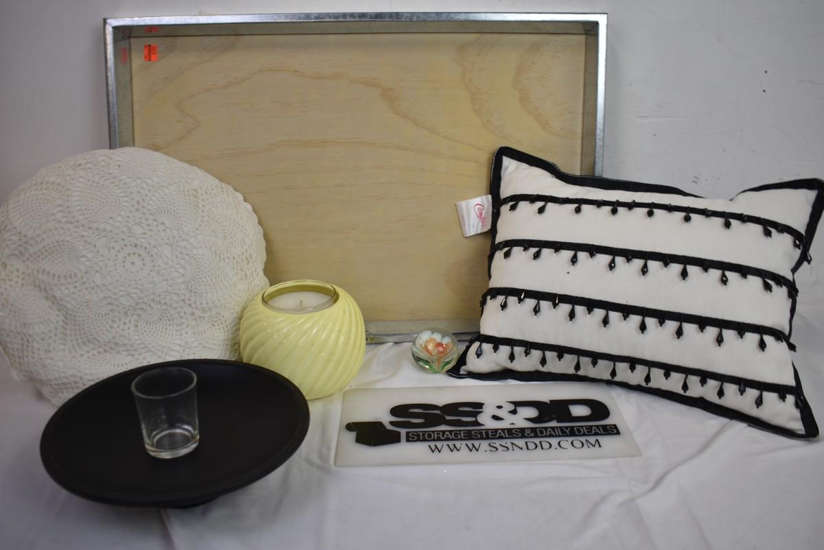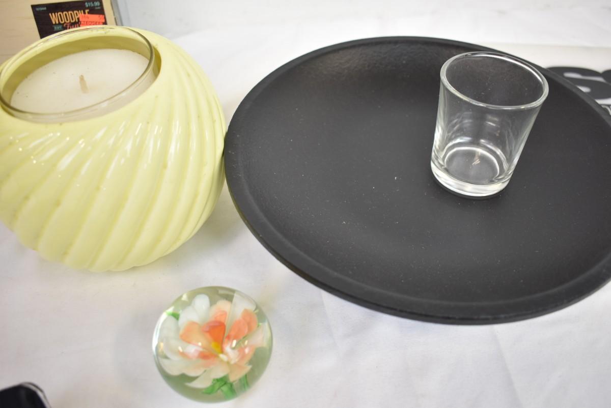 7 pc Home Decor lot: metal/wood picture frame, 2 pillows, candle, glass paperweight, garden candle bowl w/glass votive
