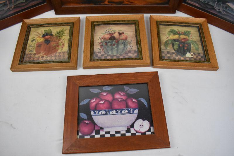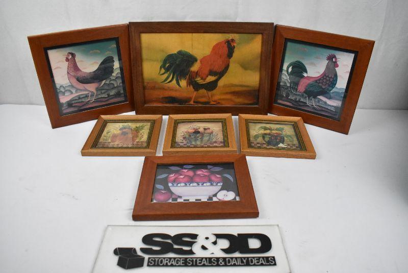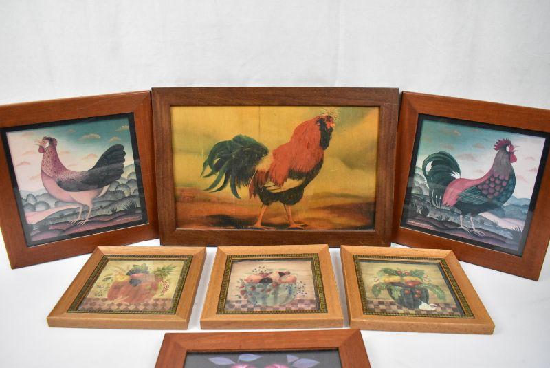 7 pc Kitchen Wall Decor: Roosters/Hens/Bowls of Fruit
