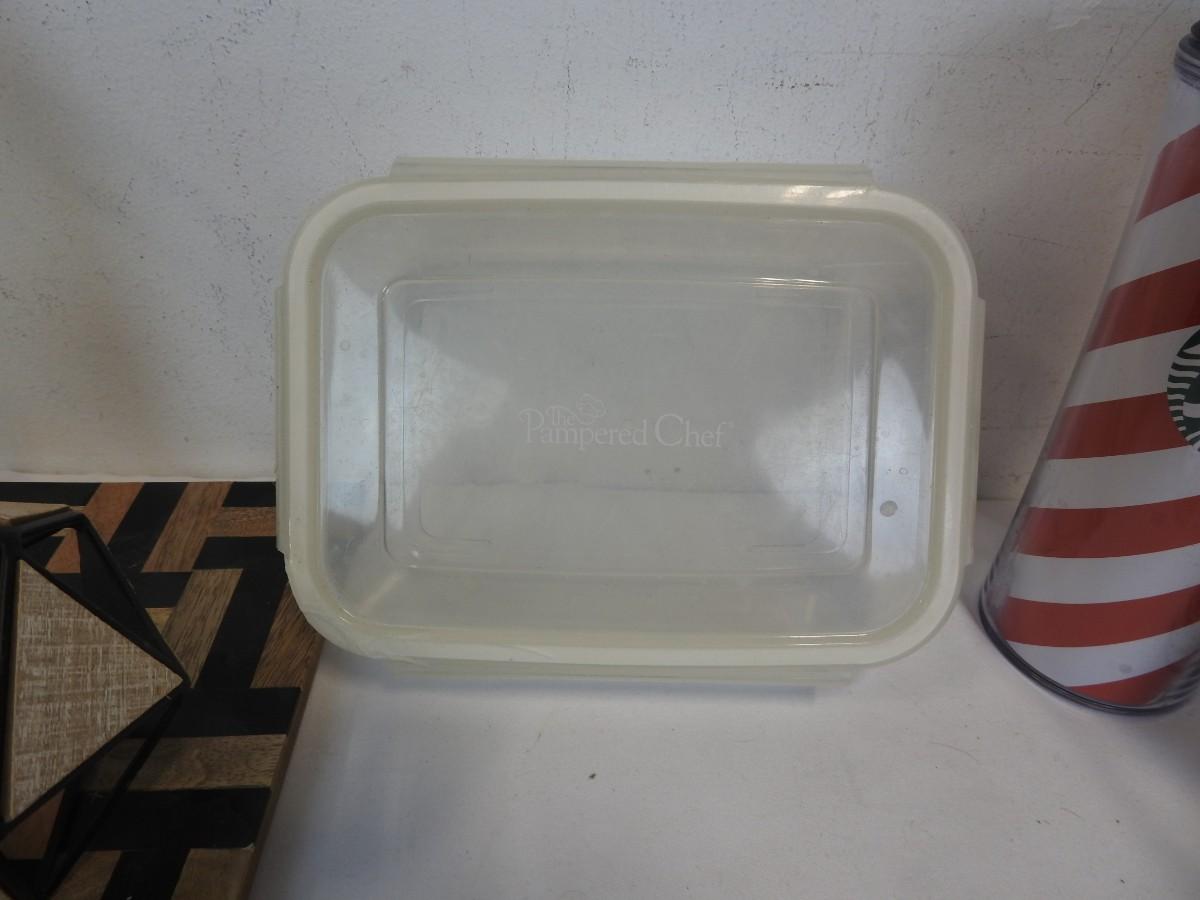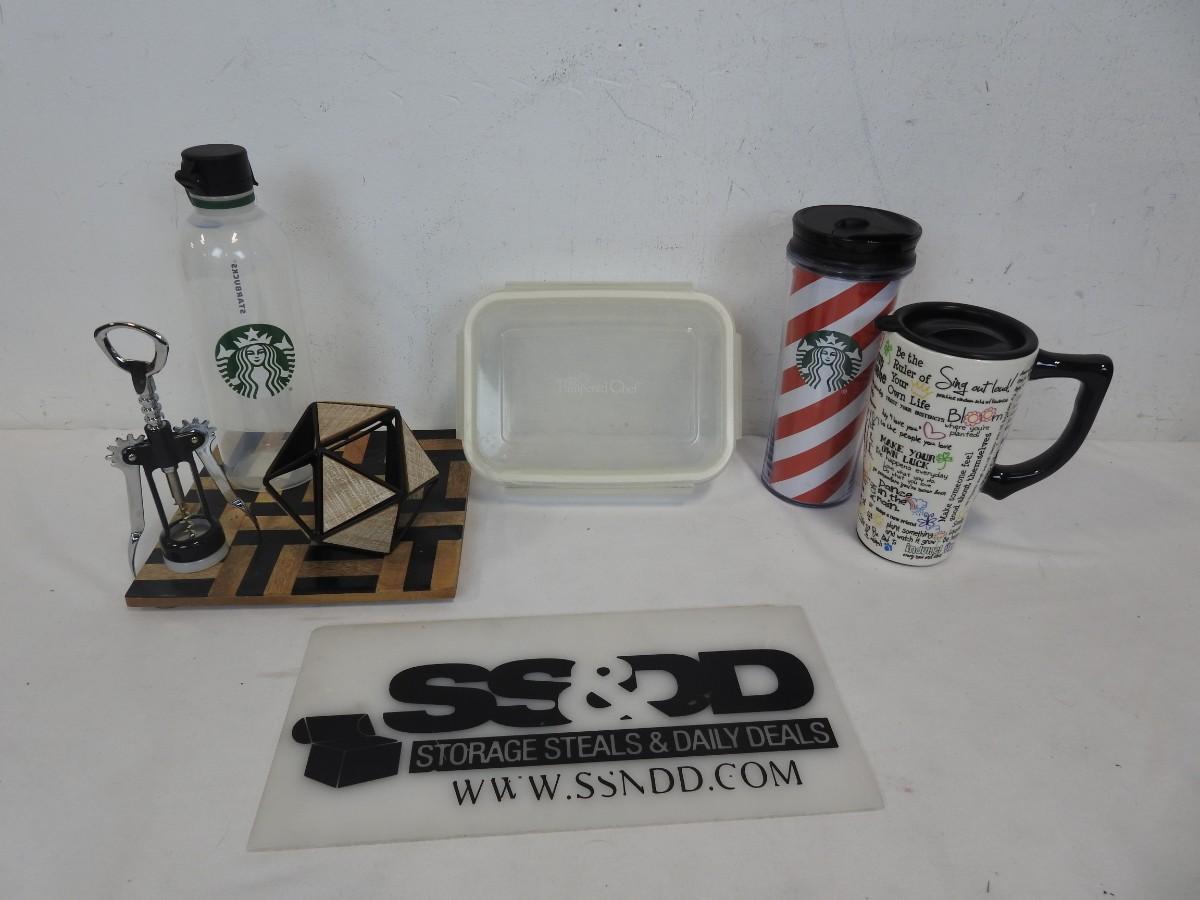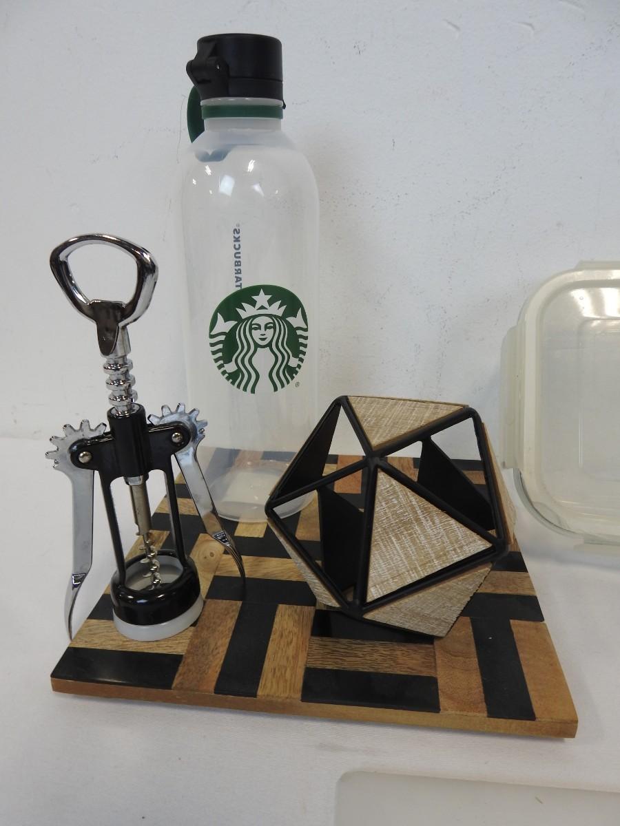 7 pc Kitchen/Home Decor: Starbucks Mug & Water Bottle, Pampered Chef Bowl, Wooden Trivet, Corkscrew