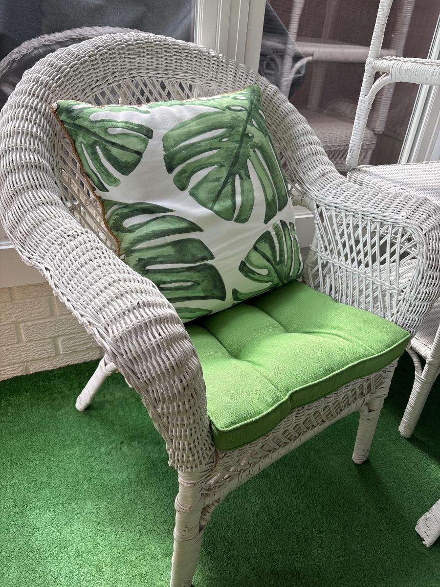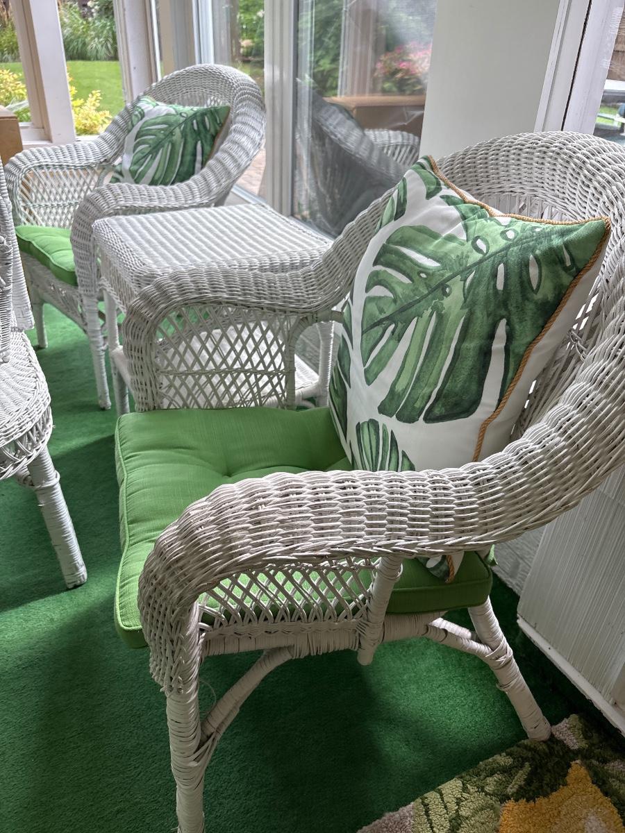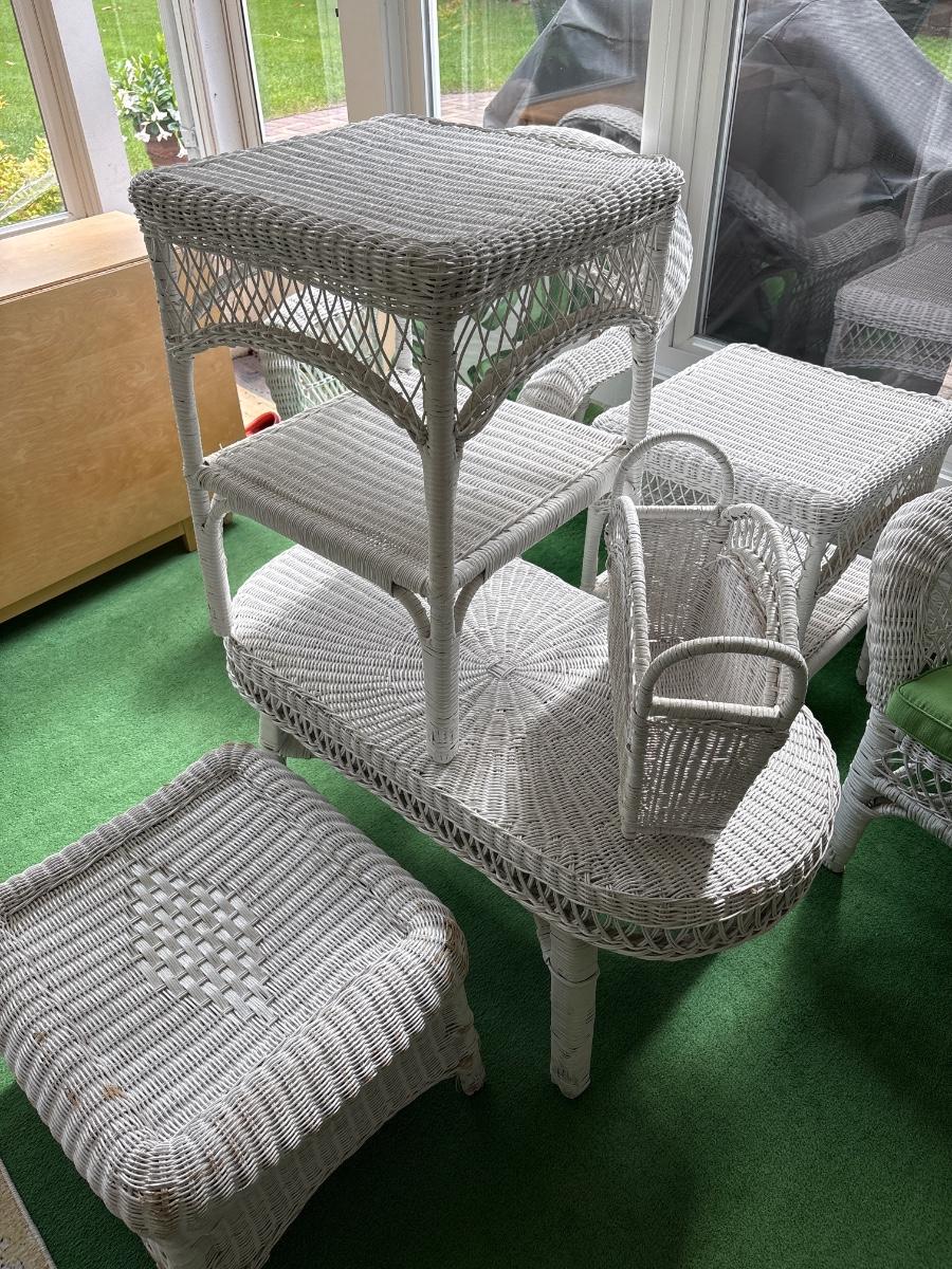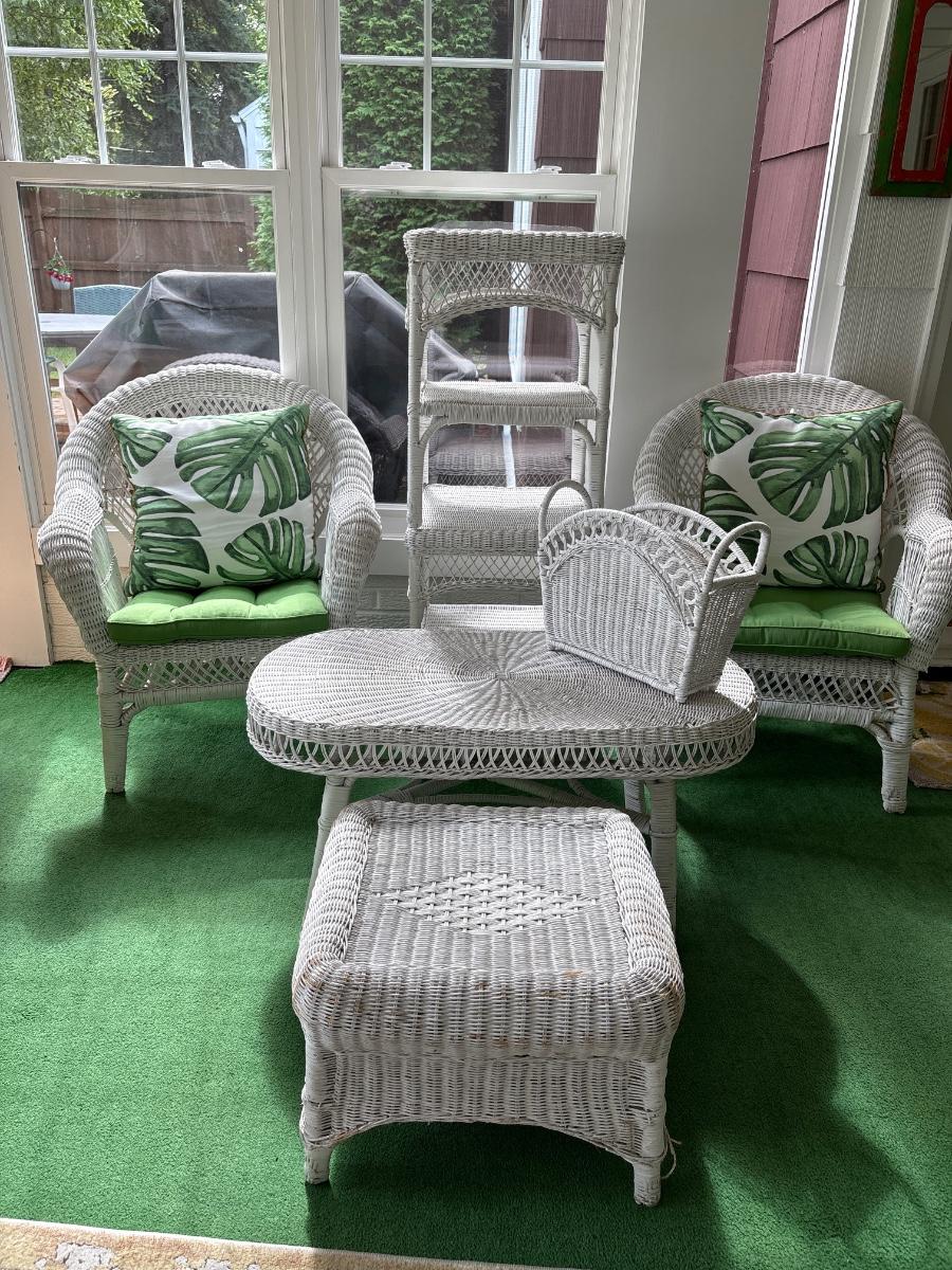 Two chairs w/cushions, footstool, coffee table, two end tables and magazine rack