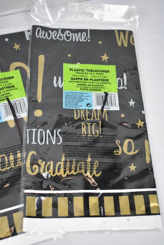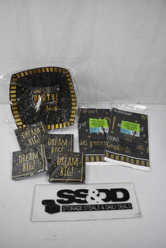 7 pc You Did It! Graduation Party Lot: Square Paper Bowl, 11 x 11 in, Black & Gold. 2 Plastic Tablecloths, 84 x 54 in, & Qty 4 Paper Beverage Napkins, 5 in, 16ct - New