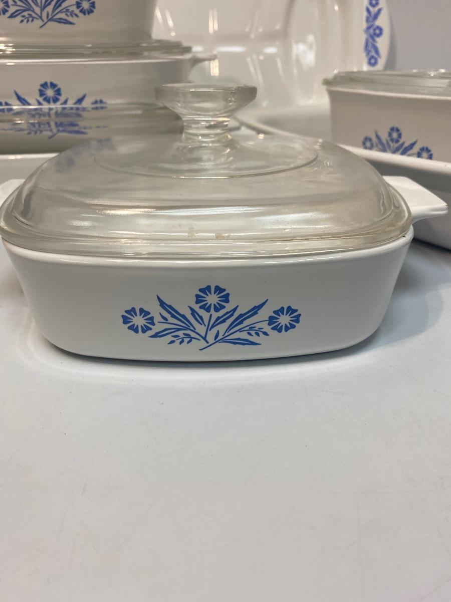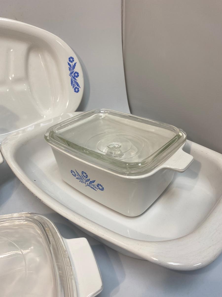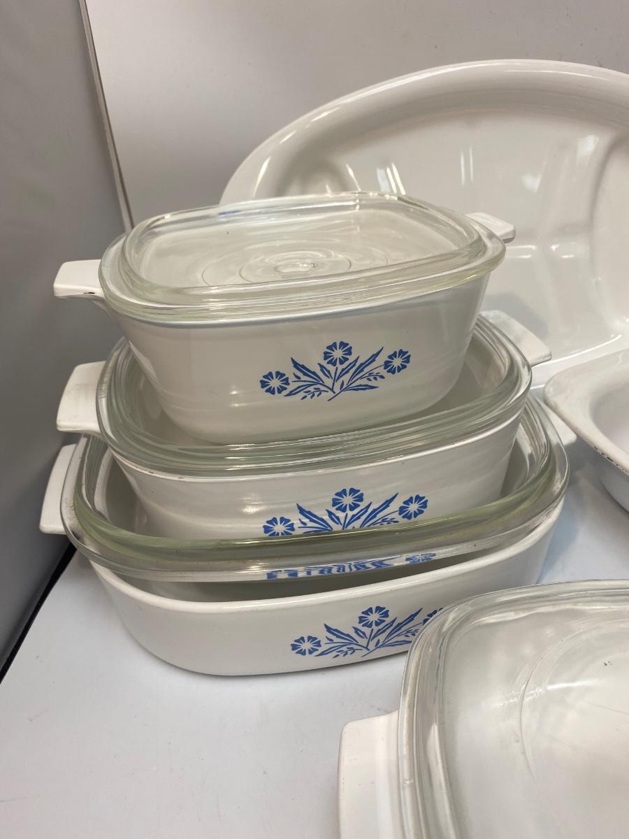 7 Piece Corning Ware Cornflower Blue Bake Ware Set with Lids. Various size casserole dishes with lids, a long shallow casserole dish, and a roast platter. Good used condition.