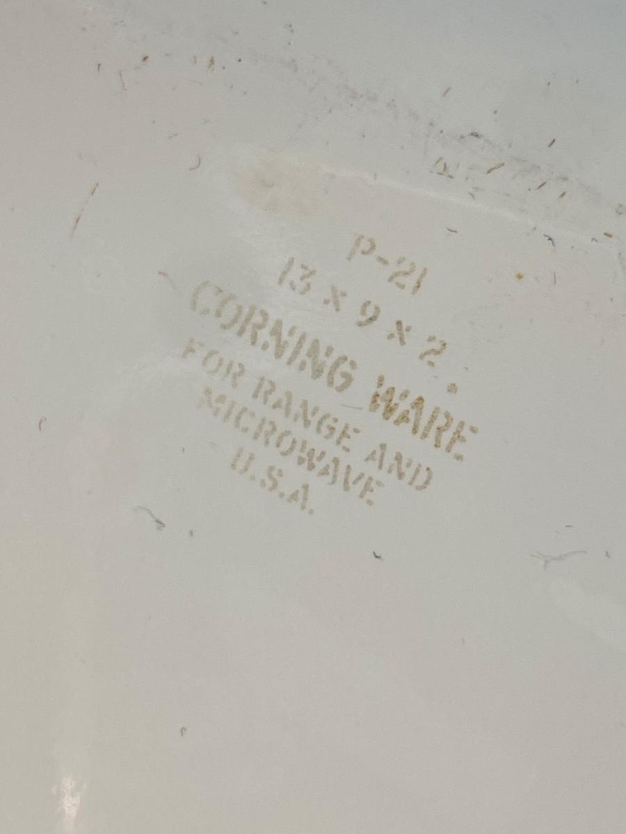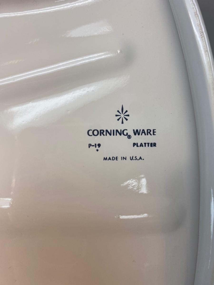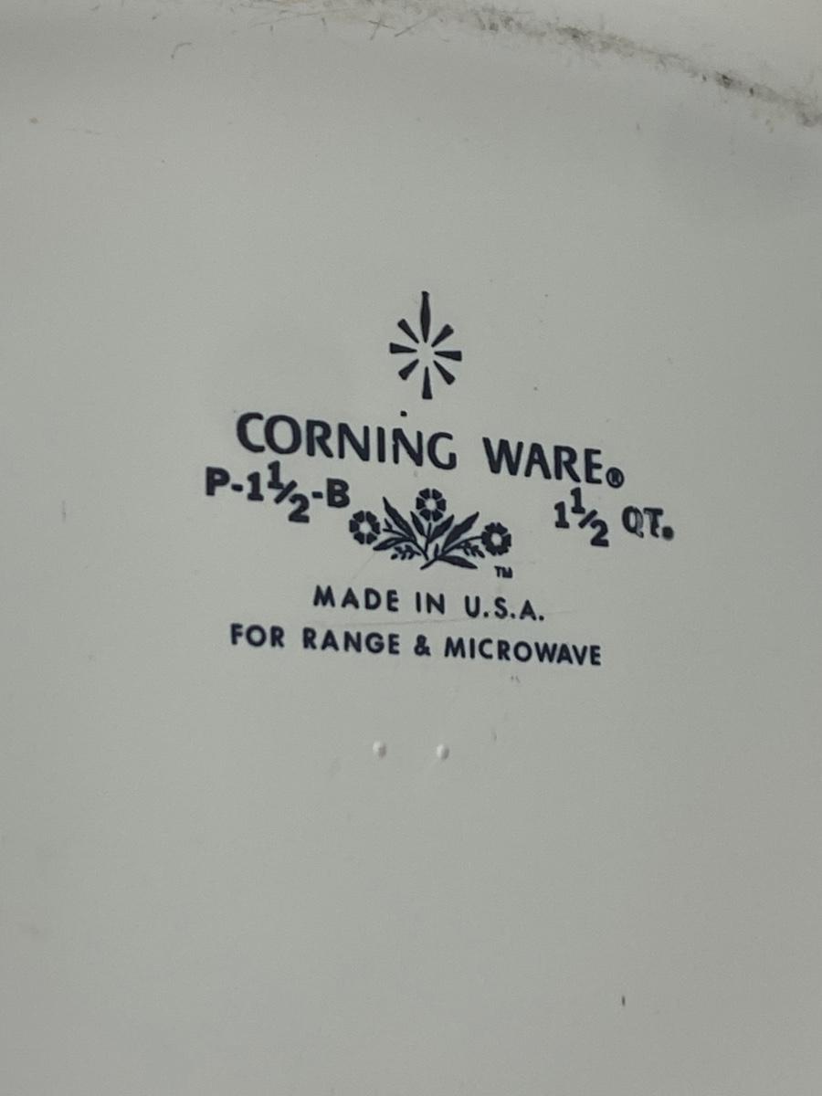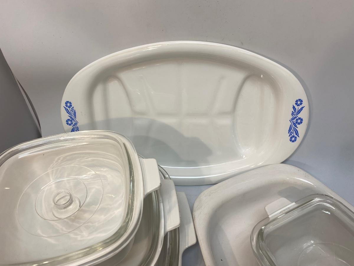 7 Piece Corning Ware Cornflower Blue Bake Ware Set with Lids. Various size casserole dishes with lids, a long shallow casserole dish, and a roast platter. Good used condition.