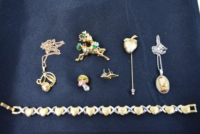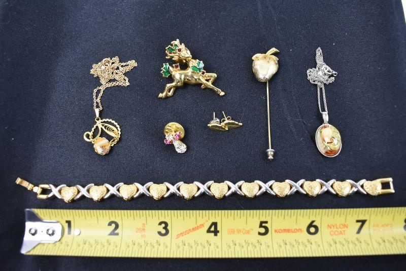 7 Piece Costume Jewelry: 2 Necklaces, 3 Pins, 1 Pair Earrings, and 1 Bracelet