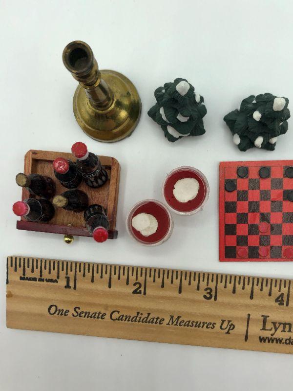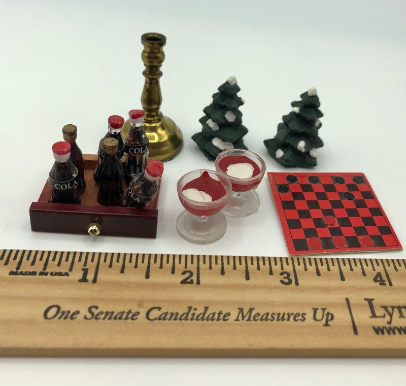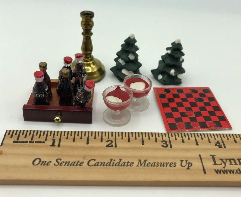 7 piece lot of dollhouse miniatures decor. Includes a serving tray with coke bottles, brass candle stick, 2 Christmas trees, a pair of dessert bowls, and a cardboard checkerboard. Good previously displayed condition.