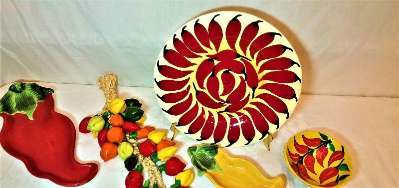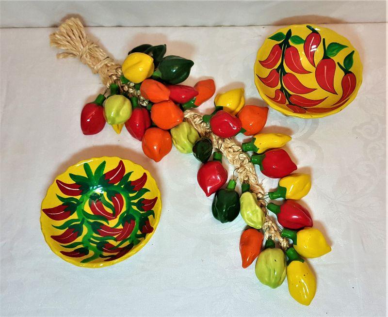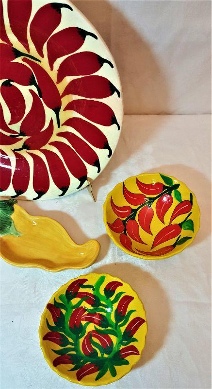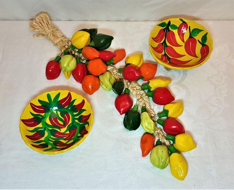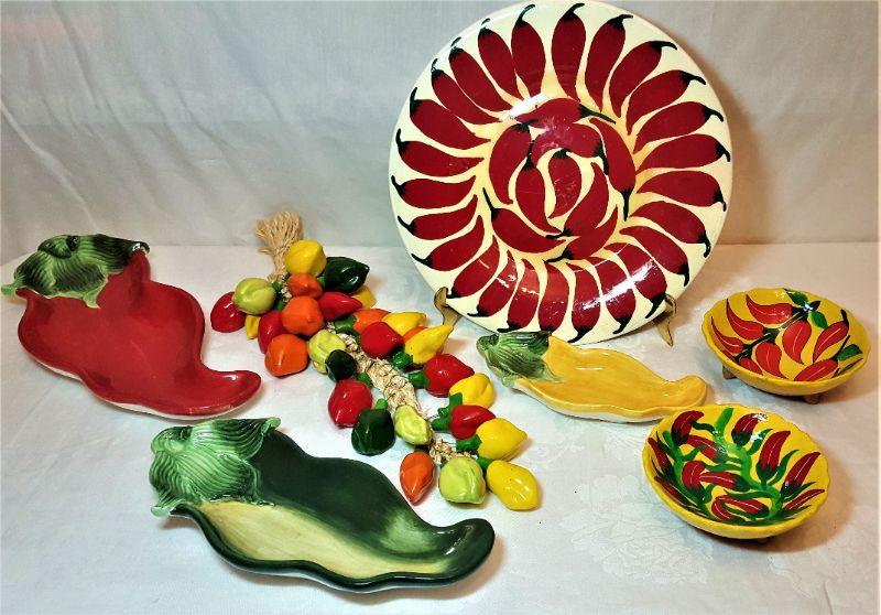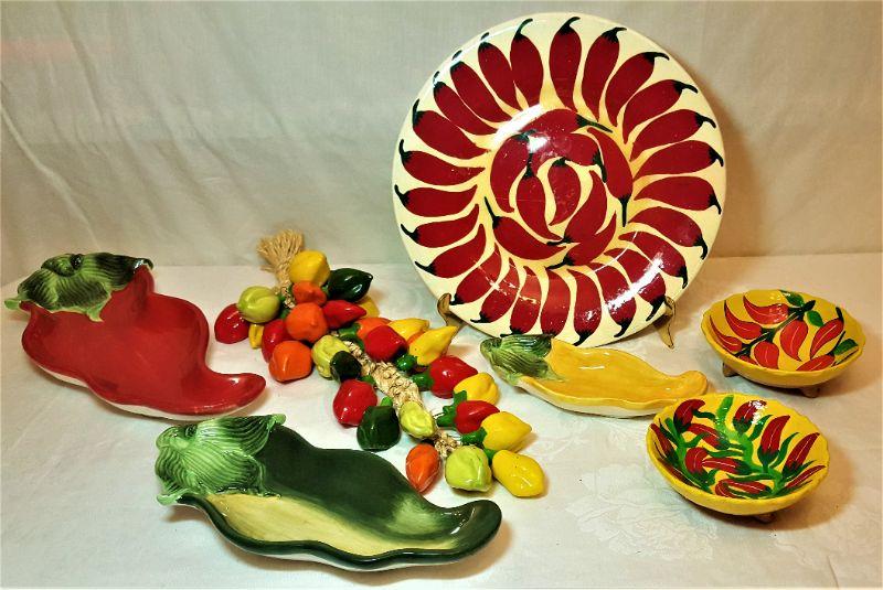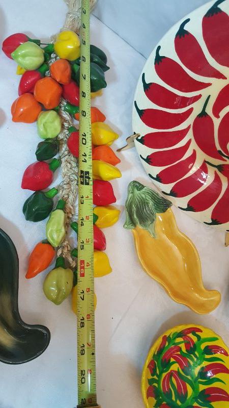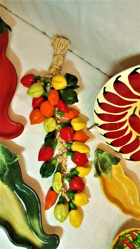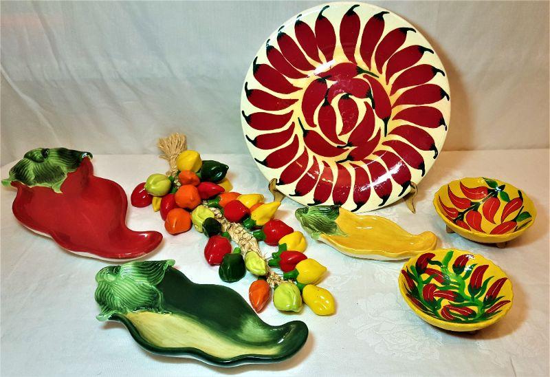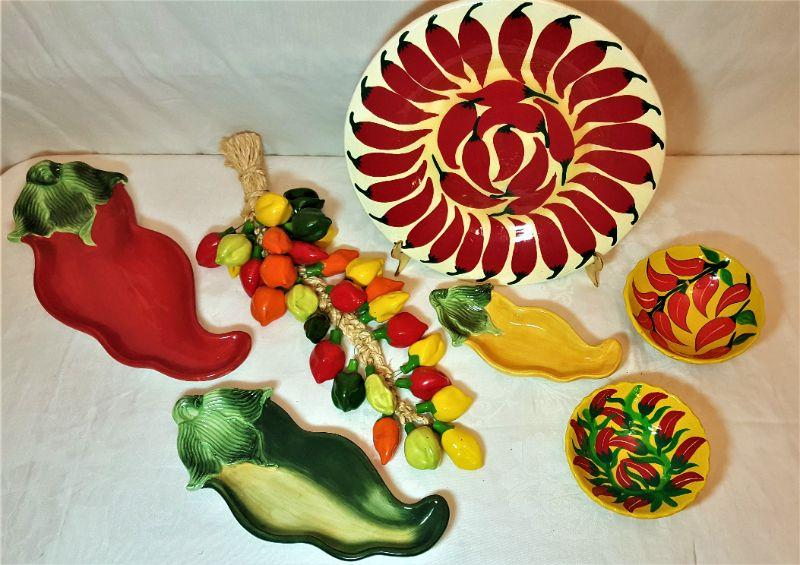 7 Piece Ceramic Chili Pepper Home Decor. Includes Chilies on Rope, 2 x Large Serving Dishes, 1 x medium Serving Dish, 2 x Footed Chili Pepper Bowl, 11" Wall Plate. In Good Condition.