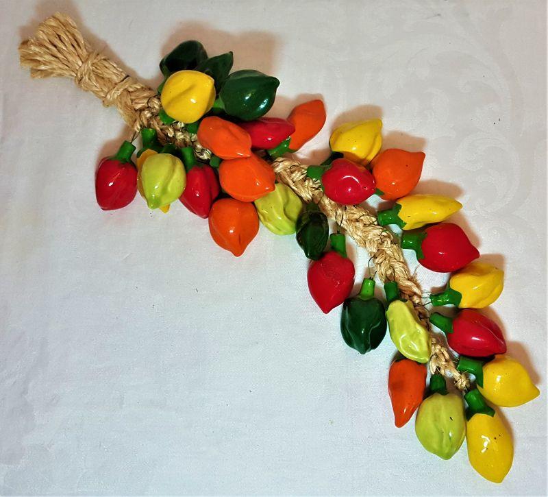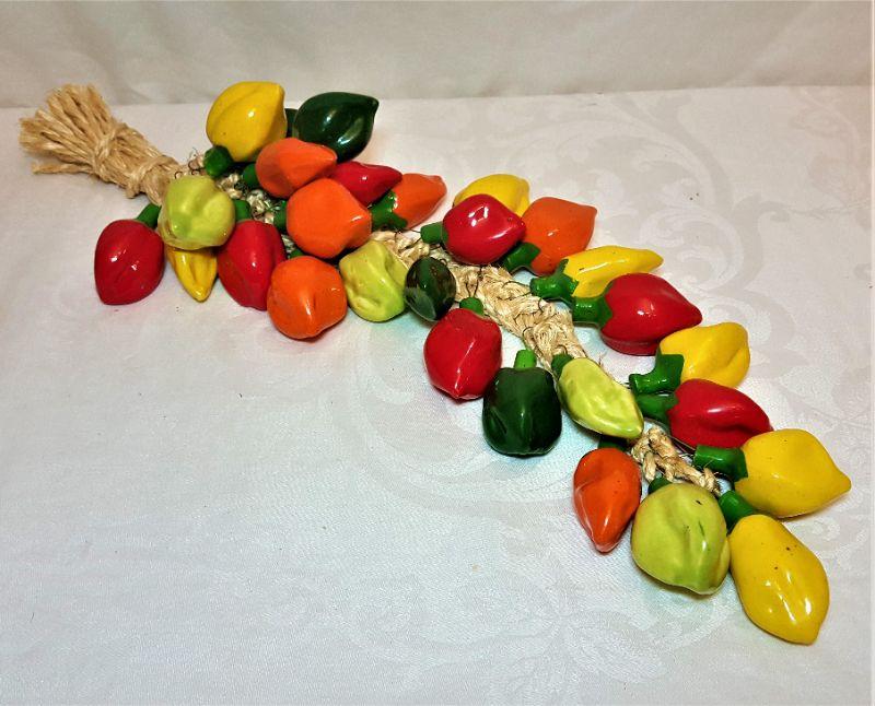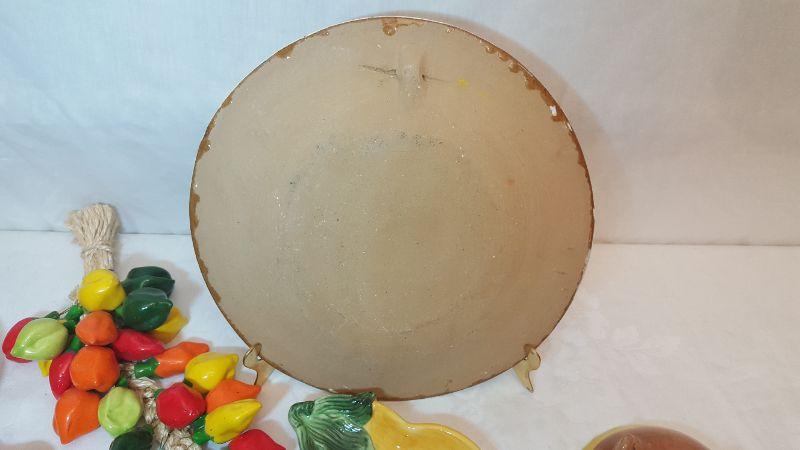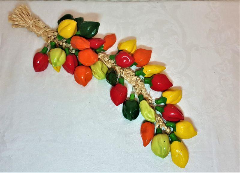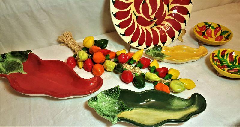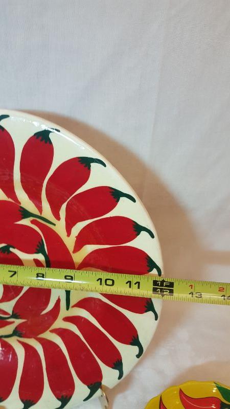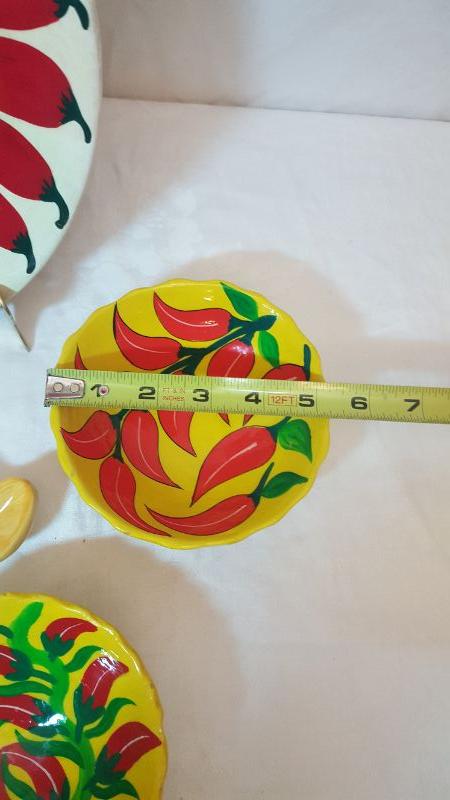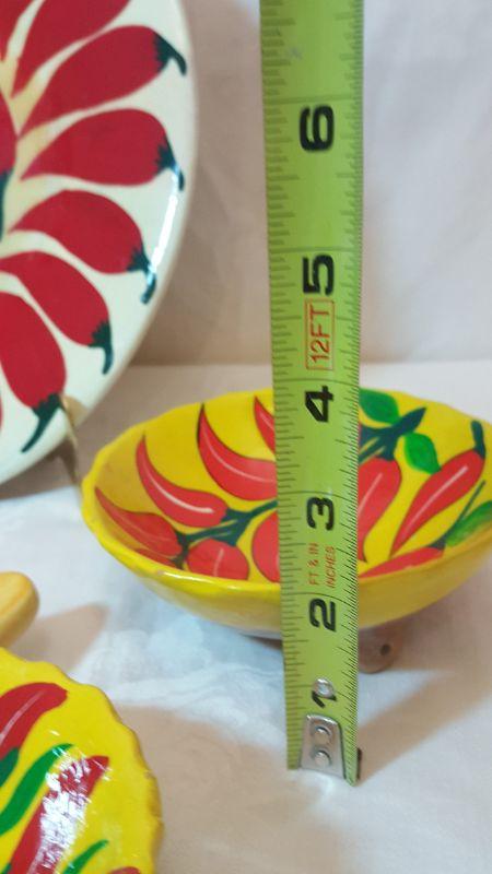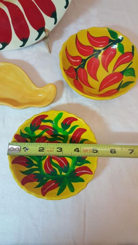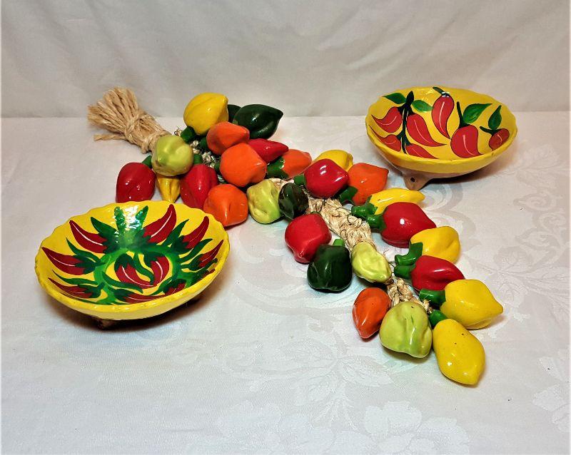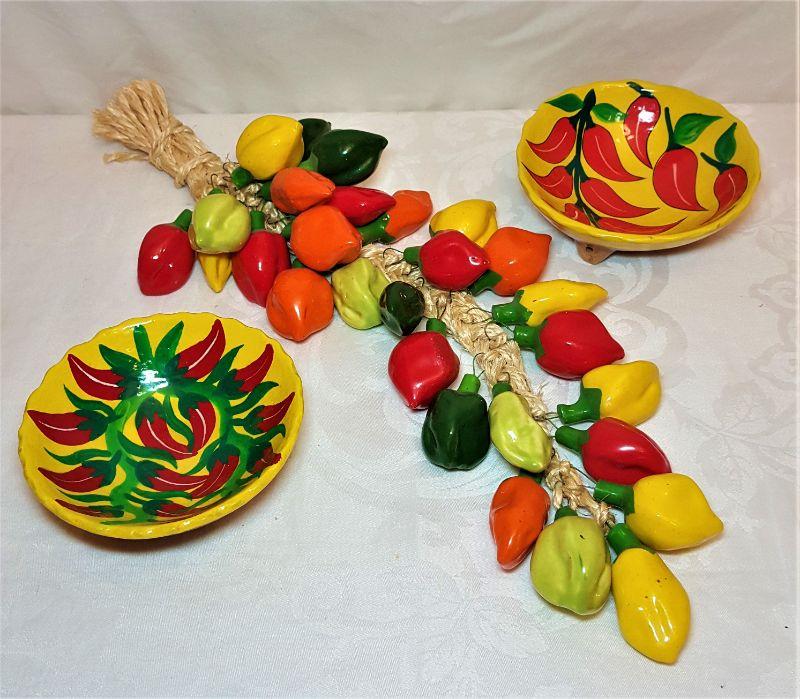 7 Piece Ceramic Chili Pepper Home Decor. Includes Chilies on Rope, 2 x Large Serving Dishes, 1 x medium Serving Dish, 2 x Footed Chili Pepper Bowl, 11" Wall Plate. In Good Condition.