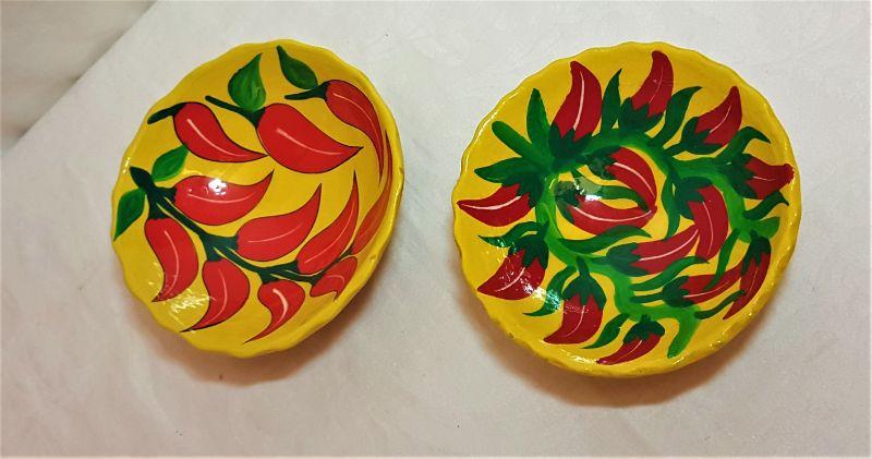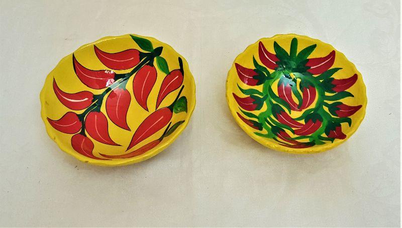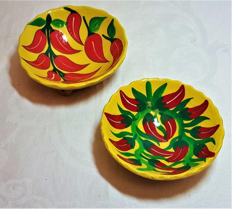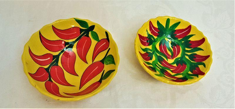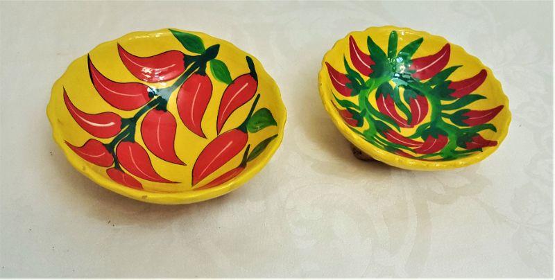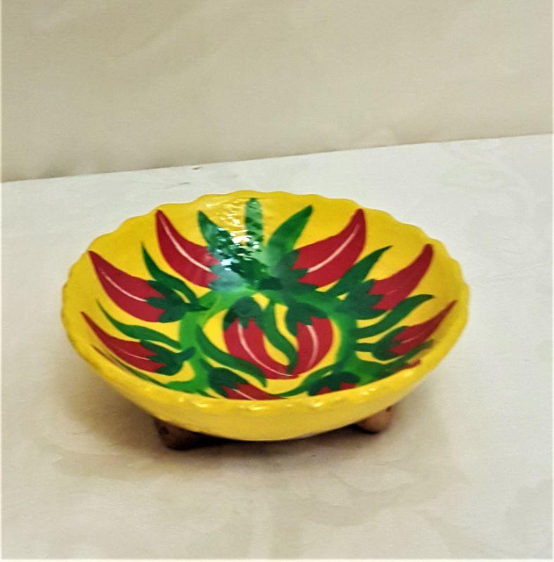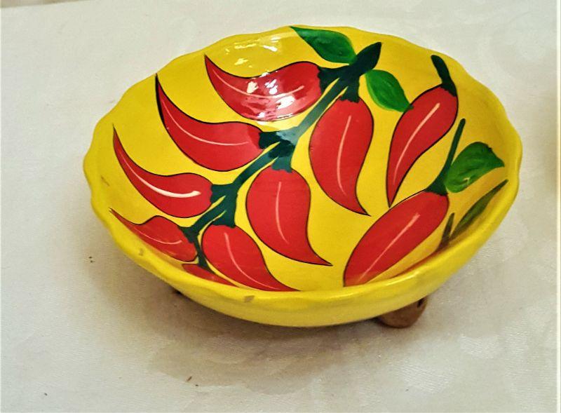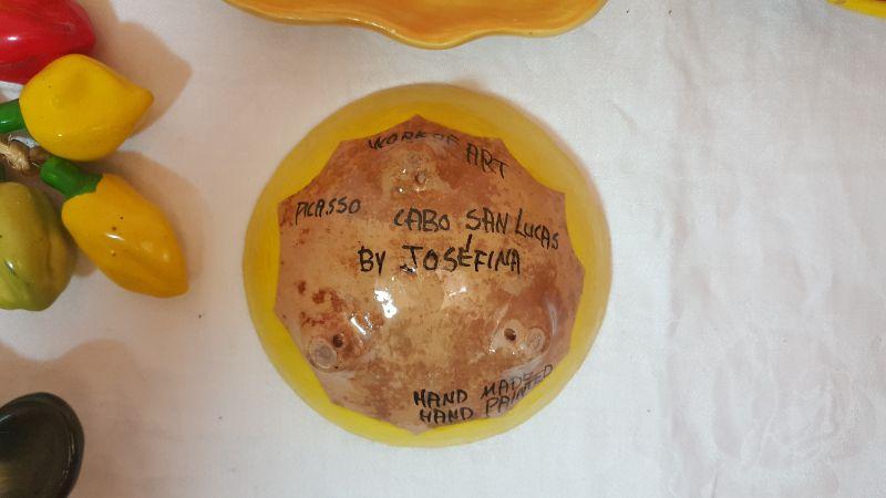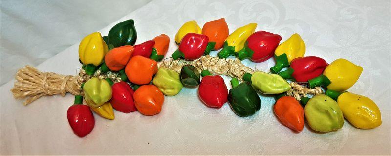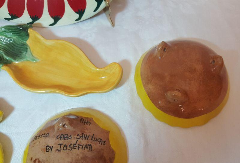 7 Piece Ceramic Chili Pepper Home Decor. Includes Chilies on Rope, 2 x Large Serving Dishes, 1 x medium Serving Dish, 2 x Footed Chili Pepper Bowl, 11" Wall Plate. In Good Condition.
