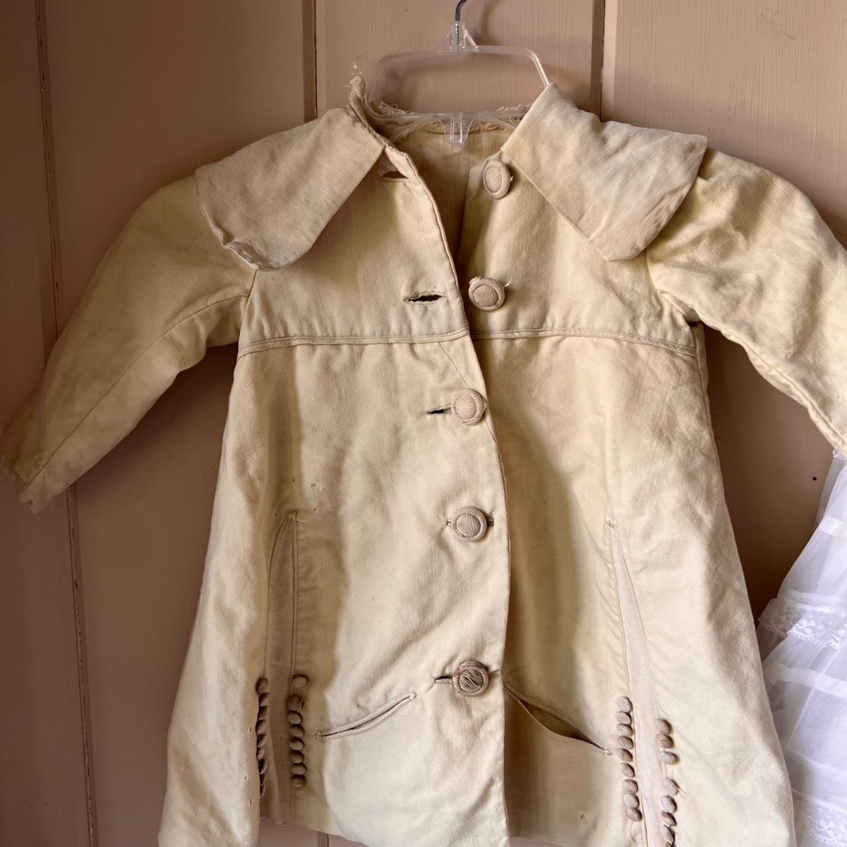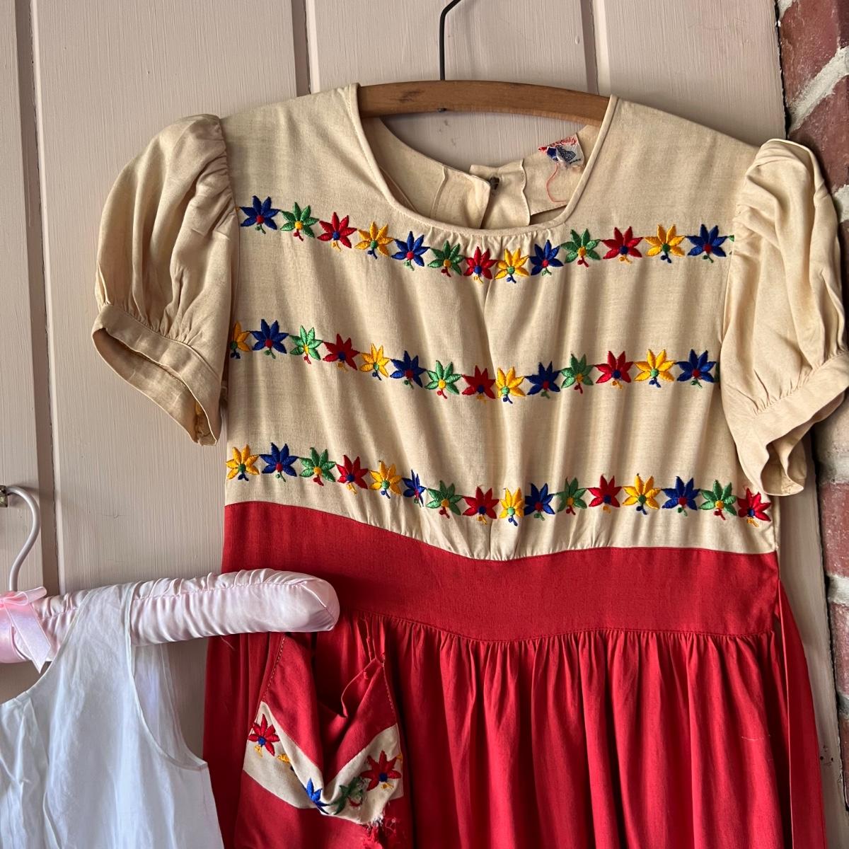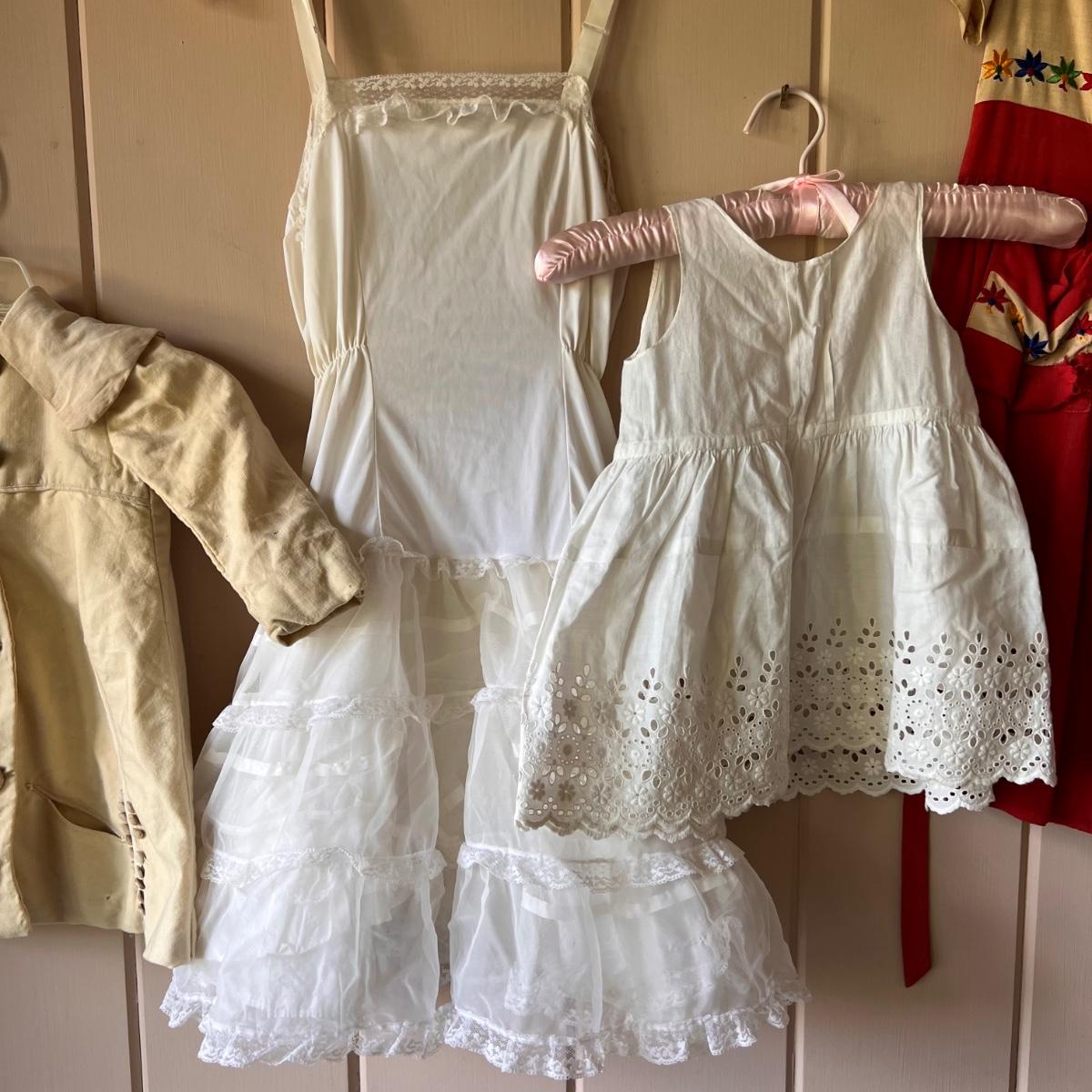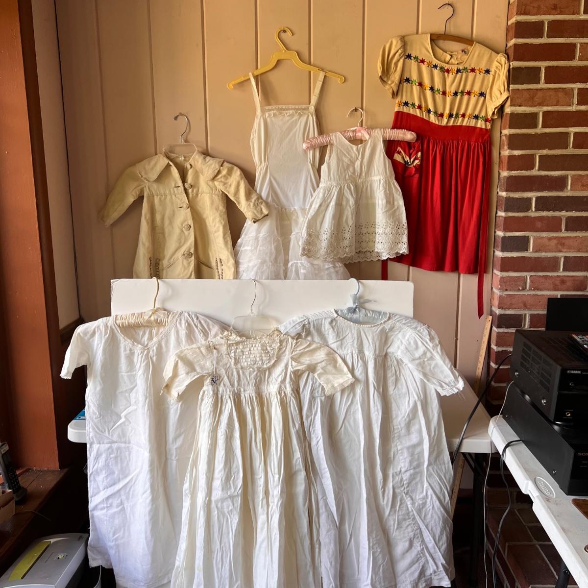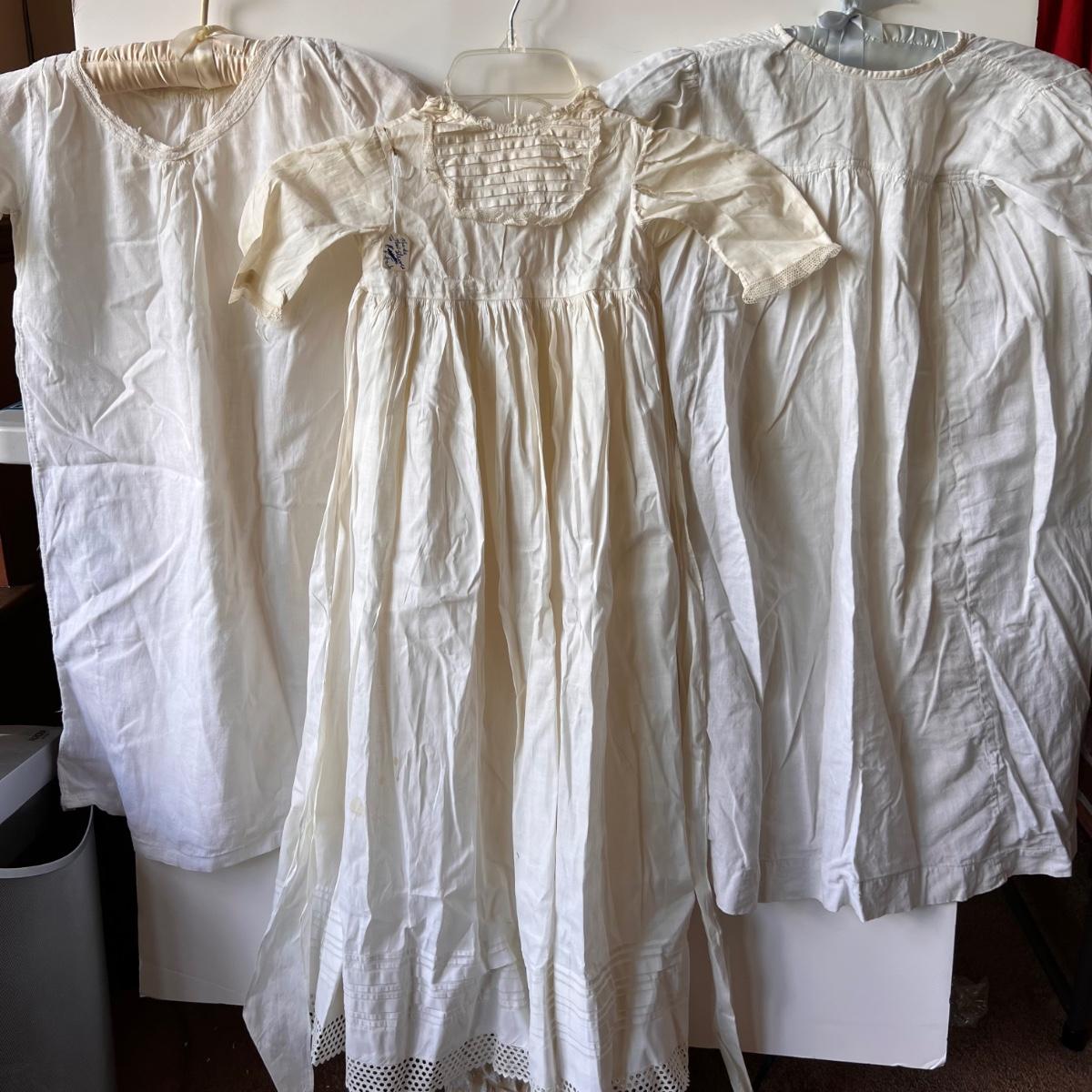 Antique baptismal dresses, white coat has wear, slip is perfect, red skirted dress has tear on pocket