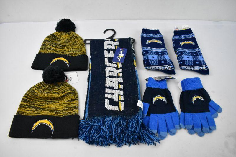 7 Piece NFL Chargers Cold Weather Wear: Hats, Scarf, Socks, Gloves - New