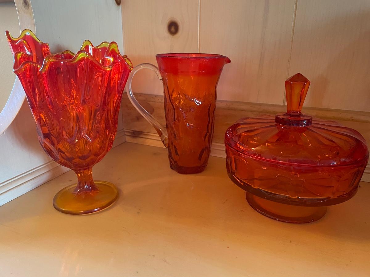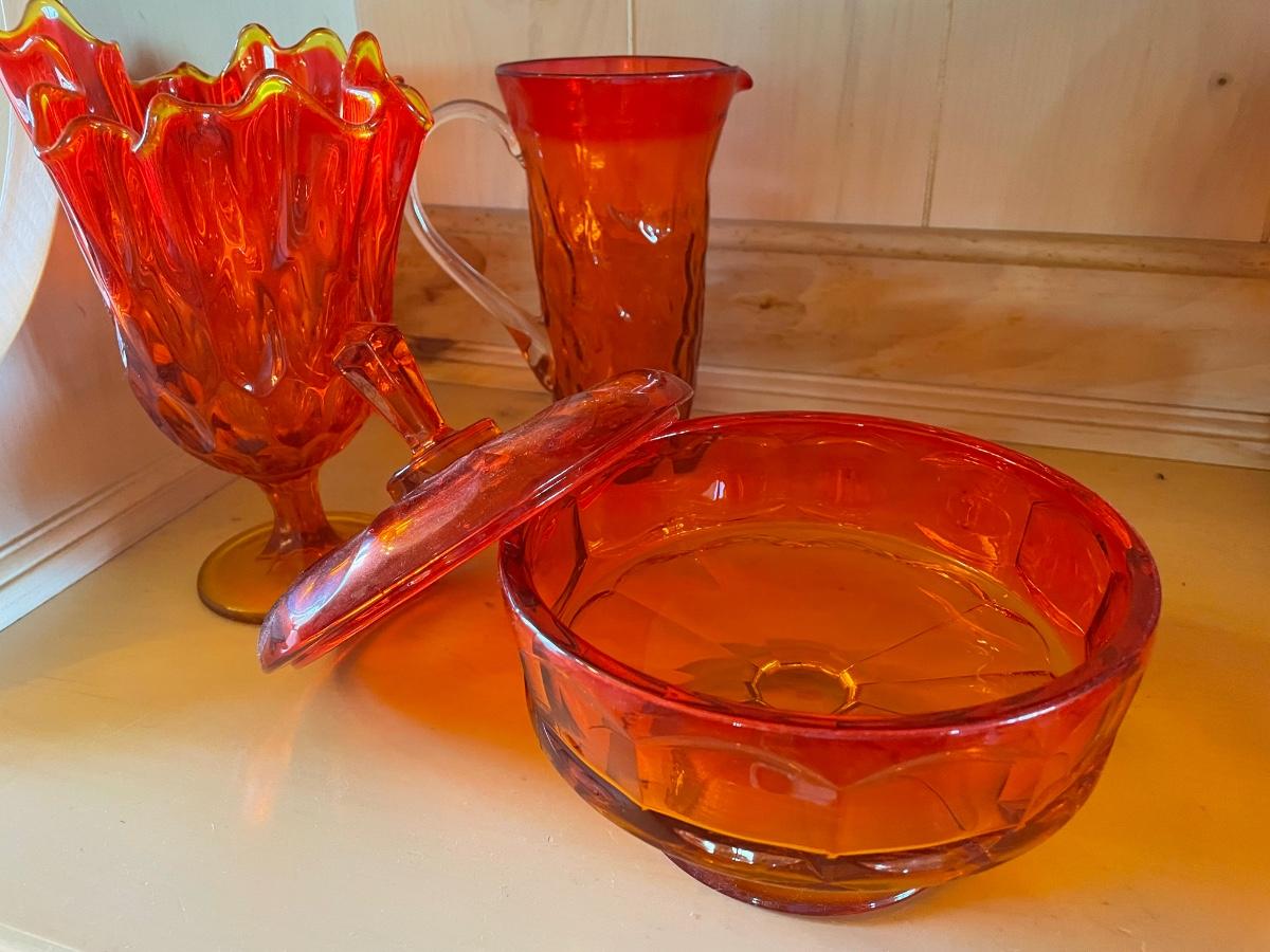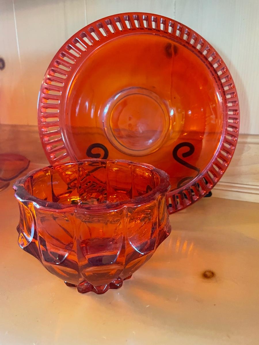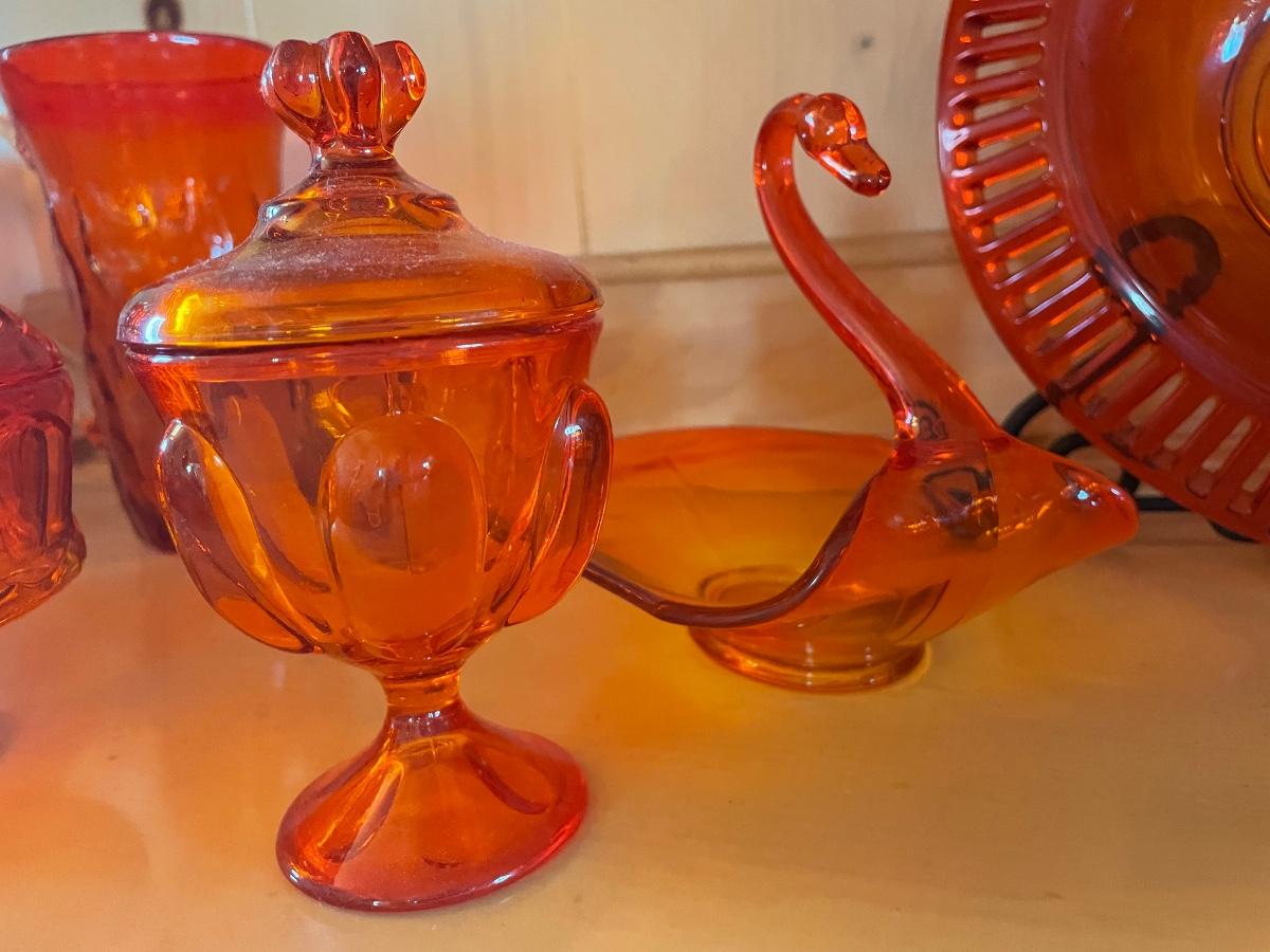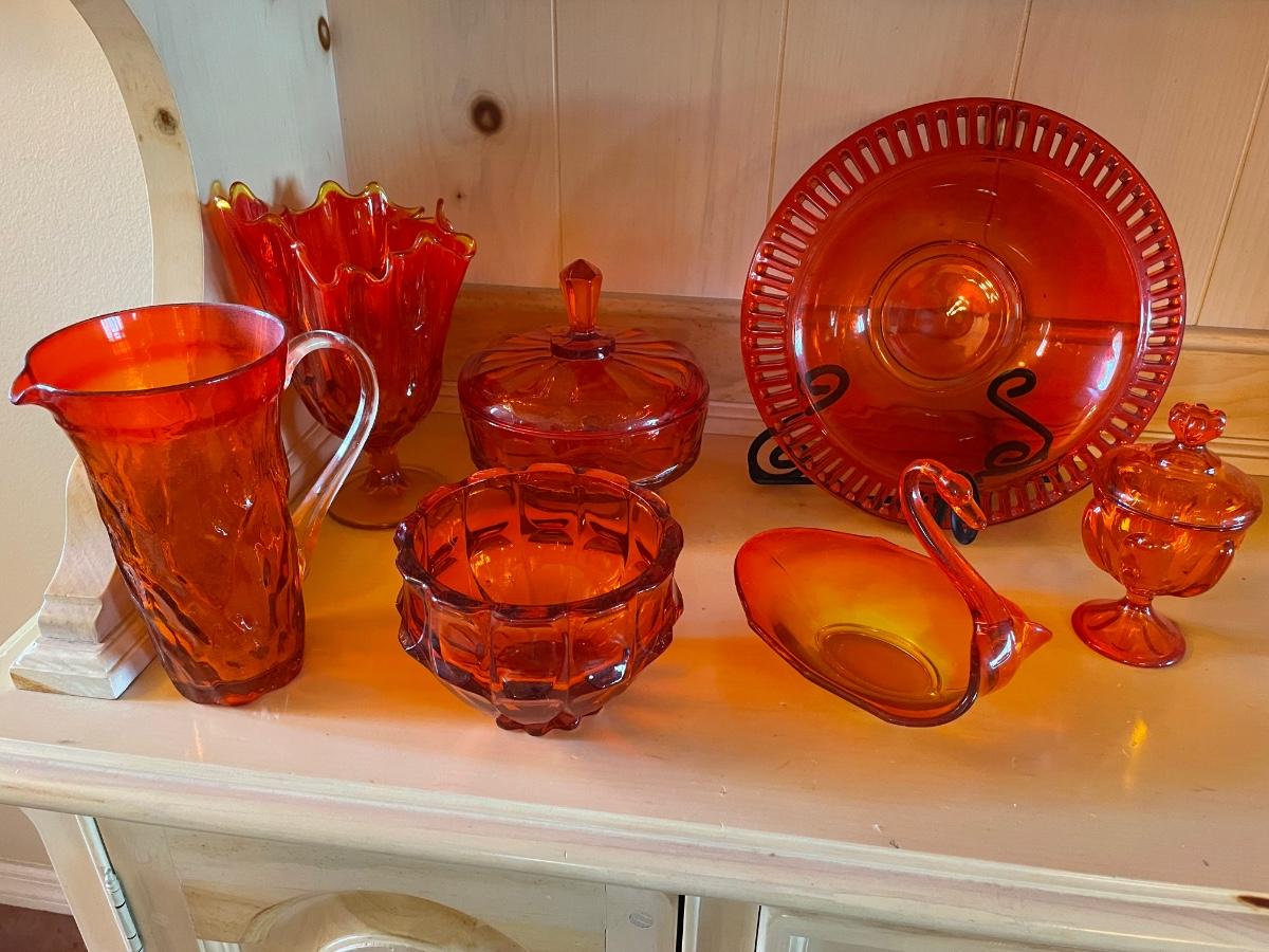 7 piece orange glass lot. All pieces have been checked over and there are no chips, cracks or repairs on any of the pieces.