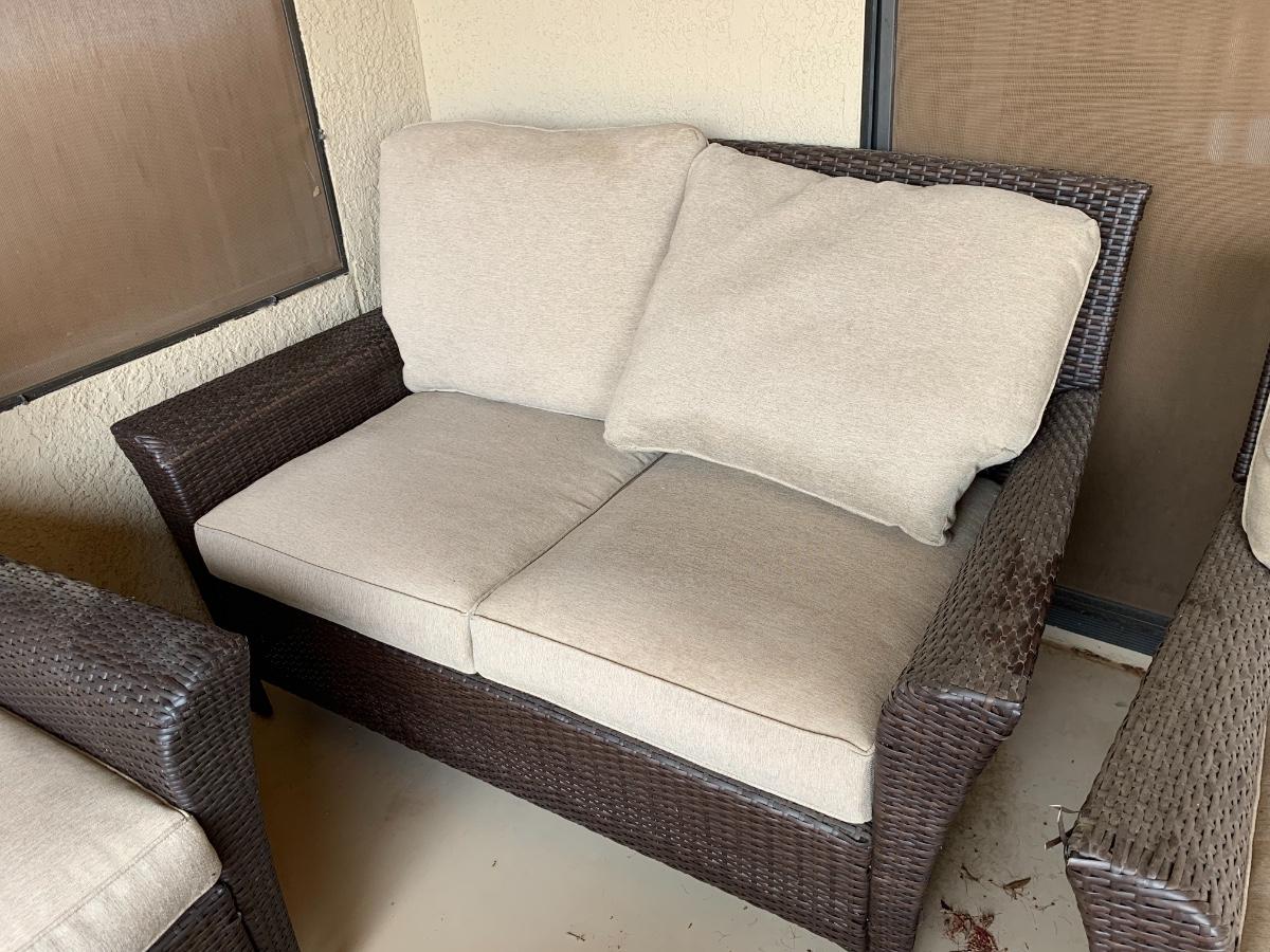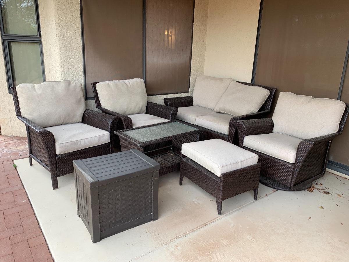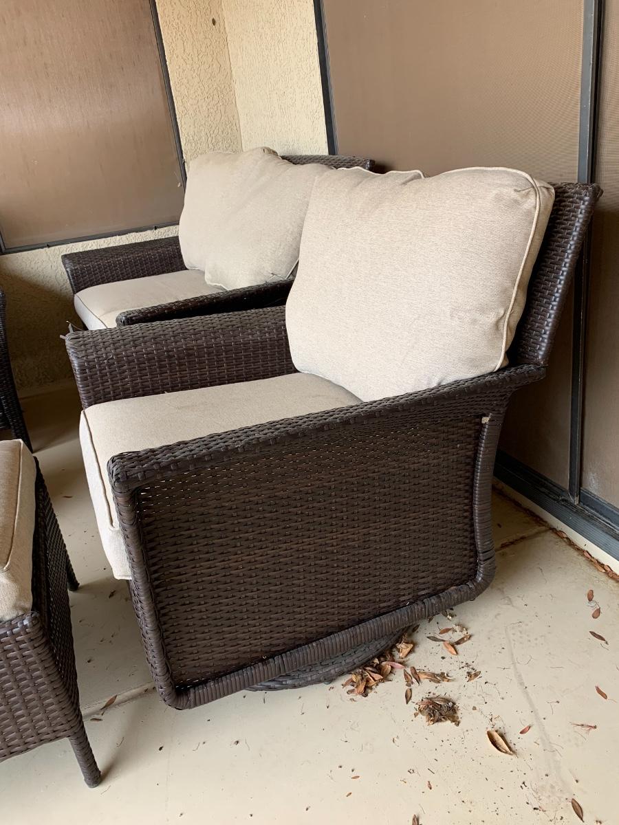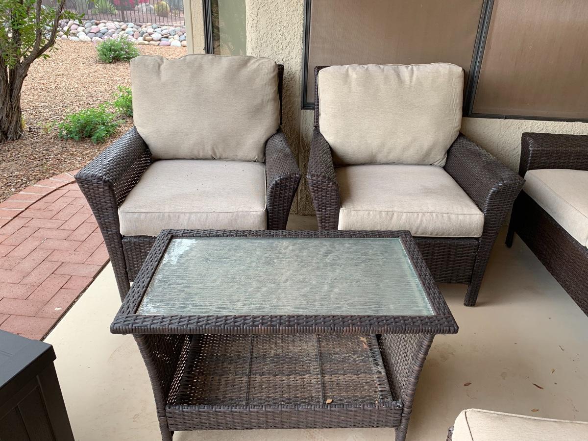 Gorgeous nearly brand new 7 piece patio set in excellent condition. Perfect to spruce up your backyard space just in time for Tucson’s hot months! (Love seat, 56 inches in length, 30 inches in depth), (each chair, 33 1/2 inches in length, 30 inches in depth), (table, 34 inches in length, 20 inches in width, 20 1/2 inches in height).