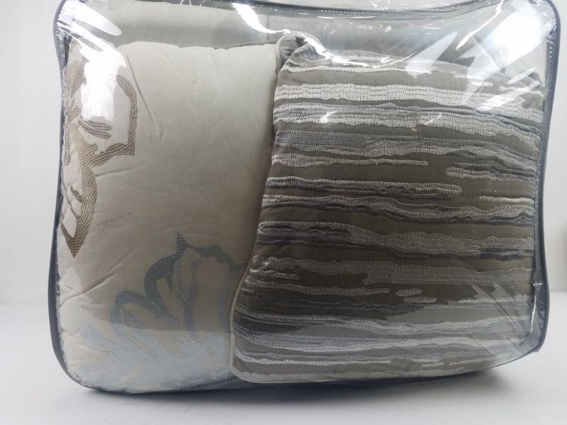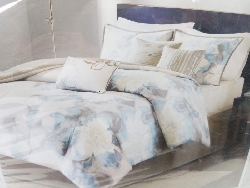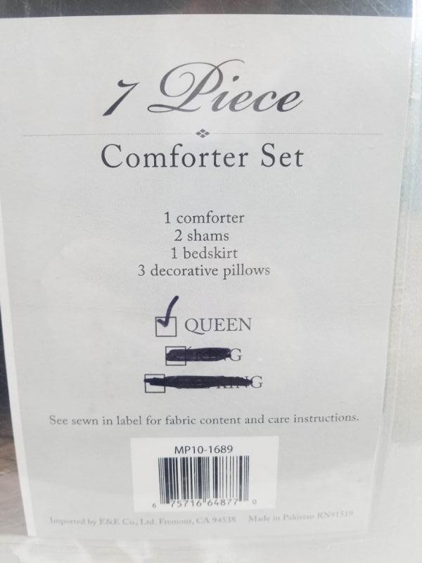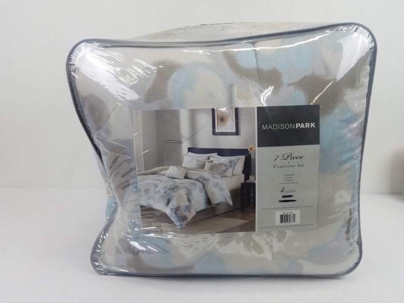 7 piece Queen Size Comforter Set by Madison Park Blue/White/Gray/Taupe - New