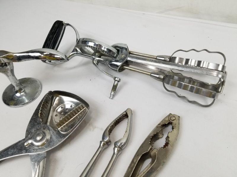 7 Piece Vintage Kitchen Gadgets: Mixer, Garlic Press, Nutcrackers, Olive Pitter
