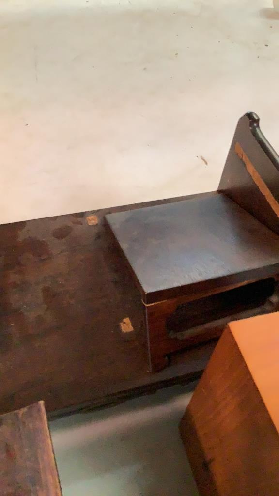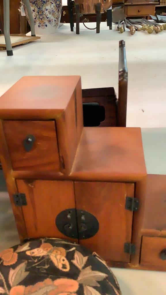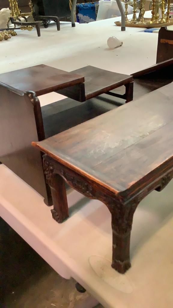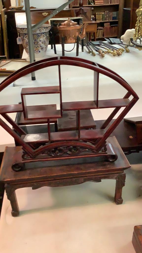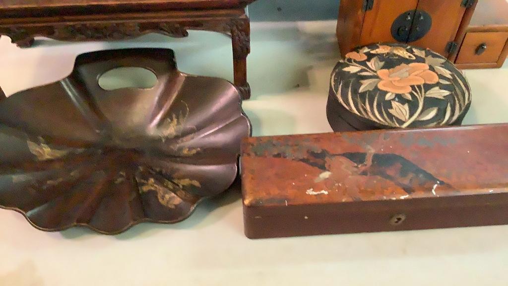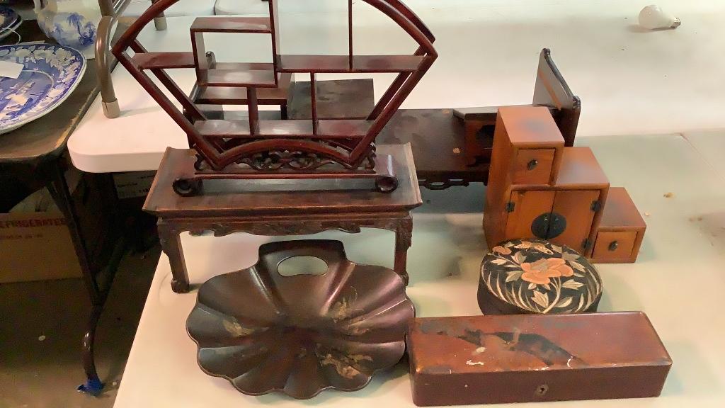 Lacquer Table box, Shell form dish or cumber, round cloth covered box, tiered jewelry box, fan shaped display shelf, carved alter stand, display shelf* damage to one side Line Item # 62