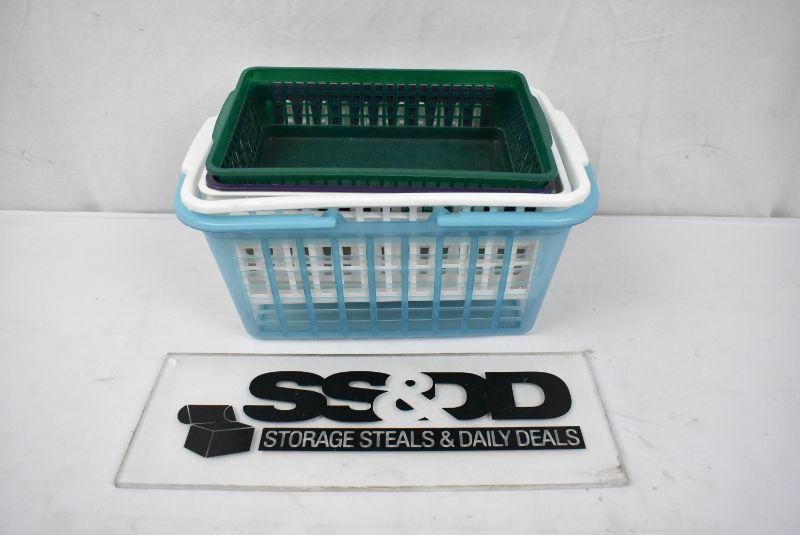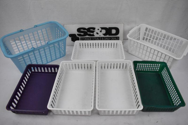 7 Plastic Baskets: Blue, Green, Purple, 4 White