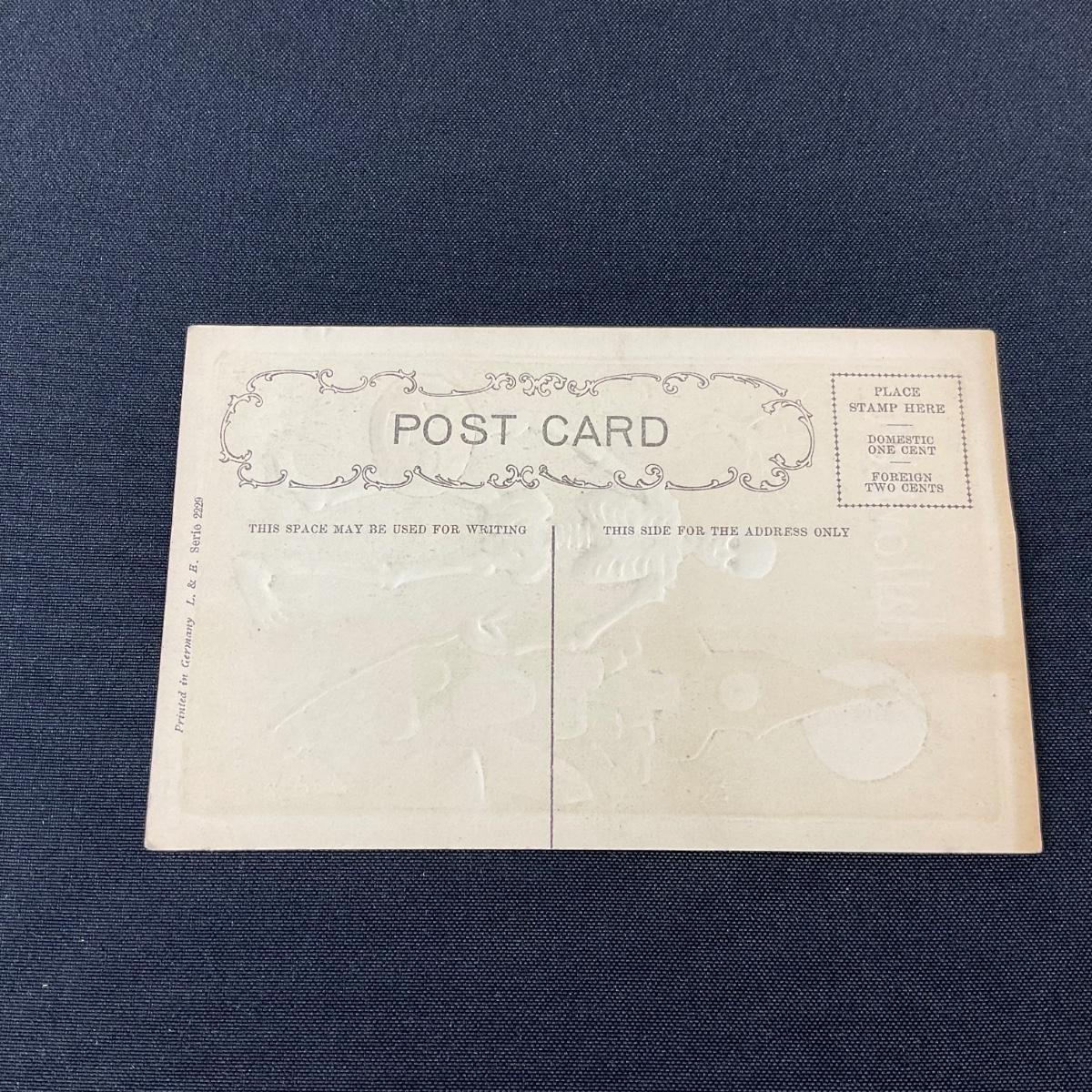 One vintage Halloween spooky skeleton postcard. Please see photos for details and condition. Any condition statement is given as a courtesy to a client, is an opinion, and should not be treated as a statement of fact. Reference to condition written, oral or within a condition report shall not be regarded as a full account of condition and may not include all defects, alterations, or restorations. Absence of a condition report does not imply a lot is flawless or lacking imperfections or damage. Katherine’s Auction & Appraisal Service shall have no responsibility for any error or omission. Returns shall not be accepted on the basis of condition. ::: Shipping is available on this lot. If you require shipping you must let us know at the close of the auction. We will coordinate with you after the item has been won. Shipping fees will include insurance up to or exceeding the value of all items being mailed. If you have any questions regarding this lot please contact the auctioneer either via this website, by direct email or by phone. PICK UP TIMES and other important information can be found in the TERMS and DESCRIPTION of the auction. Please take a look for pertinent information. Thanks!