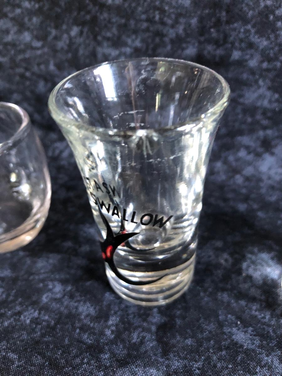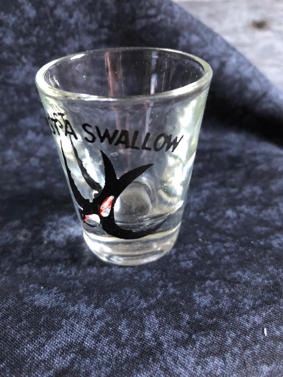 The tall just a swallow glass has a chip & a small crack“🦆see pic.