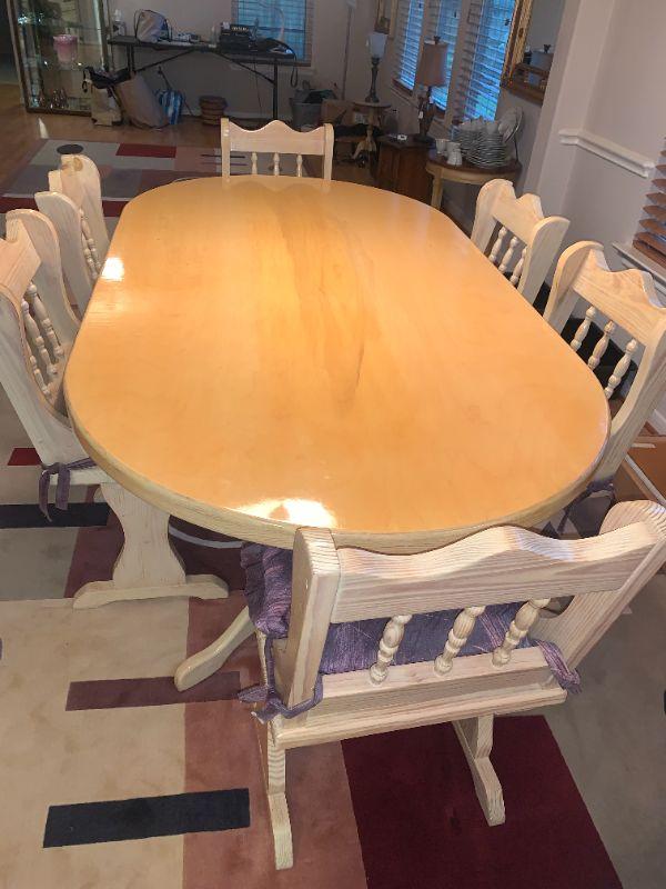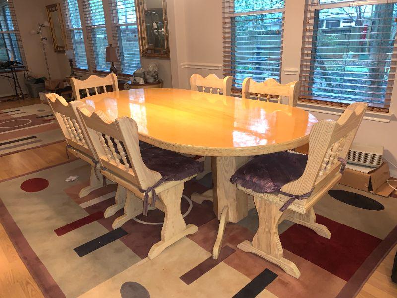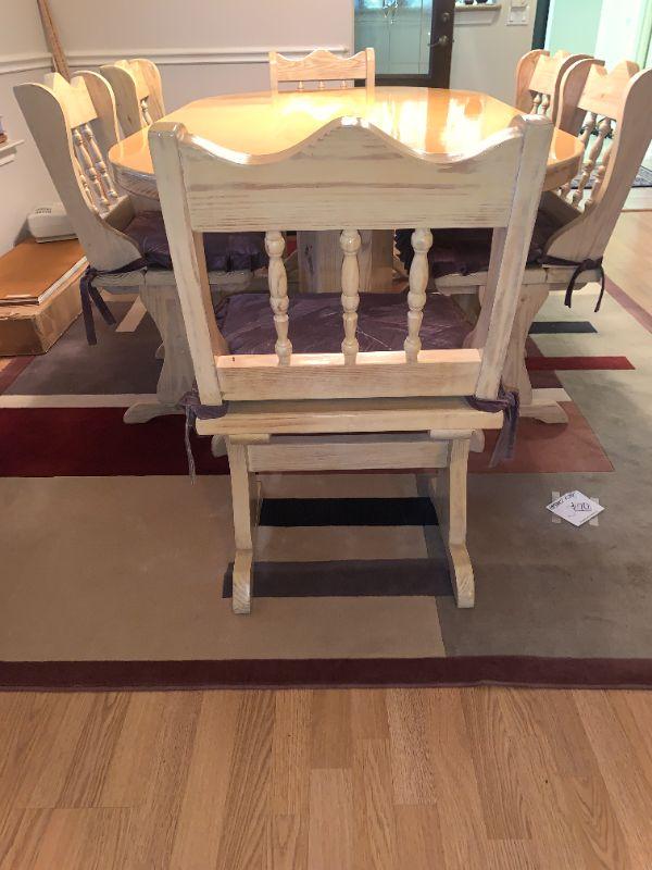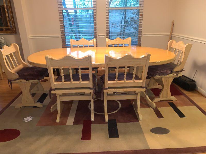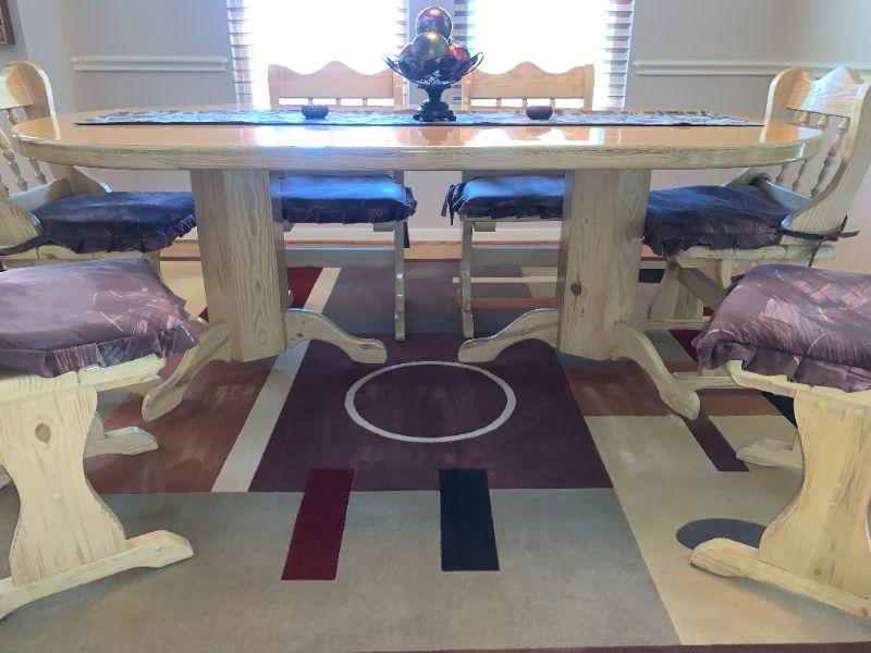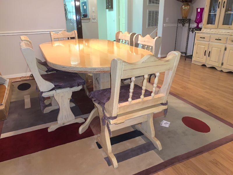 7' Solid Wood Farm Table with Double 5 Sided Pedestals, 6 Chairs. Table 44"W, 30" H