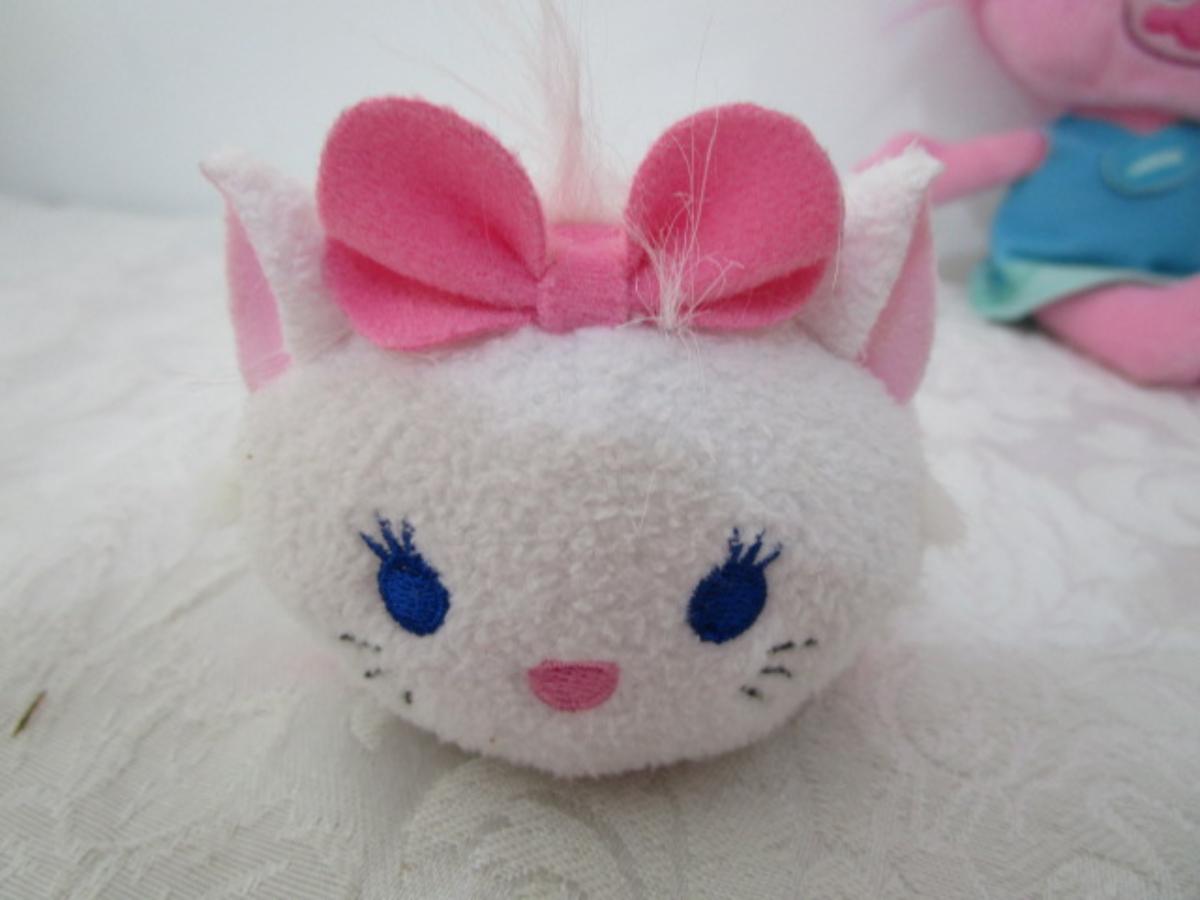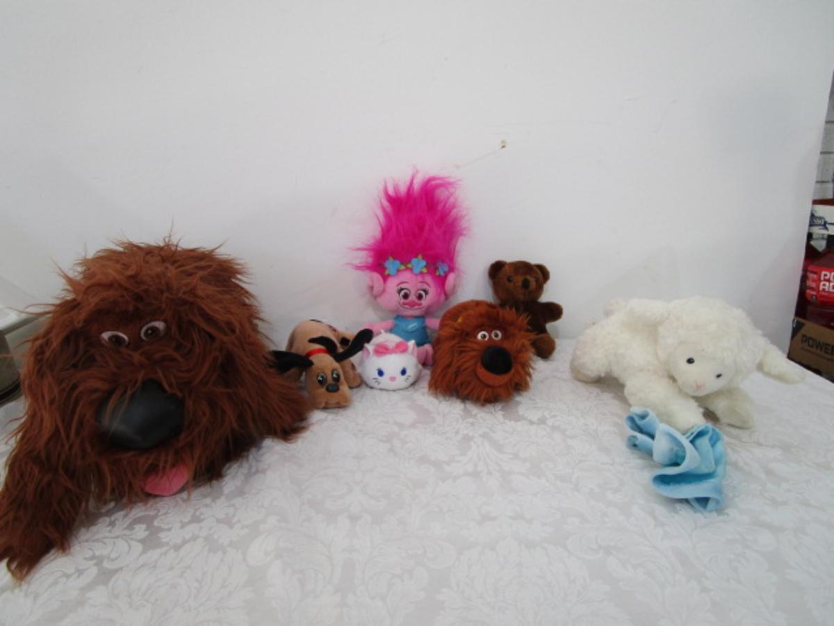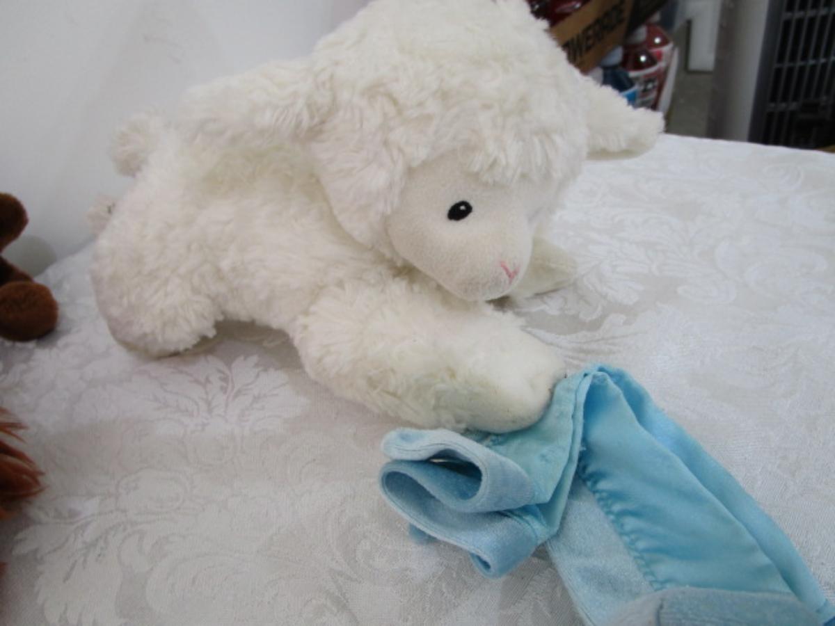 7 stuffed animals one of which is a talking Aristocat kitty, one is a praying lamb
