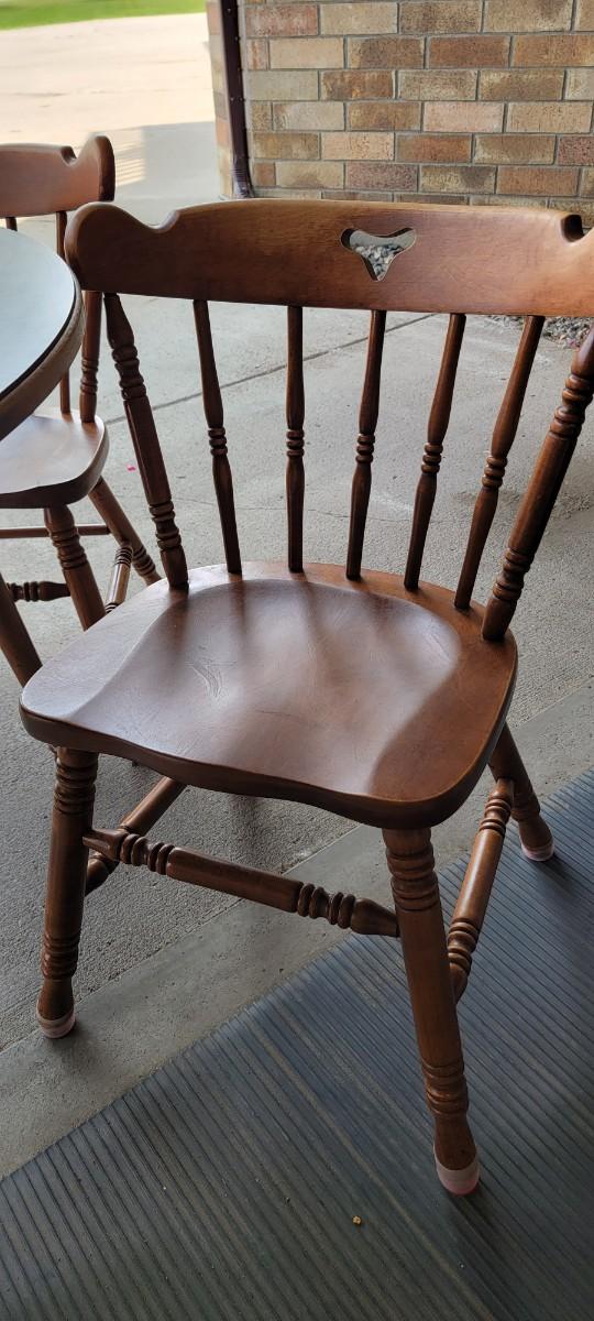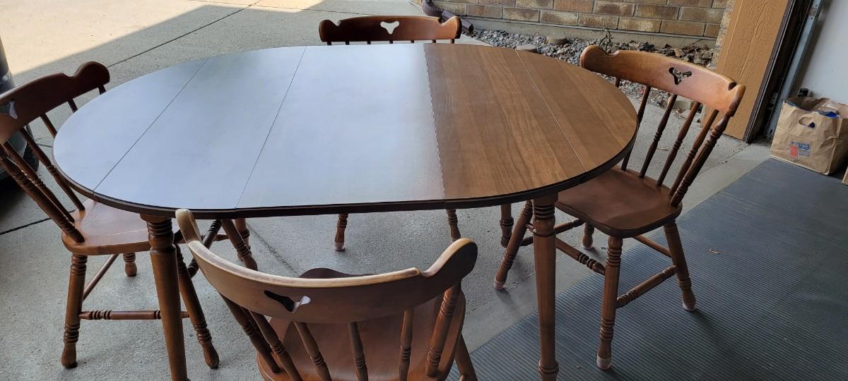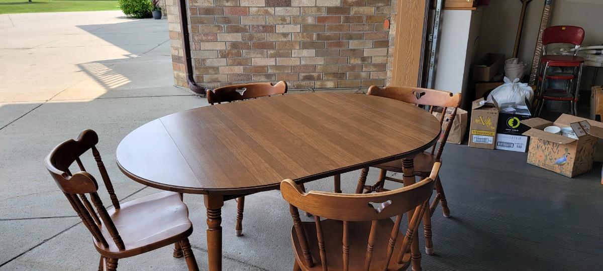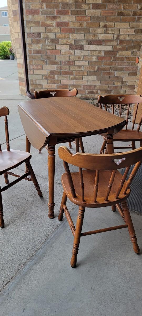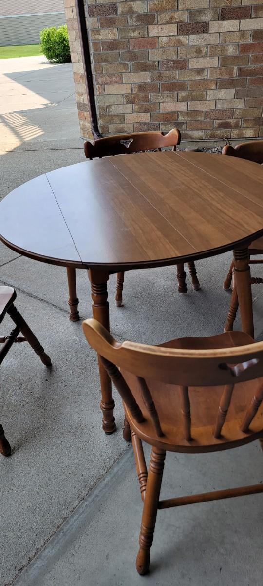 Table with leaf and from sides. Oval measures 41" x 57", round neasures 41", leaf measures 15.5" x 41". Plus four chairs.