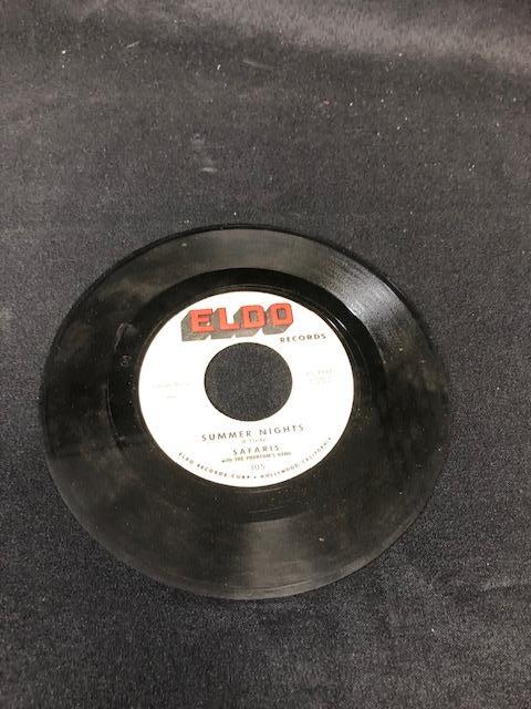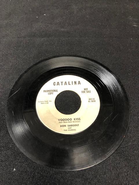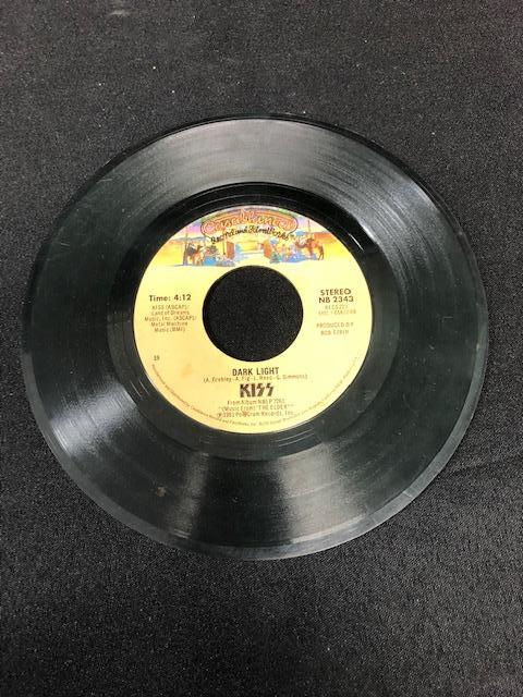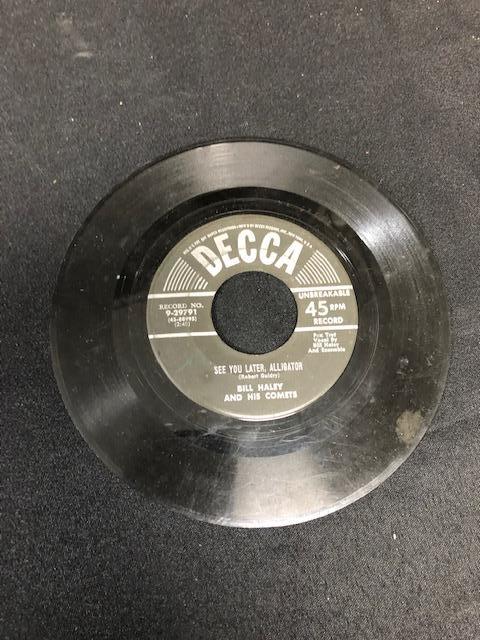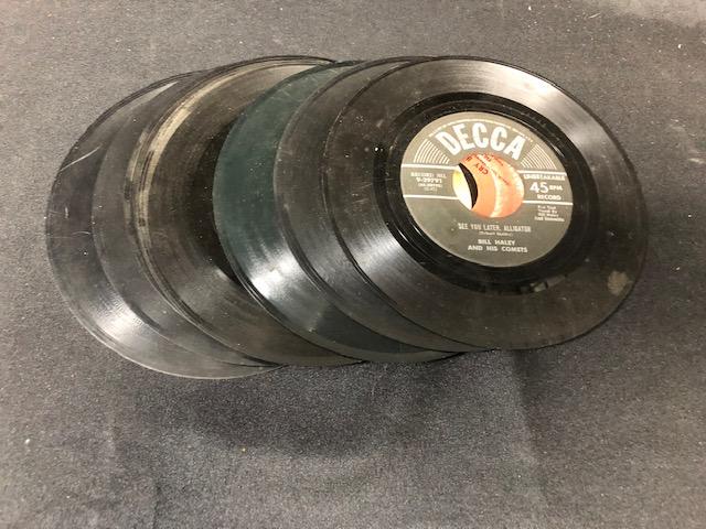 7 vintage 45's. Artists include Bill Haley and his Comets, Fireballs, KISS, Royal Monarchs, Safaris, Elvis, and Don Sargent. Untested, there are scratches and signs of use.