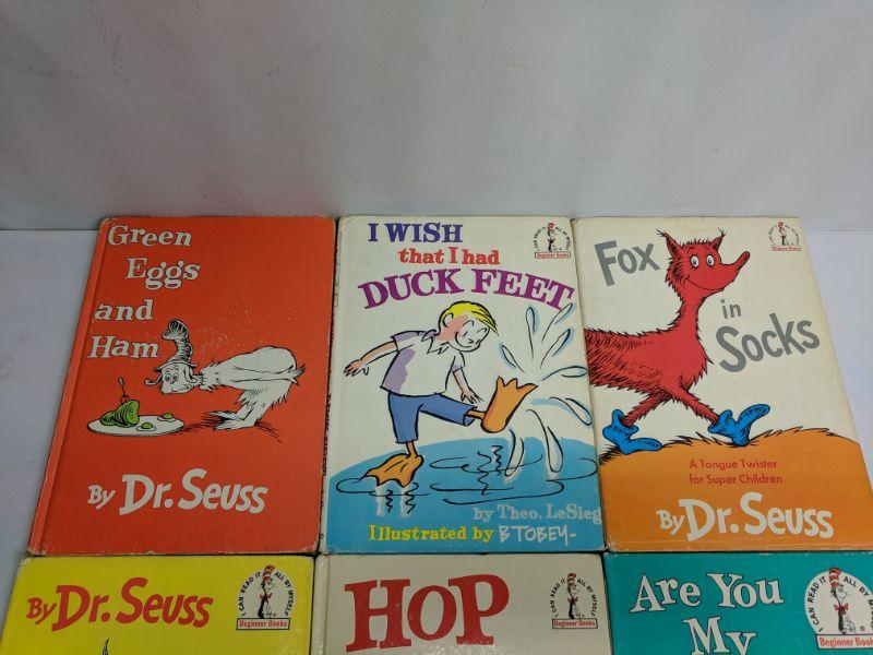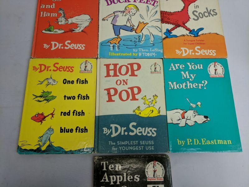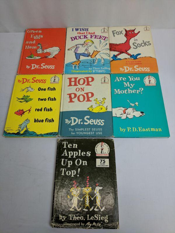 7 VIntage Dr. Seuss Books, Popular Titles Include: Green Eggs & Ham, Fox in Socks, I Wish I Had Duck Feet