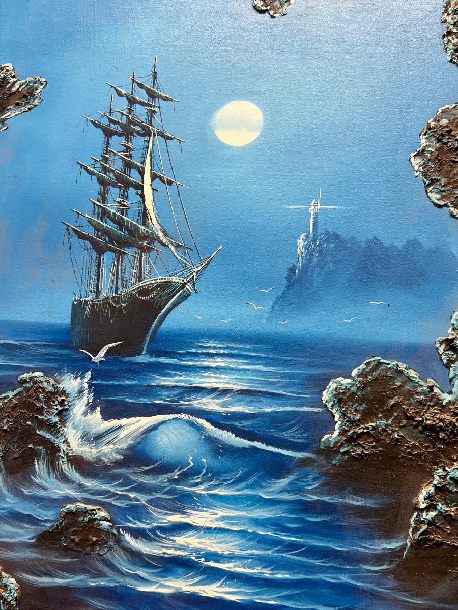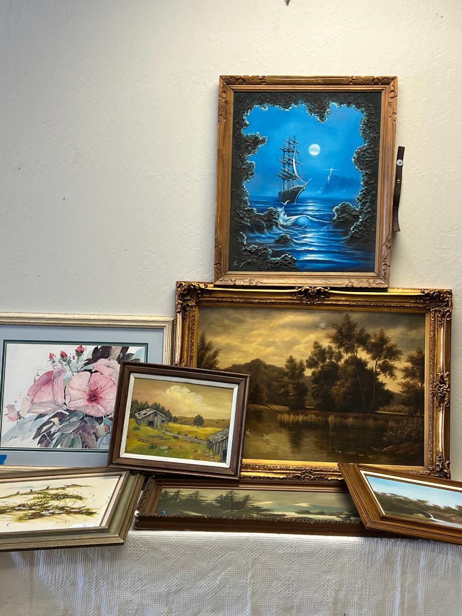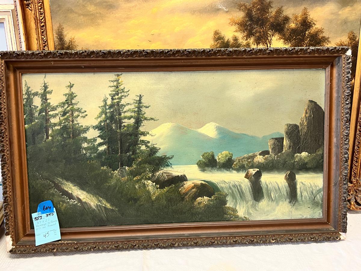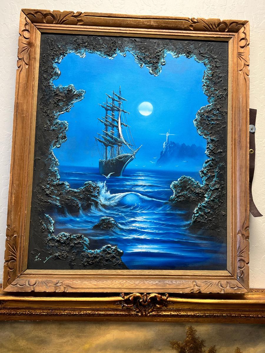 Blue Pirate ship viewed from a cave, is a vintage 1970s three dimensional that looks great from a distance. The very large pastoral oil painting is in a wonderful gold gilt frame that shows a small crack. I cannot find a signature. The waterfall painting's frame has wear. no shipping