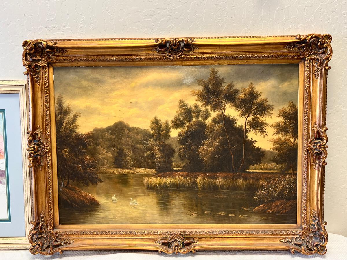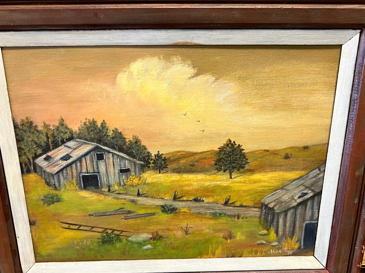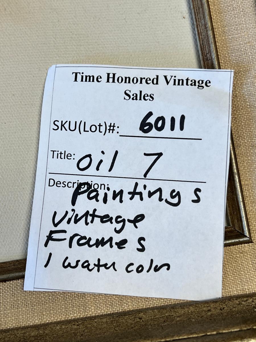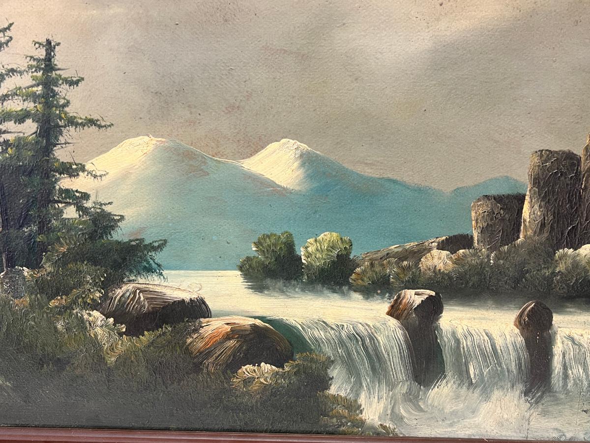 Blue Pirate ship viewed from a cave, is a vintage 1970s three dimensional that looks great from a distance. The very large pastoral oil painting is in a wonderful gold gilt frame that shows a small crack. I cannot find a signature. The waterfall painting's frame has wear. no shipping