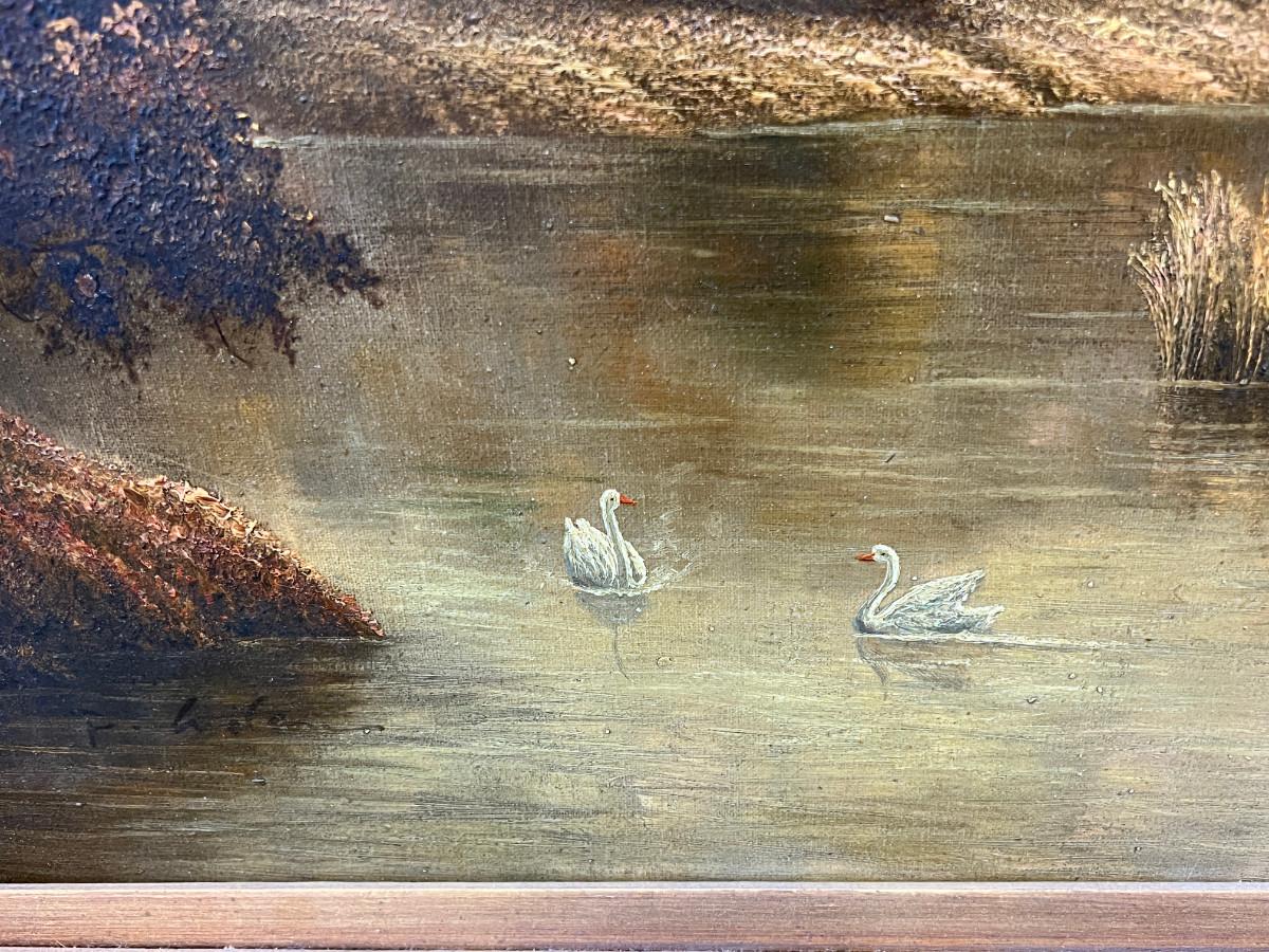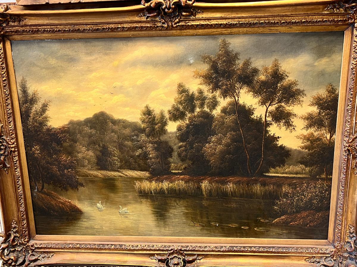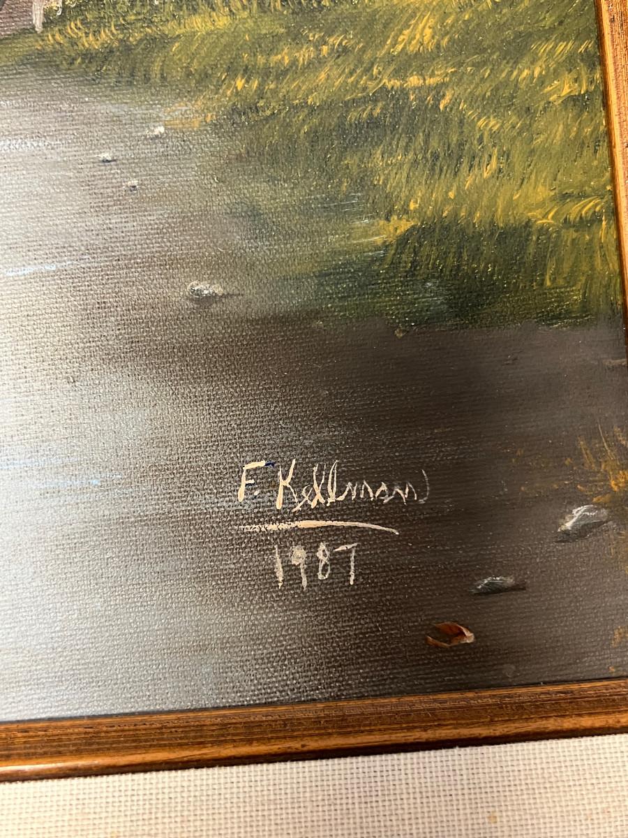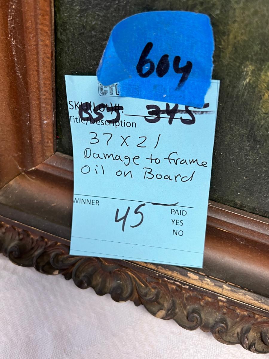 Blue Pirate ship viewed from a cave, is a vintage 1970s three dimensional that looks great from a distance. The very large pastoral oil painting is in a wonderful gold gilt frame that shows a small crack. I cannot find a signature. The waterfall painting's frame has wear. no shipping