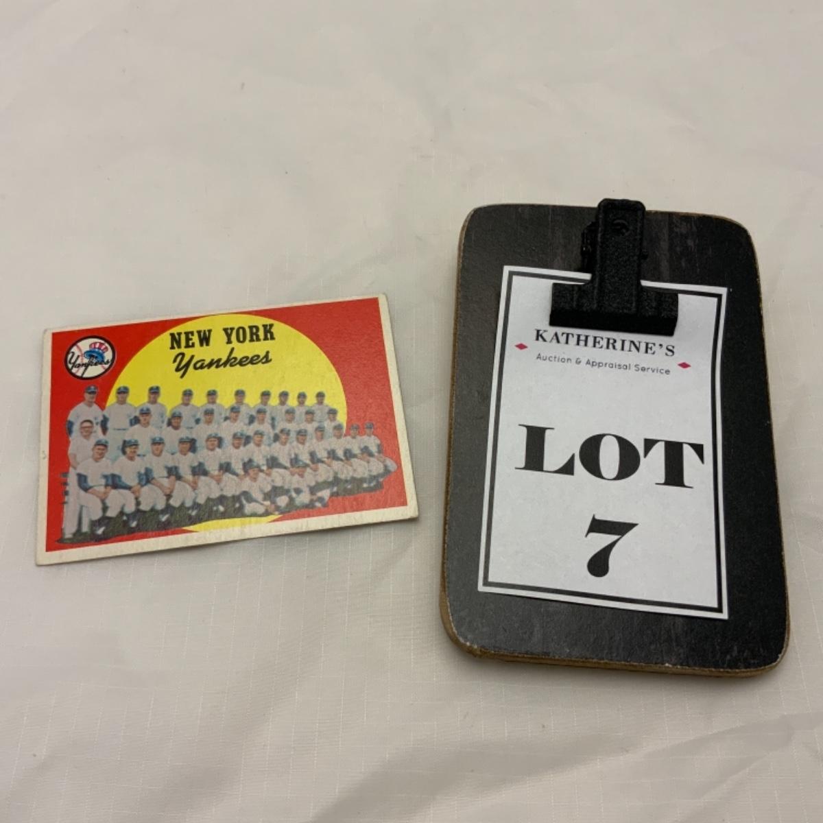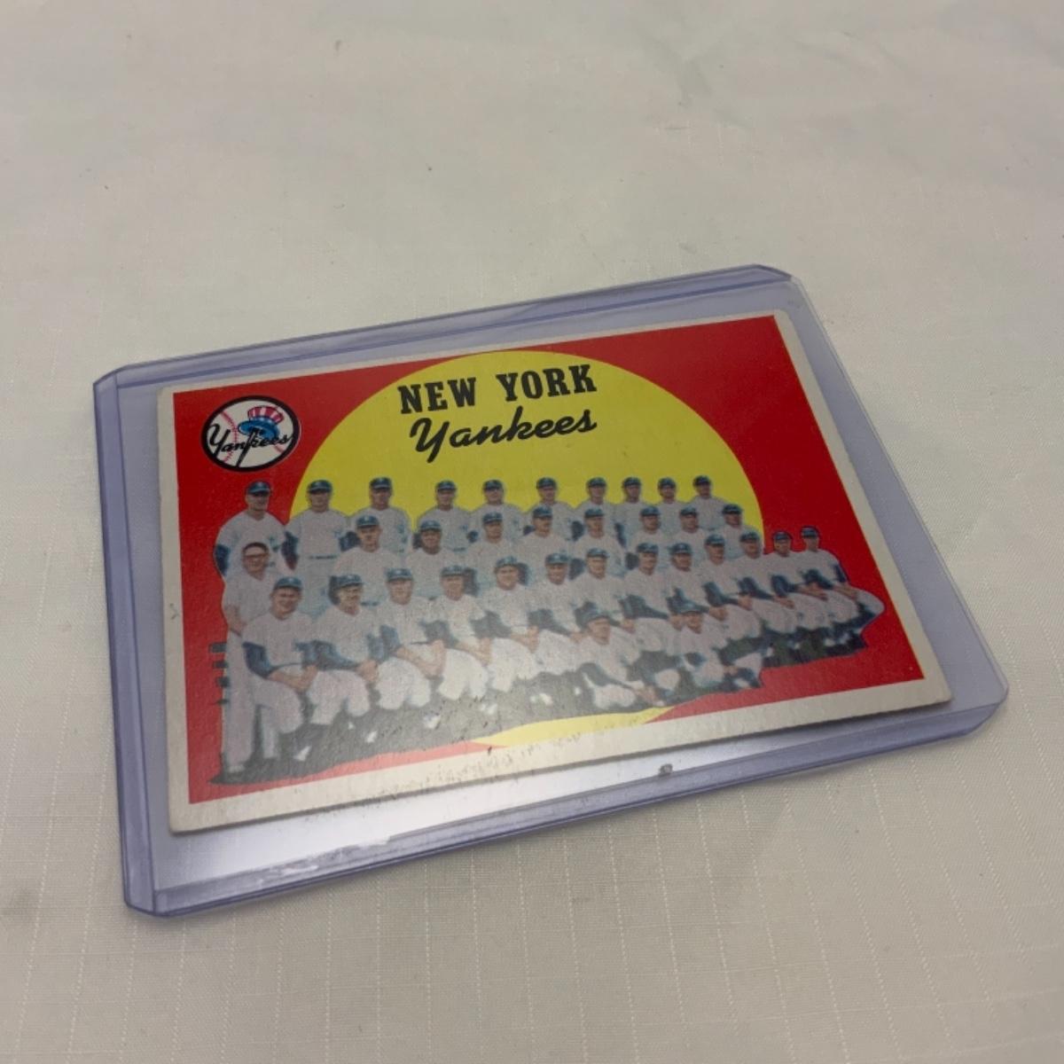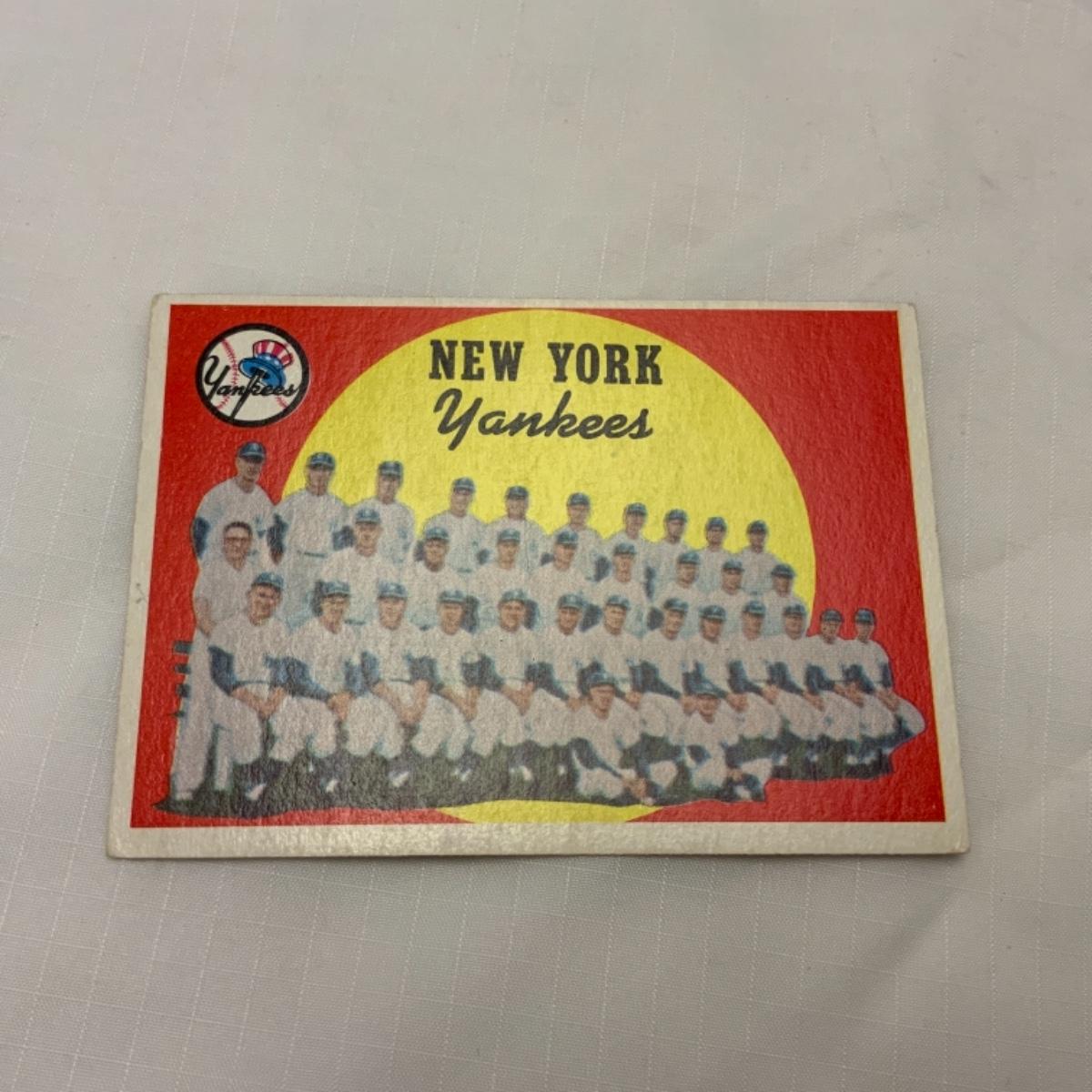 Vintage 1959 Series TOPPS Card #510. Card features the New York Yankees Team picture on the front and a checklist on the reverse. Some boxes have been filled in on the check list. Overall in excellent condition. Card includes players from the year including Mantle, Maris, Berra, Ford & Howard. Please see photos for details and condition. ::: Shipping is available on this lot. If you require shipping you must let us know at the close of the auction. We will coordinate with you after the item has been won. Shipping fees will include insurance up to or exceeding the value of all items being mailed. If you have any questions regarding this lot please contact the auctioneer either via this website, by direct email or by phone. PICK UP TIMES and other important information can be found in the TERMS and DESCRIPTION of the auction. Please take a look for pertinent information. Thanks!