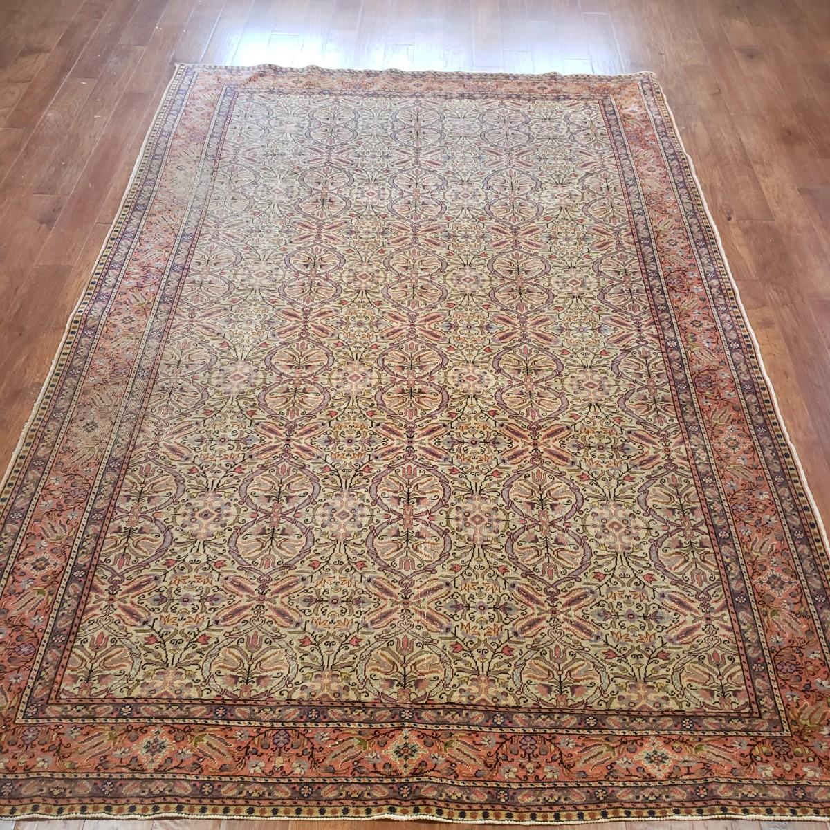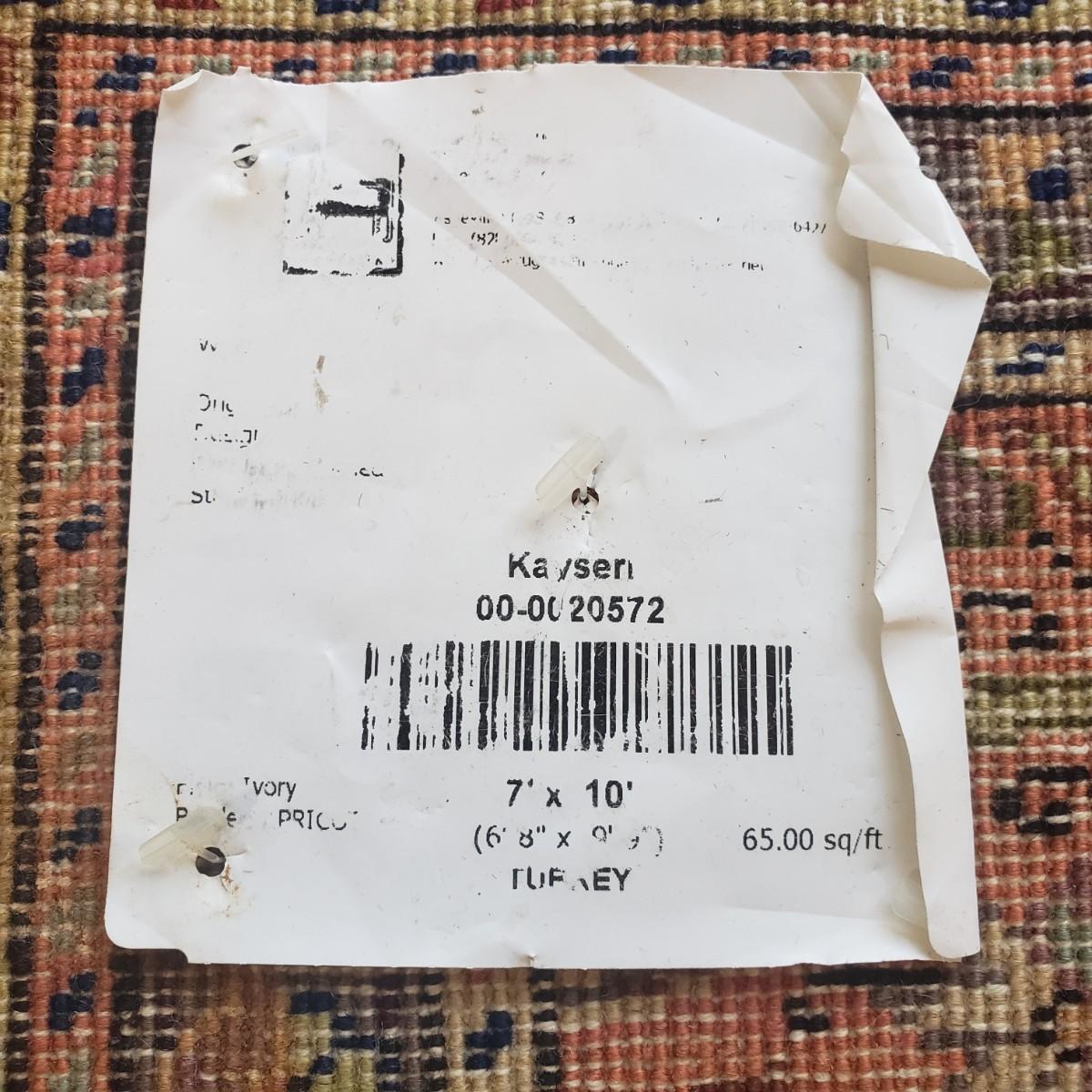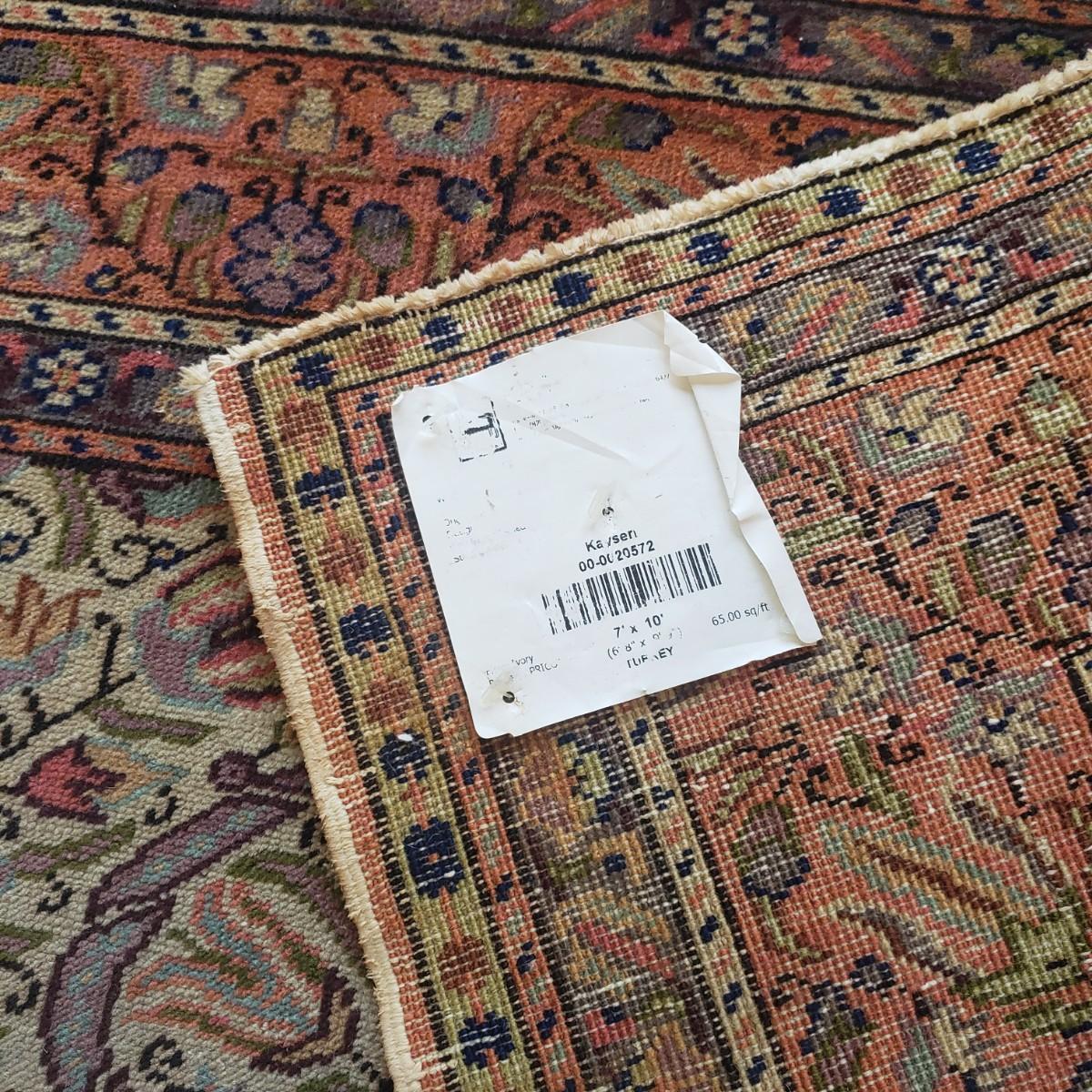 This beautiful Turkish style area measures 7' x 10H'. This rug has a spot from high traffic and the one side has some fraying, see pictures. Per the homeowner, this rug was purchased from Togar Rugs Avl in 2007.