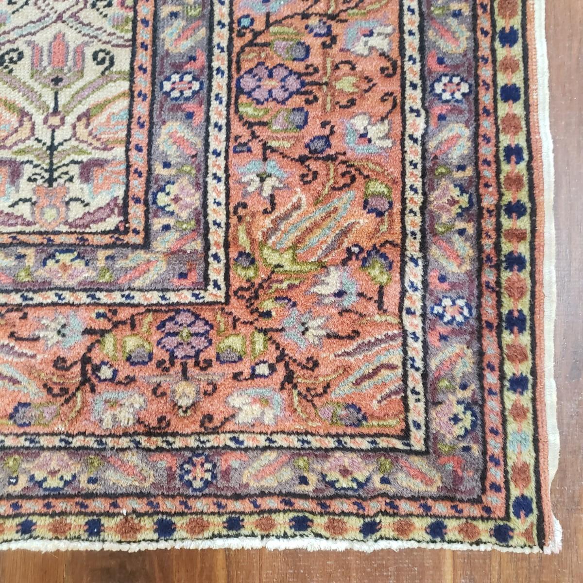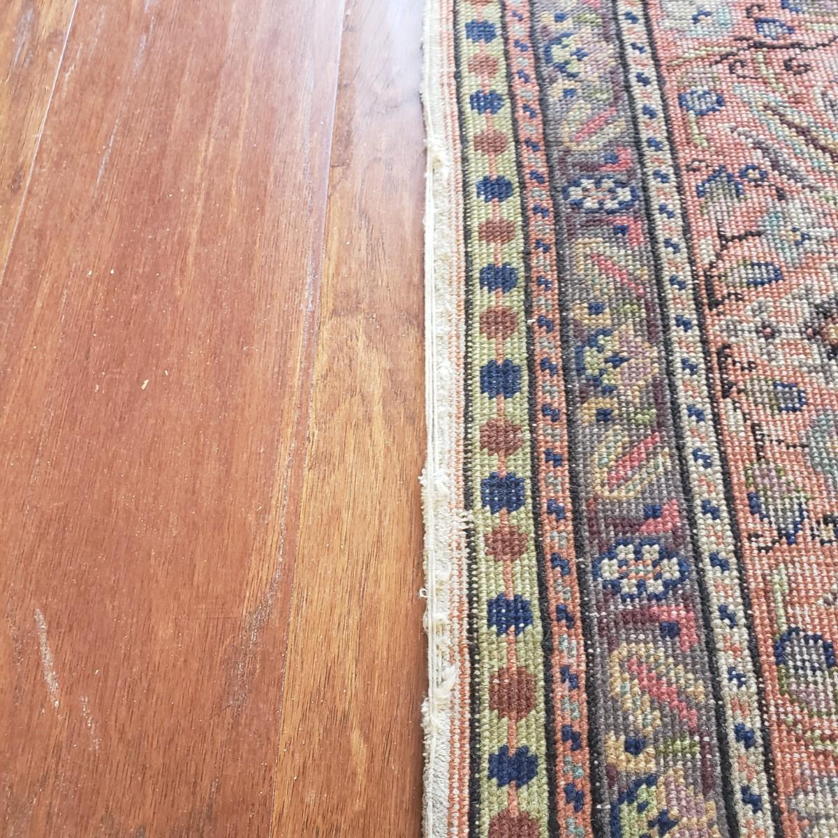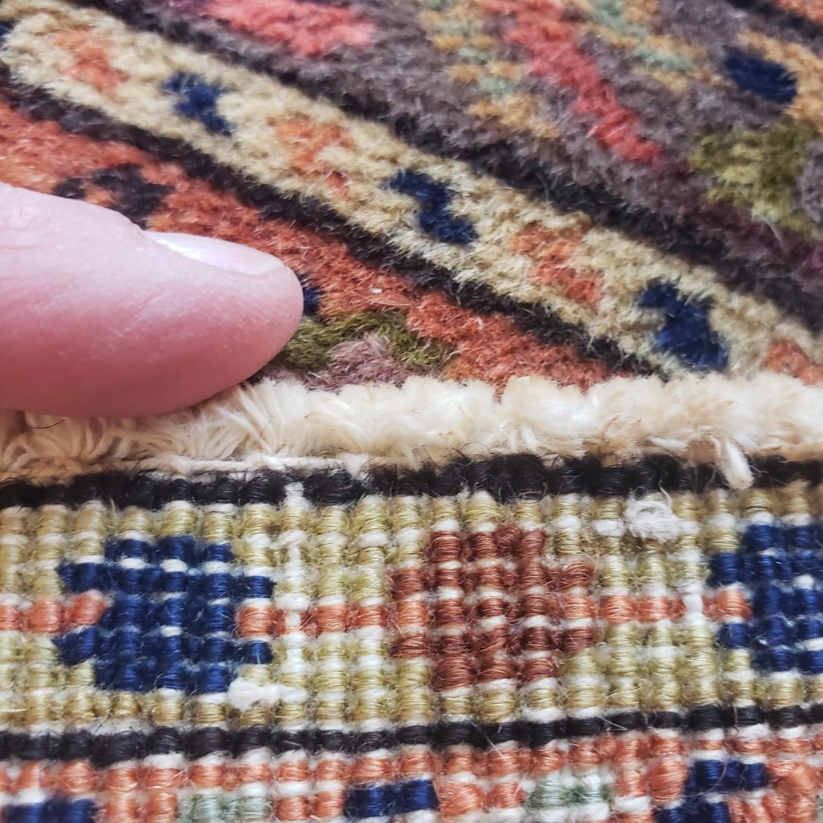 This beautiful Turkish style area measures 7' x 10H'. This rug has a spot from high traffic and the one side has some fraying, see pictures. Per the homeowner, this rug was purchased from Togar Rugs Avl in 2007.
